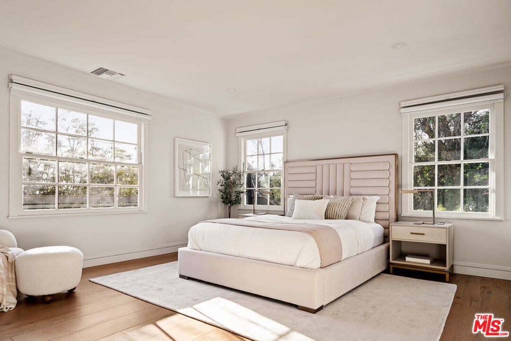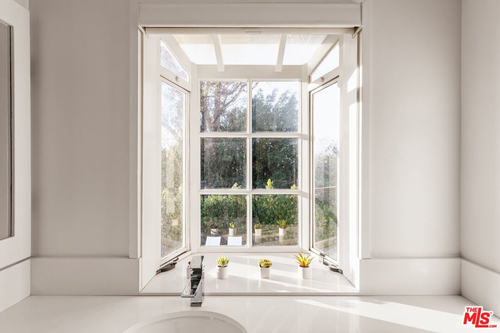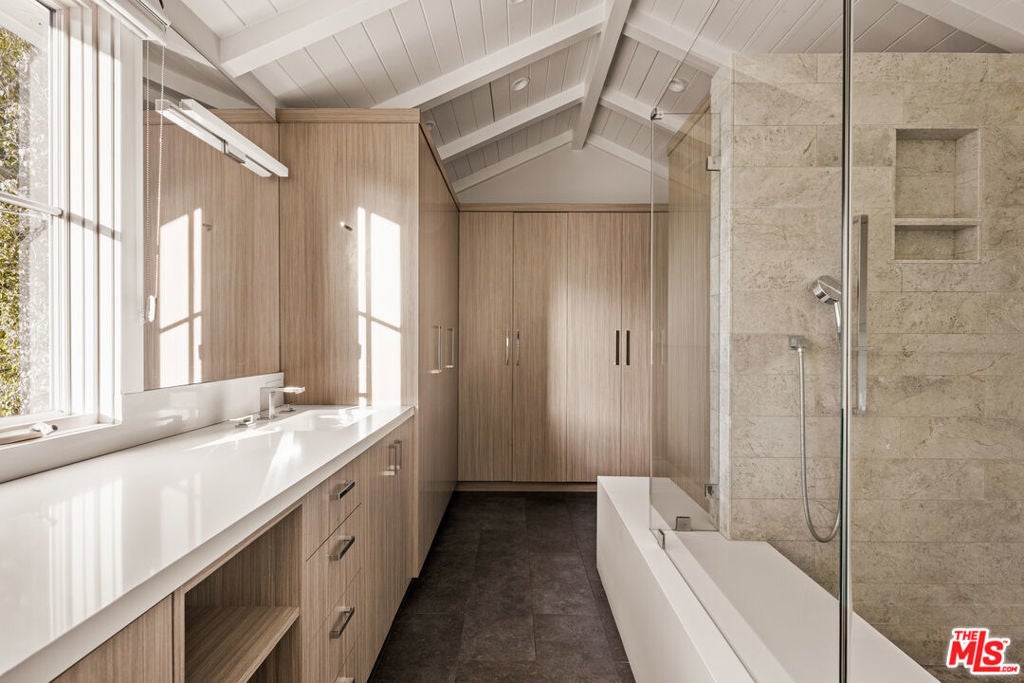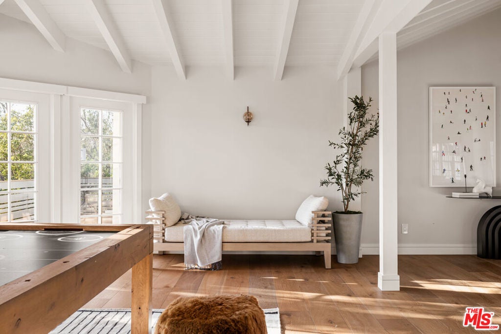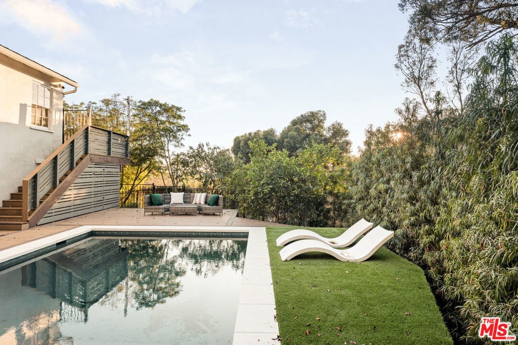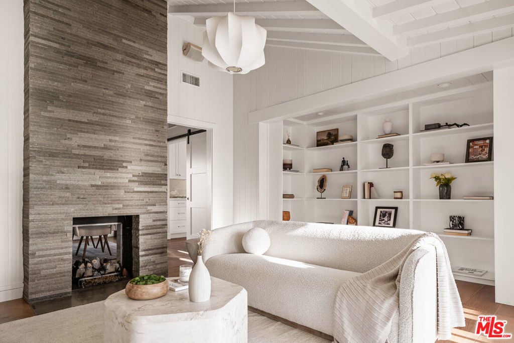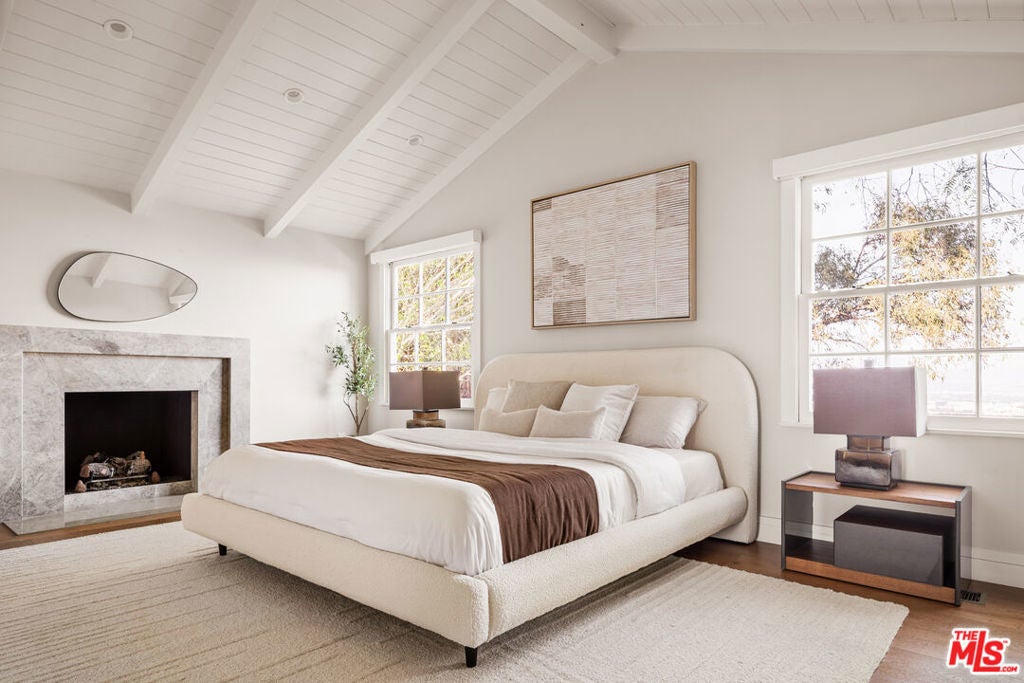This beautifully renovated Robert Byrd original is perched on a private, tree-lined street just off iconic Mulholland Drive, offering tranquility and exclusivity while still boasting awe-inspiring 180-degree city and canyon views from both sides of the home. Set on a private road shared with only three homes, this single-story East Hampton Traditional seamlessly combines timeless design with modern living. The expansive living room, featuring cathedral-beamed ceilings and a stacked stone fireplace, flows effortlessly into a light-filled family room with walls of glass that open to an inviting entertaining deck. The stunning contemporary chef's kitchen, complete with state-of-the-art appliances, custom cabinetry, and Caesarstone countertops, opens to the formal dining room, creating the perfect layout for gatherings. The spacious primary suite offers a cozy stone fireplace, a luxurious en-suite bathroom with an oversized glass-enclosed shower, and tranquil views. Additional accommodations include a generous en-suite guest room and a private en-suite maid's room or office. Renovated in 2018, the home features exposed vaulted wood-beam ceilings, hardwood floors throughout, three fireplaces, and updated major systems. Outdoor living is reimagined with a brand-new sparkling pool, multiple dining patios with a gas fire feature, a custom BBQ area, a grassy side yard, terraced hillside gardens with fruit trees, and lushly landscaped private spaces. The property also includes a detached three-car garage and a motor court with space for 6-8 vehicles. With unparalleled privacy, breathtaking views, and access to nearby hiking trails, this home is a serene oasis that truly embodies the best of California living. **Owner will only consider long term leases over one year.