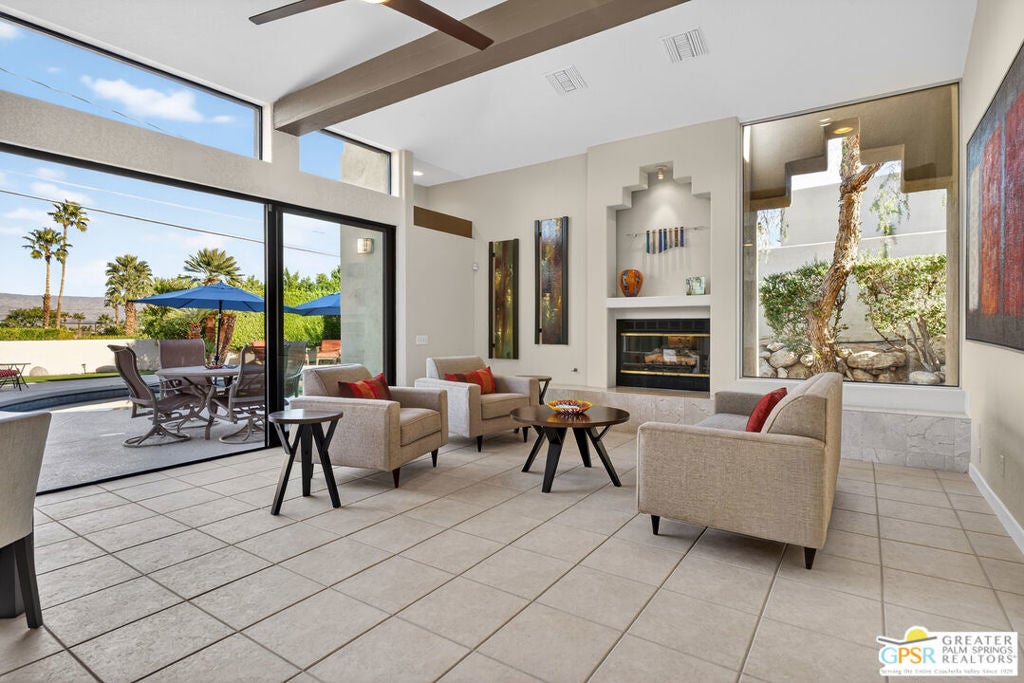 Perched in the coveted Chino Canyon / Little Tuscany hillside set in the shadow of Mt. San Jacinto this architecturally distinctive residence (designed by architect Chris Mills) delivers the Palm Springs lifestyle buyers crave: privacy, light, views, and resort-style outdoor living. As you enter, you're welcomed by an open-concept, step-down living area flooded with natural light from expansive windows framing sweeping desert and mountain panoramas. Gather by the fireplace in the spacious living room, then move seamlessly to the dining room for dinners with a view. The newly remodeled chef's kitchen is designed for both everyday ease and entertaining, featuring granite countertops, new stainless steel appliances, and custom cabinetry with plenty of workspace for everything from casual breakfasts to holiday feasts. The home offers four spacious bedrooms, including a serene primary suite with a large walk-in closet, a spa-inspired en-suite bath with dual vanities, soaking tub, and separate shower, and direct access to a private patio perfect for morning sunrises and evening breezes. Two additional bedrooms are thoughtfully placed on the opposite side of the home with a full bath between them for comfort and privacy, while a convenient powder room serves guests. A study/4th bedroom on the main level plus a separate office/hobby or craft space adds flexibility for today's work-from-home lifestyle. Step outside to your private desert oasis: a sparkling pool and spa, multiple patios for lounging and al fresco dining, and a beautifully landscaped yard with desert-friendly plantings that enhance the tranquil ambiance. Enjoy quiet moments on the patio off the primary suite, unwind in the secluded guest patio retreat, or host friends under the stars with dramatic mountain backdrops. With 38 solar panels, you'll also enjoy energy-efficient living in the desert. Hidden away from the bustle, Chino Canyon is an elegant neighborhood known for luxury hillside estates, boulder-strewn natural terrain, and a long-running appreciation for standout architecture near the Palm Springs Aerial Tramway area, and just minutes to boutique shopping, fine dining, world-class golf, hiking trails, and the vibrant Palm Springs arts and entertainment scene. Don't miss your chance to own this exceptional Chino Canyon retreat. Schedule a private tour today and experience the views, privacy, and lifestyle for yourself.