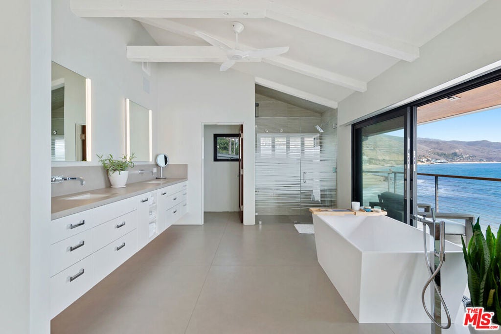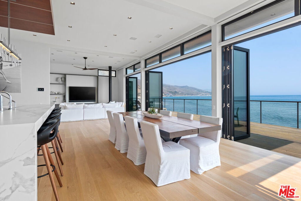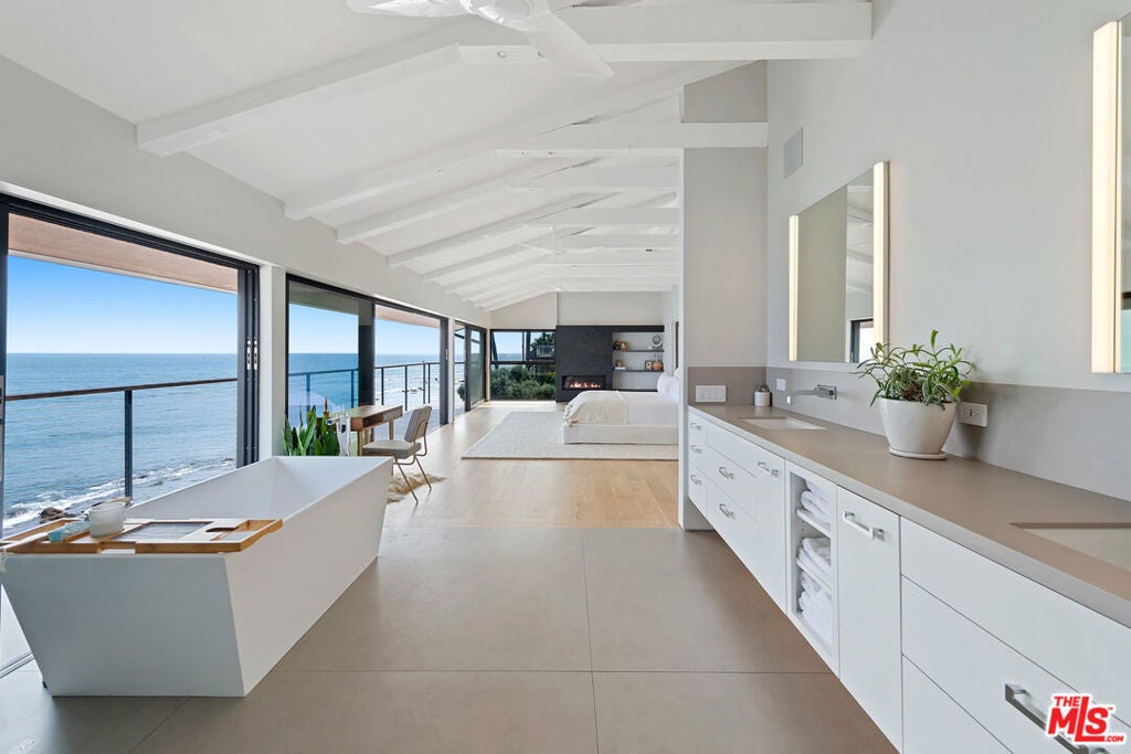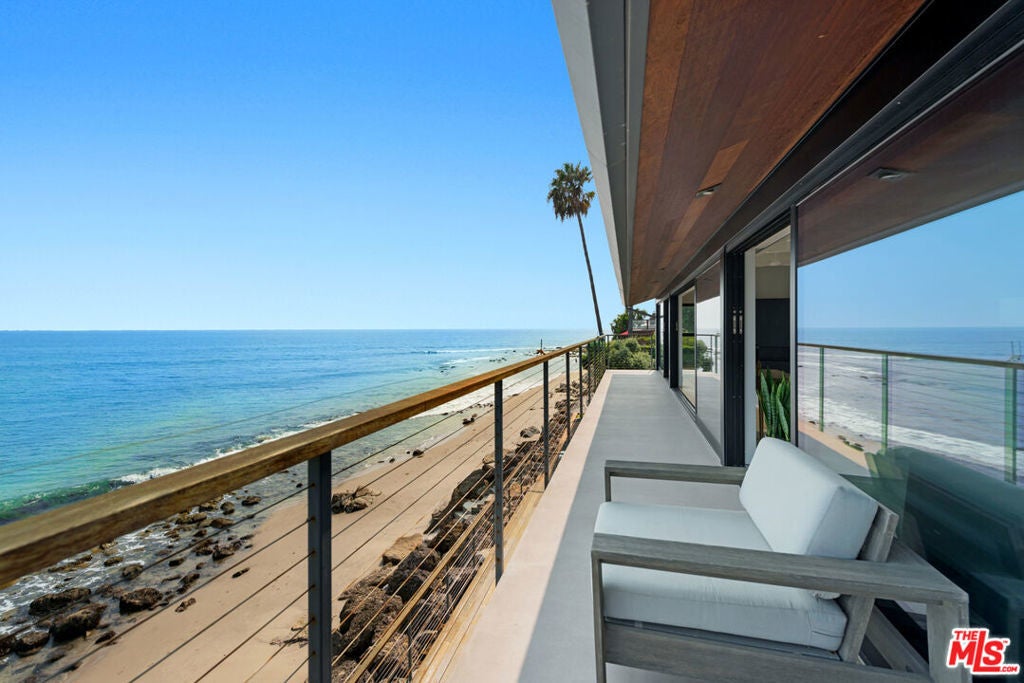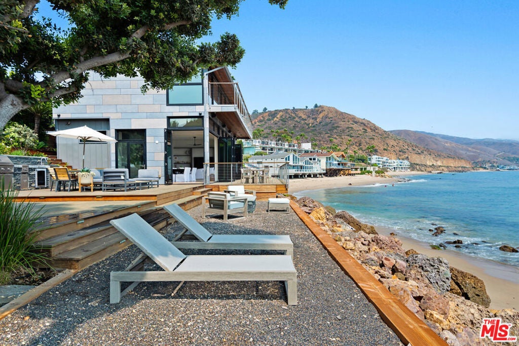 Updated contemporary on a double lot with rare 100 ocean frontage and a large landscaped lawn with hammock and a wood-and-glass sauna, perfect for lounging, dining, or working, and a detached guest room with a queen-sized bed and a 1/2 bathroom. A luminous entry hall to the surf break and non-stop ocean panorama, this stunning beach home with seamless indoor-outdoor flow, sensational views, and gorgeous open-plan design has everything you could possibly want for living the Malibu lifestyle. A private haven that is ideal for tranquil relaxation and sophisticated entertaining on a gorgeous cove with direct beach access, this special corner of paradise features wraparound decks, exceptionally high ceilings, skylights, enormous walls of glass facing onto the views, and beautiful wood floors. Step down from the entry to a sleek and sparkling great room with living, dining, and kitchen areas that open onto a beachfront deck through huge glass accordion doors, and to the entertainer's deck at the side of the house. The living room area has built-in shelving, a ceiling fan, an enormous flat screen, and a chic hanging fireplace in the corner. The open kitchen has a large island with bar seating, marble countertops, quality appliances, and temperature-controlled wine storage. There is one bedroom and a bath on the entry-level and two ocean-view, en-suite bedrooms, and a laundry room on the upper floor. The majestic master suite is enormous, with exposed beams, two ceiling fans, a fireplace, built-in shelves, a huge custom closet, a spa-style bath, and a wall of glass opening onto a full-width oceanfront balcony with ample room for seating and star-gazing. Accessible from the kitchen and from the lower-level deck, the entertainer's deck is furnished with a beautiful stone-clad outdoor kitchen and barbecue, a Jacuzzi brand spa, and ample seating and dining. Two steps down from the deck is a beachfront gravel area with additional seating, a fire pit, and steps leading to the beach. This amazing shoreline property also has air conditioning, automatic window shades, a speaker system, a carport, under-deck storage for surfboards and bikes, and breathtaking views over the mountains, coastline, ocean, and islands.