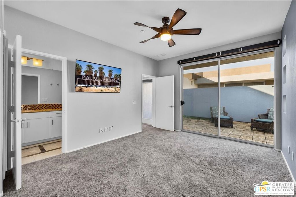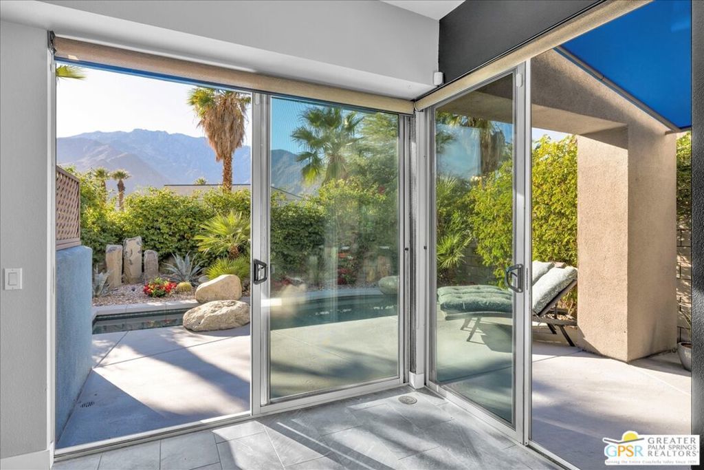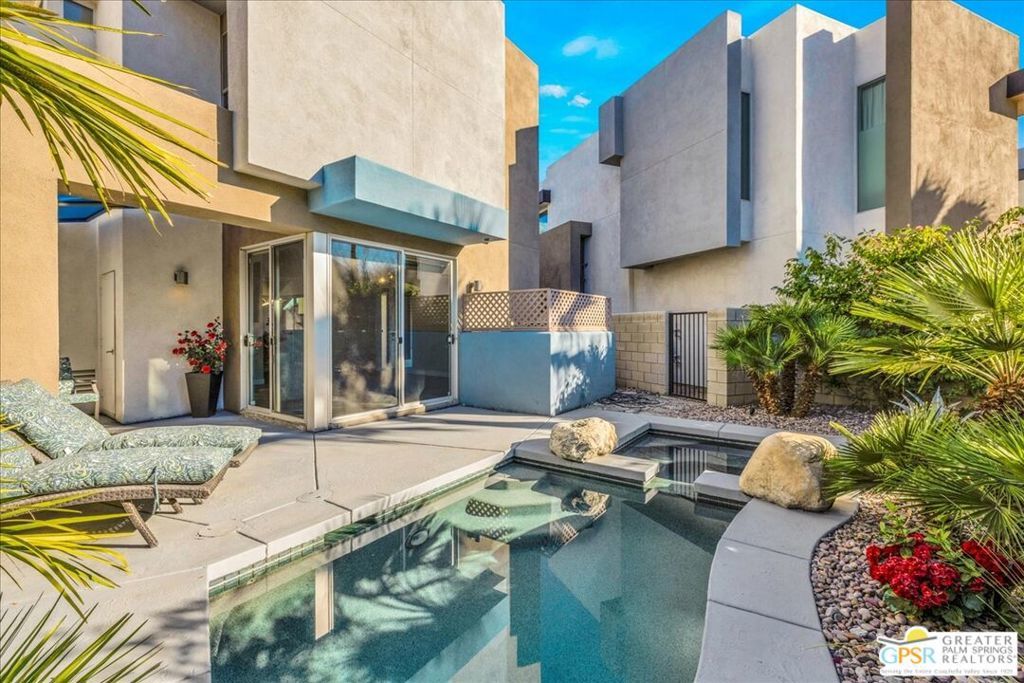 Modern Palm Springs Retreat with Private Pool & Spa and Mountain Views. Welcome to this stylish Palm Springs getaway, ideally located just minutes from downtown dining, shopping, and nightlife within the newer gated community of Palermo. Designed for effortless desert living, this sought-after floorplan offers two ensuite bedrooms, two-and-a-half baths, and an attached one-car garage - perfect as a full-time residence, second home, or vacation escape. Designer finishes elevate the home throughout, including high-end ceiling fans, custom window treatments, and thoughtfully curated details. As a perimeter unit, the property enjoys enhanced privacy and a beautifully landscaped backyard complete with a private pool and spa framed by mountain views - your own serene outdoor oasis. Inside, the updated great room features sleek 12x24 tile flooring, a custom fireplace with digital controls, and dual sliding glass doors that flood the space with natural light and showcase the surrounding scenery. The modern kitchen is both functional and striking, highlighted by quartz countertops, metallic tile backsplash, crisp white flat-panel cabinetry, stainless steel appliances, and a peninsula island with ample seating accented by contemporary pendant lighting. Upstairs, two spacious primary suites provide comfort and privacy, each with a custom-designed bathroom featuring distinctive stone countertops, designer tilework, and upgraded lighting. Generous closet space and convenient access to a generous rooftop deck and stackable washer and dryer complete the upper level. Additional features include sealed garage floors and an EV charger! Residents of Palermo enjoy resort-style amenities including a fitness center, community pools and spas, and a billiards room. HOA dues conveniently cover water, trash, exterior maintenance, and common-area amenities - making ownership easy and carefree. This is modern Palm Springs living at its best - private, stylish, and perfectly located in Palm Springs.
