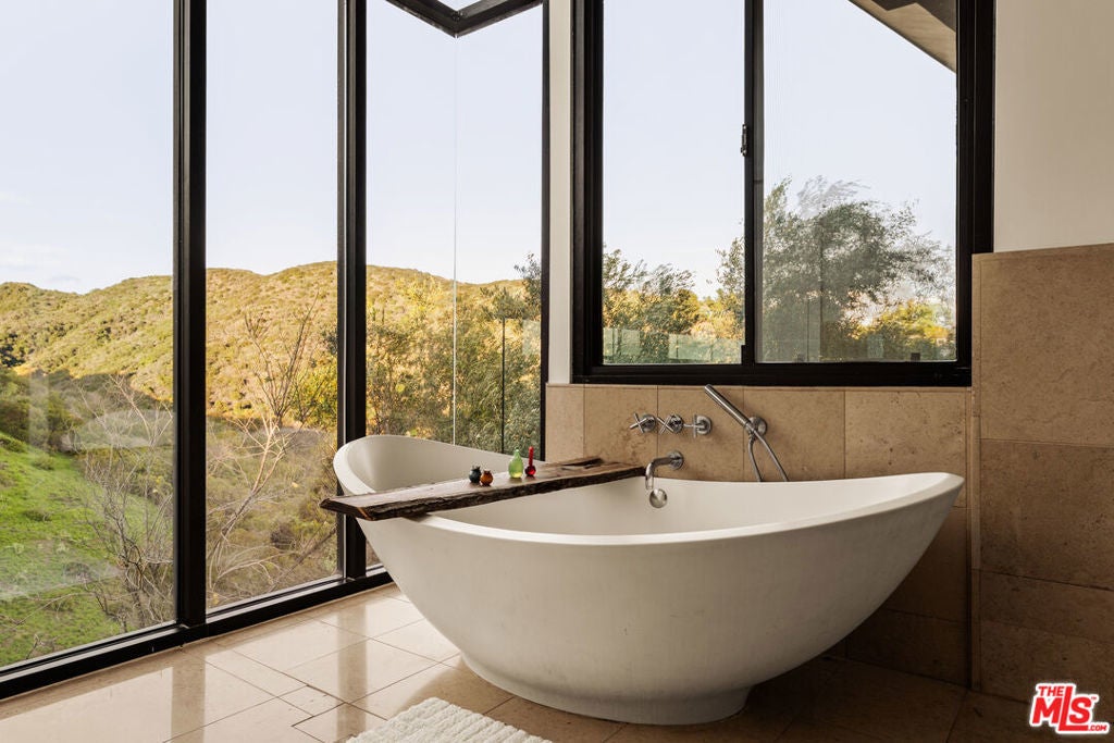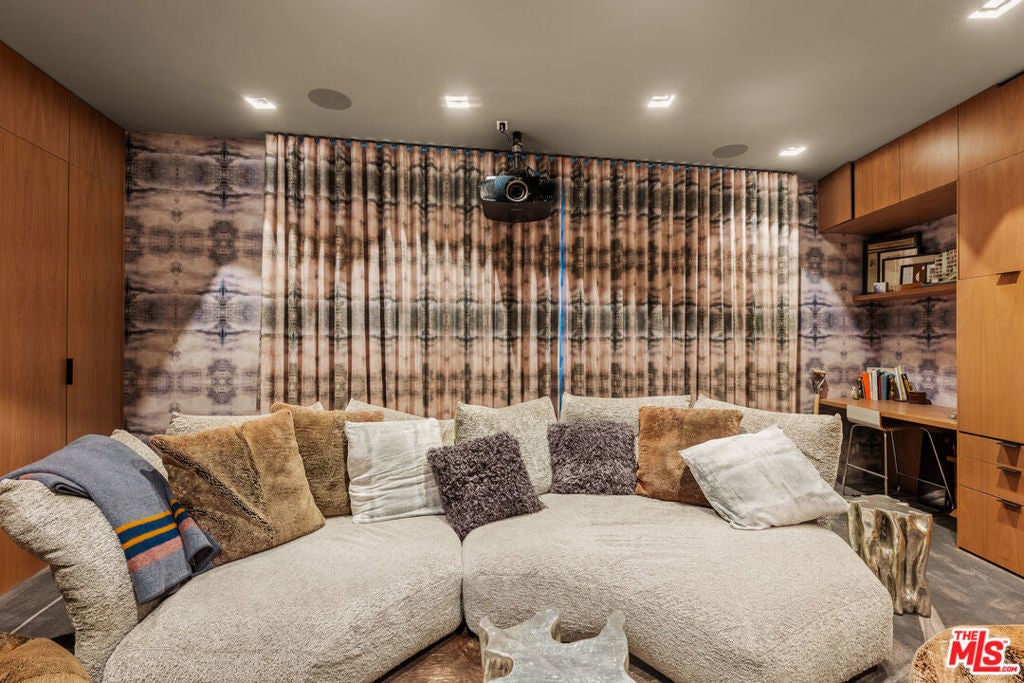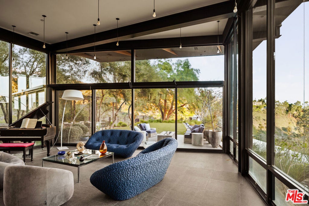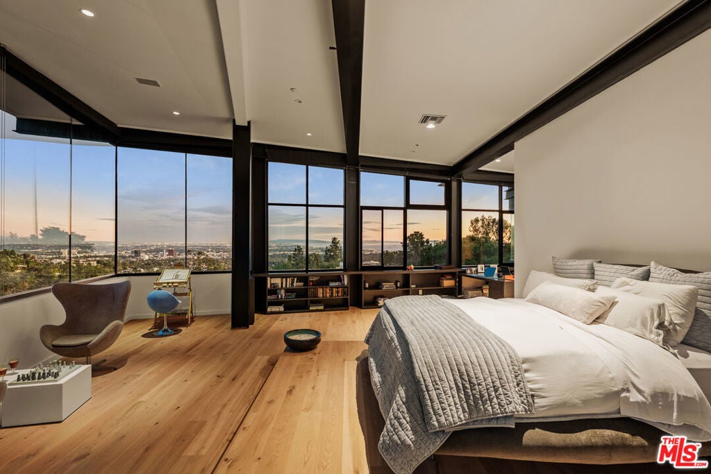 Designed and built as the personal residence of Hagy Belzberg, FAIA, this exceptional 5,000 square foot architectural home is a rare expression of a master architect building for himself. Belzberg's work, recognized internationally through decades of award-winning residential, cultural, and hospitality projects, has long explored the intersection of experimentation and livability. That philosophy is fully realized here, in a home conceived and built for personal use, free from the constraints of speculation, where every decision reflects the priorities of an architect designing for his own life. Set privately and securely, in a gated 4-home enclave, on a 2- acre lot with sweeping city and canyon views, the residence unfolds as a sequence of carefully calibrated spaces defined by steel framing, warm wood surfaces, and expansive walls of glass. Light, proportion, and circulation are methodically considered, creating a home that is both aesthetically singular and deeply comfortable. The main living level is conceived for both everyday living and sophisticated entertaining. Floor-to-ceiling walls of glass dissolve the boundaries between interior and exterior, opening to terraces, gardens, and a dramatic infinity-edge pool that appears to float above the landscape. Living and dining spaces flow effortlessly into a design-forward kitchen with custom millwork, professional-grade appliances, and generous storage integrated seamlessly into the architecture. Throughout the home, bespoke detailing reflects the sensibility of an architect's own residence: integrated shelving and libraries, curated sightlines, and thoughtful transitions between public and private zones. A private media room offers a cinematic retreat, while a dedicated gym provides a discreet wellness space, and a 3-station library/study area invites educational and occupational advancement. The primary suite is a serene sanctuary, framed by panoramic views and anchored by warm materials and clean lines. A spa-like bath, generous closets, and a sense of calm separation complete the experience. The three additional bedroom suites maintain the same level of design achievement and comfort. The outdoor spaces are equally intentional: layered terraces, intimate garden moments, and seating areas designed for both gathering and solitude. As day turns to dusk, the home glows from within, the architecture revealing its structure and rhythm against the evening sky. More than a residence, this is a self-authored work of architecture; a home conceived without compromise, where innovation serves livability, and design is meant to be inhabited, not merely admired. Located moments away from the coveted dining, nightlife and shopping on San Vicente and in Brentwood Country Mart and within some of the city's most highly acclaimed public schools (Kenter Canyon Elementary Charter, Paul Revere Charter Middle School and Palisades Charter High School).