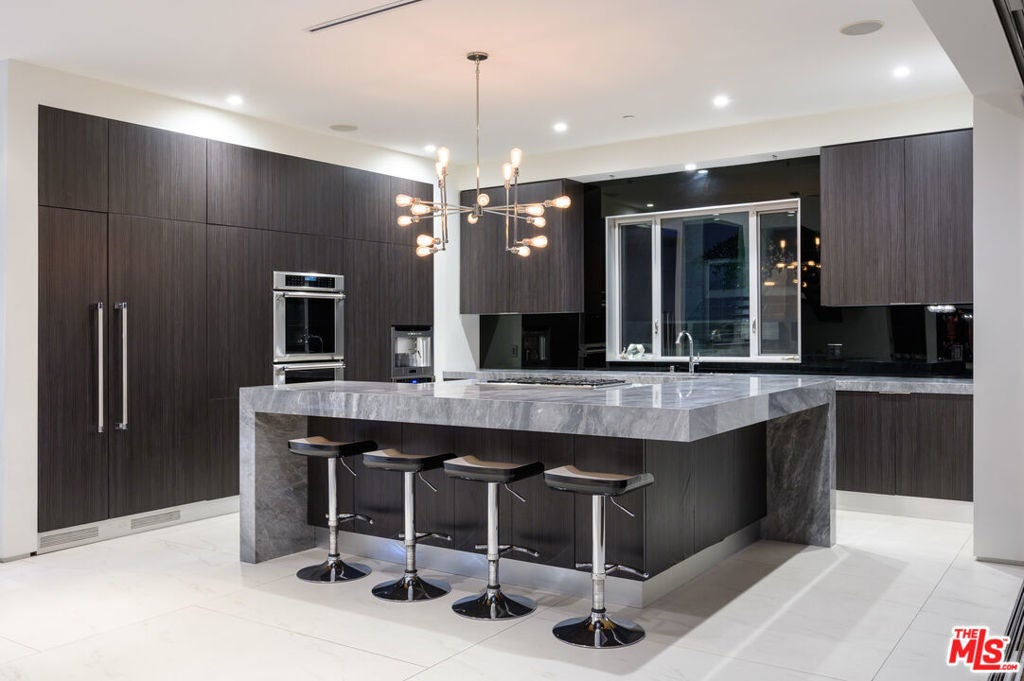 Indoor and outdoor living merge gracefully into one at this modern Beverly Grove Villa. Privacy abounds at this Smart Home beyond the gated entrance with tall foliage. The home showcases several beautiful living spaces and 5 bedroom suites each with their own private patios. The modern interior is bathed in natural light throughout. The dramatic two-story living room is bright, open and inviting with the vertical fireplace reaching up to the second level. The chef's kitchen with top of the line appliances and a waterfall island offers views of the pool, spa and grass area through the walls of glass that vanish. A floating staircase leads upstairs to the bedroom sanctuaries. The primary suite showcases a stunning fireplace, luxurious bathroom with a frameless glass shower and soaking tub, and a spacious walk in closet.