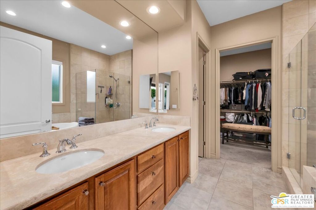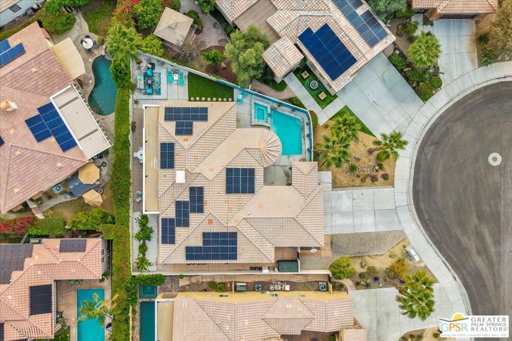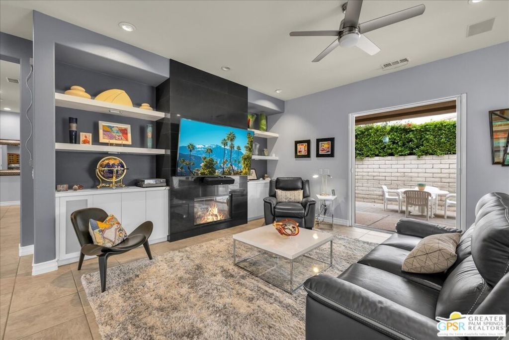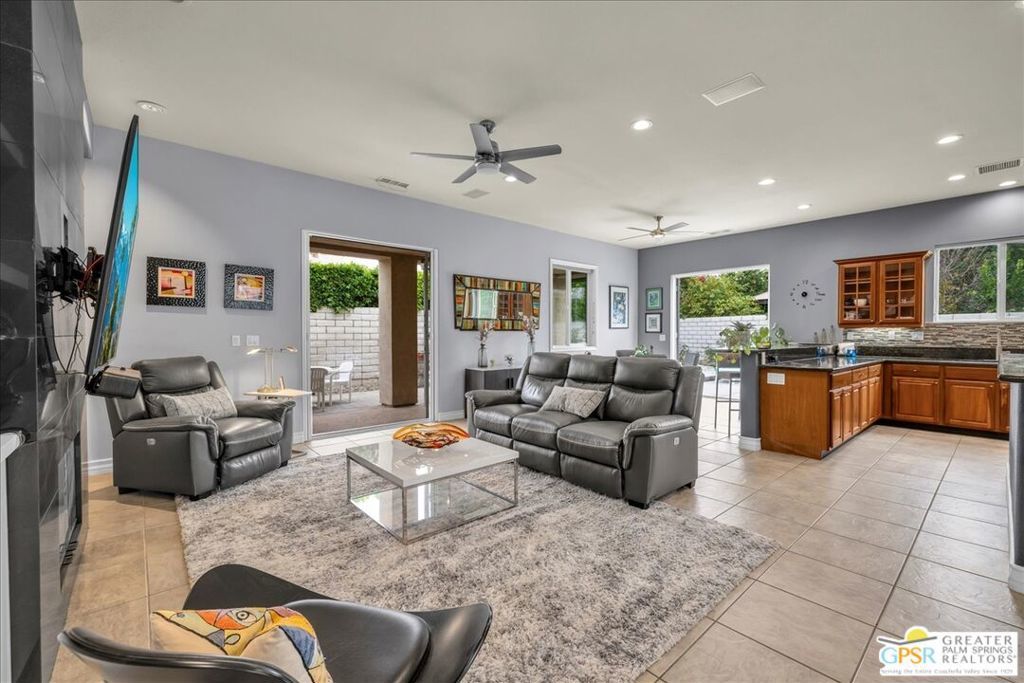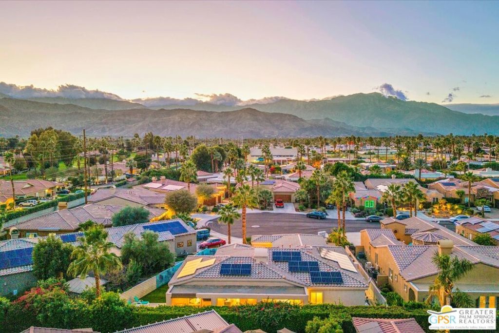 Elegant Cul-de-Sac Retreat with Pool, Spa & Mountain Views! Tucked away on a quiet cul-de-sac in the heart of Palm Desert, this expansive three-bedroom, two-and-a-half-bath residence offers refined desert living with breathtaking mountain views, generous entertaining spaces, and seamless indoor-outdoor flow. Inside, the home is beautifully appointed with 14" tile flooring, luxury vinyl plank in select areas, cellular window treatments, and upgraded LED lighting throughout. The expansive open kitchen is designed for both everyday living and entertaining, featuring granite countertops, tile backsplash, high-end stainless steel appliances, a wet bar with wine fridge, and a breakfast bar with ample seating. The great room is warm and inviting, anchored by a tiled gas fireplace with custom built-in cabinetry and shelving - perfect for housing audiovisual equipment and enhanced by built-in rear-channel speakers. Adjacent to the living area, a versatile flex space currently serves as a game room but easily transitions into a formal dining or additional seating area, all while capturing stunning mountain views. An informal dining area just off the breakfast bar features glass French doors that open to an expansive side yard with custom tiered hardscape and artificial turf, creating a tranquil setting framed by the surrounding mountains. The primary suite is a true retreat, offering updated vinyl plank flooring, recessed LED lighting, a stylish fandelier, and glass French doors with invisible screens that open directly to the lanai - perfect for enjoying the desert lifestyle year-round. The spa-inspired ensuite bath features dual sinks with stone countertops, a glass-enclosed shower with bench, a jetted soaking tub, and a spacious walk-in closet. Two additional bedrooms are generously sized and filled with natural light, sharing a well-appointed pass-through bathroom with dual sinks and a shower/tub combination. Outdoors, the property truly shines. The expansive lanai and extended patio create multiple areas for relaxing and entertaining, while the yard wraps around to the front of the home where a sparkling pool and spa await - set against dramatic mountain views that define desert living at its finest. Additional highlights include leased solar ($282 mo), a large laundry room, newer HVAC system, and an oversized, insulated, climate-controlled 2.5-car garage with epoxy-sealed floors and a 240v outlet for an EV charger. Ideally located near Albertsons and Bristol Farms shopping centers, this home offers convenient access to grocery stores, dining, and everyday amenities. This is a rare opportunity to enjoy space, comfort, and stunning scenery in a prime Palm Desert location.