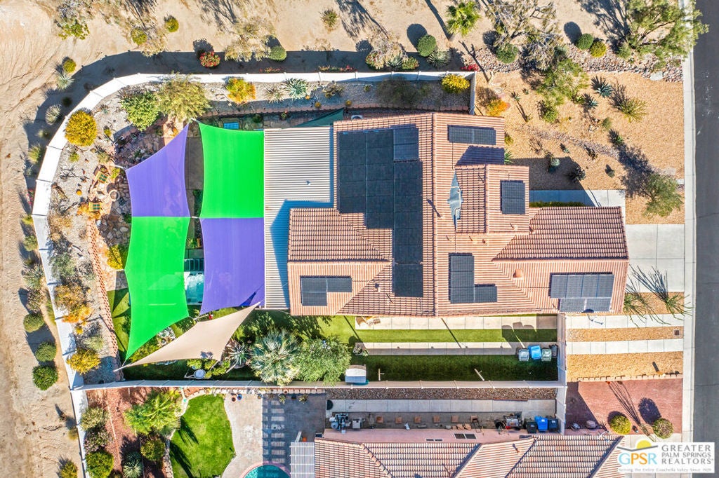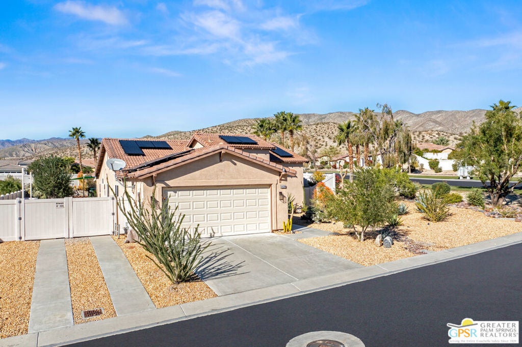 Updated corner-lot home located in the 55+ section of Mountain View Country Estates with amazing views and a large lushly landscaped private backyard. Granite countertops, stainless steel appliances, and upgraded cabinets outfit the kitchen. One bedroom has wall-to-wall built-ins with a Murphy bed. The oversized backyard features meandering paths, mature landscaping with citrus and native plantings, and an above-ground swim/spa, complete with fountains and all exercise attachments. The side yard accommodates an RV and has a 220v hookup. The seller has an almost nonexistent electric bill with 36 solar panels: 18 owned and 18 leased @ $150/mo. Desert living at its finest! Why aren't you living here yet?