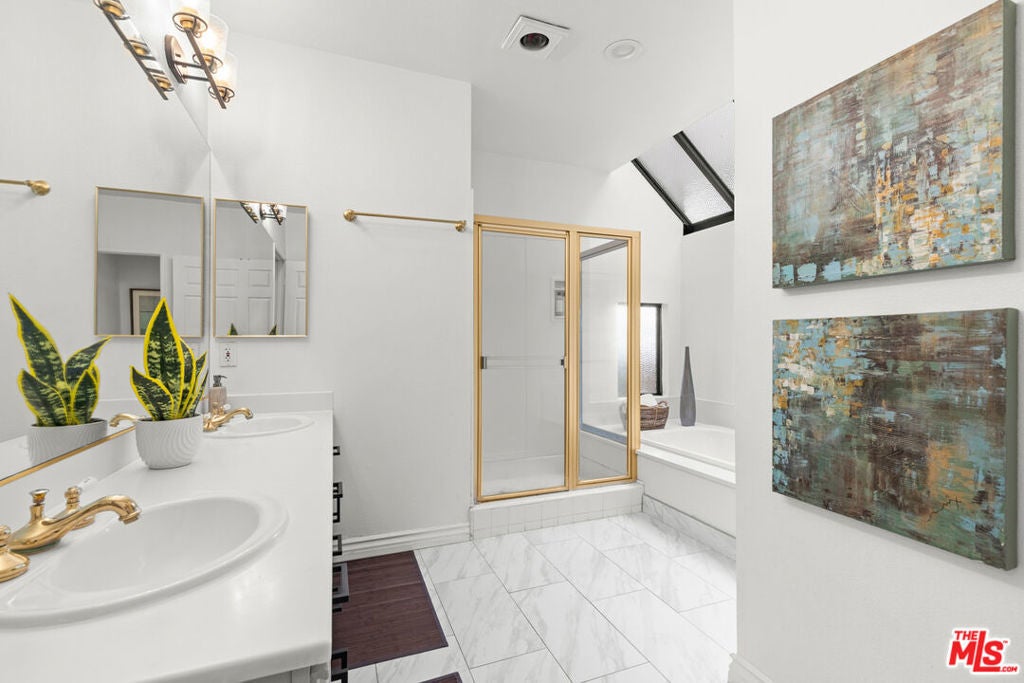 Spacious 2 bed, 2.5 bath townhome-style condo in prime Brentwood location, just minutes away from restaurants, coffee shops and retail on trendy San Vicente Blvd. Located in a quiet corner of this contemporary condominium building, with lovely center courtyard pool surrounded by lush mature landscaping. As you enter you are greeted with the high ceilings and tons of natural light that make this home different from most condominiums. There is a powder room perfectly situated at the entry before you step down into the spacious living room with wood floors, soaring ceilings, romantic fireplace and wet bar, perfect for entertaining. The dining area opens to a patio to capture the cool breeze and is perfectly situated just off the kitchen. The laundry room completes the lower level. The upper level comprises the oversized primary suite with a second fireplace, large walk-in closet, and a spa-like primary bath with dual sinks, walk in shower, separate tub and skylights overhead. The second bedroom, full bathroom and loft area, which can be used as a home office, complete the upper level. Brand new carpets just installed on the upper level. Other building features include controlled access, airy courtyard walkways, 2 single parking spaces, additional storage and 11 guest parking spaces.