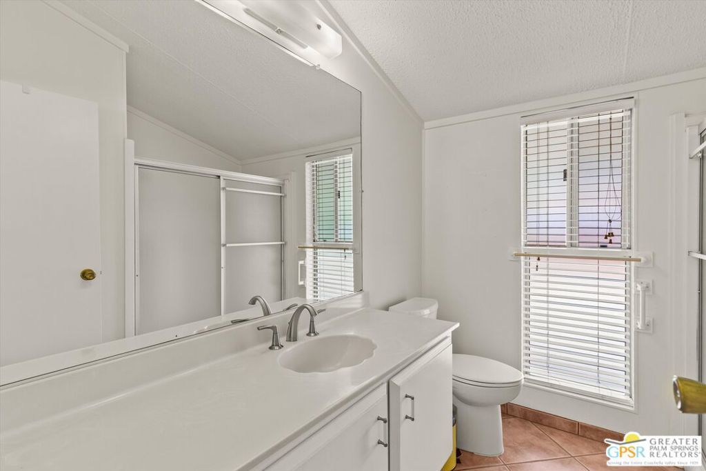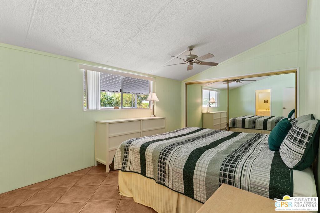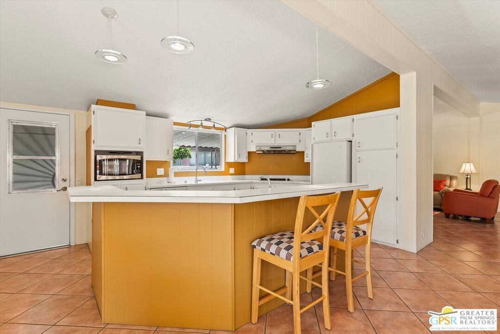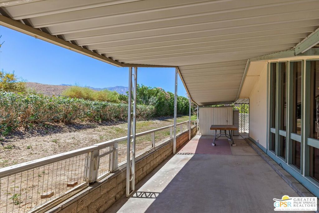 Dramatic mountain views enhance this open and light home behind the guarded entrance of Cathedral City's beautiful Date Palm Country Club. A free-flowing floorplan makes entertaining and daily living equally enjoyable in the single-level design, which features two bedrooms and two baths in approximately 1,536 square feet. A private side entry provides a welcoming introduction, leading to a spacious living room and a large dining room with built-in cabinetry and glass display shelving. Wrapped in floor-to-ceiling windows, the sitting room joins a large kitchen to create a great room-style setting with gorgeous views straight out to Mount San Jacinto. An island with bar-height seating takes center stage in the kitchen, where chefs of all skill levels will appreciate solid-surface countertops, white cabinetry with a built-in pantry, ample prep space, and a full suite of appliances including a gas cooktop. Bedrooms are comfortable and private, with the primary suite highlighted by an ensuite bath with two sinks, a soaking tub and separate shower. Vaulted ceilings lend an airy ambiance in every room of the home, which is appointed handsome tile flooring throughout, ceiling fans and mirrored wardrobe doors. Outdoors, a large wraparound patio leads to a backyard with some of the best mountain views in the community. Enjoy a variety of mature fruit trees, a carport and a spacious shed/workshop. A popular choice among active adults 55 and better, Date Palm Country Club presents a carefree resort environment that features an 18-hole golf course, pro shop, large newly remodeled clubhouse, restaurant, three pools and spas, tennis and pickleball courts, a fitness center, dog park, library/meeting room, lush greenbelts and scenic lakes. The theaters, restaurants, shops and park in Cathedral City's revitalized downtown are moments from home, and Palm Springs and Rancho Mirage are just minutes away.