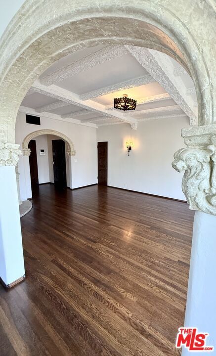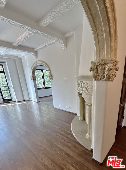 • Interior FeaturesBeamed Ceilings, Breakfast Bar, Crown Molding, High Ceilings, Intercom