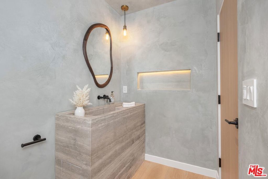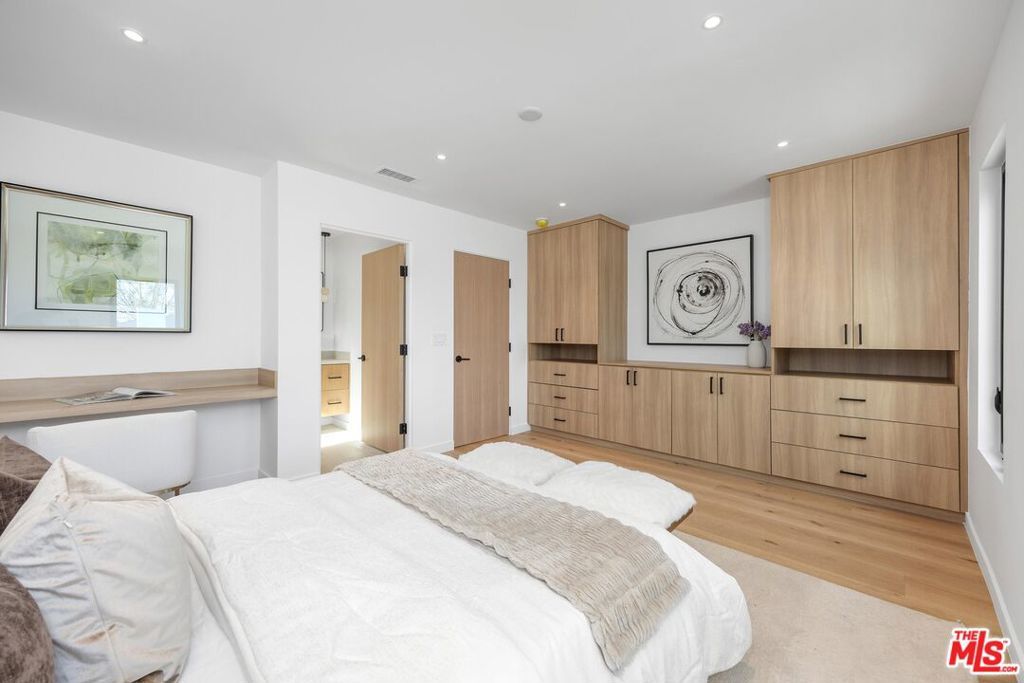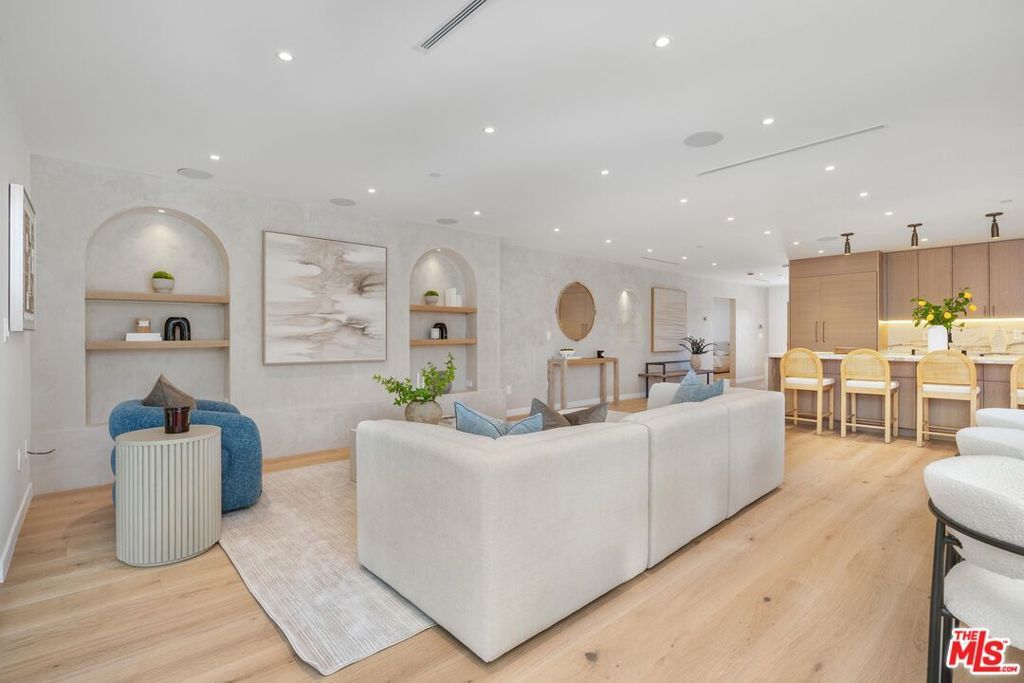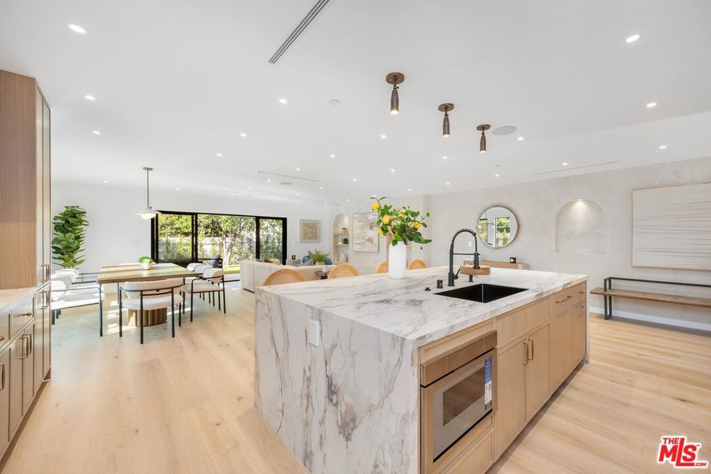 Located in a highly desirable pocket of Sherman Oaks, this beautifully reimagined single-level residence blends refined design with effortless livability. Offering three bedrooms and three and a half bathrooms, the home unfolds across a generous open floor plan ideal for both everyday comfort and elevated entertaining. Upon entry, oak hardwood floors, abundant natural light, and Marmorino Tintoretto plaster walls create an immediate sense of warmth and sophistication. At the heart of the home, the gourmet kitchen is a true showpiece, featuring premium Thermador appliances, porcelain countertops, sleek light-toned cabinetry, and an oversized island with bar seating, perfect for casual meals or gathering with guests. The kitchen flows seamlessly into the living and dining areas, where expansive sliding glass doors invite the outdoors in and open to the backyard retreat. Just off the kitchen, a stylish powder bath with a natural silver travertine vanity adds convenience for hosting.The main hallway leads to a serene primary suite, complete with a spacious walk-in closet, direct backyard access, and a spa-inspired ensuite bath featuring a floating double vanity, a large step-in shower with built-in bench, and a soaking tub. Two additional bedrooms near the entry each offer their own ensuite baths with stone-topped floating vanities and luxe step-in showers. A thoughtfully designed laundry area with additional storage completes the interior. Designed for year-round enjoyment, the lush backyard captures the essence of California living with a covered patio, a charming lemon tree, and ample space for entertaining under the stars. Ideally located moments from Westfield Fashion Square and the renowned shops and restaurants of Ventura Boulevard, this home seamlessly blends contemporary luxury with everyday convenience.