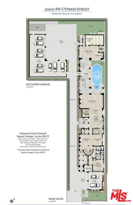 This private estate boasts impeccable craftsmanship and design on more than half an acre of flat land. Set behind private gates, this compound-like residence offers more than 18,200 sq. ft. of living space (including a 3,500 sq. ft., 11-car garage), five en-suite bedrooms, 10 baths, a soundproof home theater with memory foam carpet, a game room, office, wine cellar, an attached guest house with private entry, a spacious home gym, and much more. No expense was spared in this refined custom home, featuring premium finishes throughout, including limestone flooring, 12-ft. wood-beam ceilings, and palatial corridors. The gourmet kitchen is replete with state-of-the-art appliances, leathered granite countertops, a butler's pantry, and two kitchen islands with scratch- and stain-resistant Kedra countertops. The resort-style backyard showcases a pool/spa, outdoor shower, and a massive loggia with lounge areas, a bar, and a 1,500 sq. ft. covered outdoor kitchen featuring a built-in BBQ with a rotisserie, warming drawer, oversized glass refrigerator, nugget ice machine, and more. The 1,300 sq. ft. primary suite occupies its own wing, featuring an office or nursery space, a boutique-style walk-in closet, a spa bathroom, and a fireplace. Conveniently located on the upper level is a full-sized laundry room with dual washer and dryer units and a dog washing station; a third laundry set is situated in the lower-level butler's pantry. The entire main house is wired to a generator for power outages and is equipped with a Falsken water filtration system. It features built-in audio and an extensive video surveillance and monitoring system. This exclusive address offers a rare opportunity for those seeking privacy, opulence, and space, just minutes from the best destinations in Newport Beach.