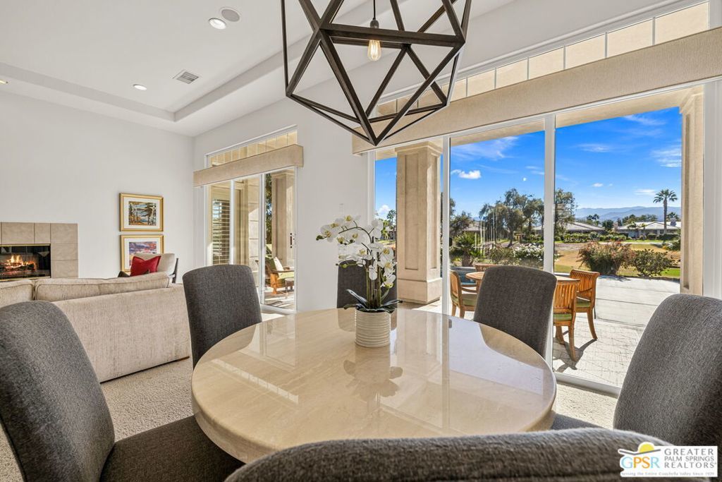 South-facing views and resort-style living come together in this highly desirable Santa Rosa floorplan overlooking the 2nd hole of the Mission Hills North Gary Player Signature Course. Located behind the gates of Mira Vista, this 3 bed plus den/office, 3.5 bath residence offers nearby recreation including tennis, pickleball, and a community pool just down the street, along with golf privileges and social gatherings at the Lakeview Grill. Built by Toll Brothers and set on a premium lot, the home delivers tall ceilings and light-filled entertaining spaces framed by sweeping views of the fairway, Mt. San Jacinto, and the Santa Rosa Mountains. A formal entry welcomes you through a private courtyard and immediately reveals the home's impressive sightlines. The south-facing living room features a gas fireplace, wet bar, and direct access to the backyard, while the adjacent family room with built-in media center (currently enjoyed as a dining space) extends those wide, uninterrupted views. The expansive kitchen is designed for both daily living and entertaining, offering granite countertops, built-in appliance suite, long detached island with gas cooktop, walk-in pantry, and casual dining area all with picturesque outlooks. The south-facing backyard is a true highlight, complete with covered patio, pool and spa, gas firepit, and dramatic golf course and mountain vistas. The Primary Ensuite enjoys direct backyard access, a generous walk-in closet, and a private bath with dual sinks, walk-in shower, and separate soaking tub. Two Junior Ensuites each offer their own private bath and share a separate family room ideal for guests or extended stays. A separate den/office overlooks the courtyard and sits near a convenient powder bath. Inside laundry and an attached two-car plus golf cart garage complete the home. A rare blend of views, space, and lifestyle perfect for full-time living or a refined desert retreat.
