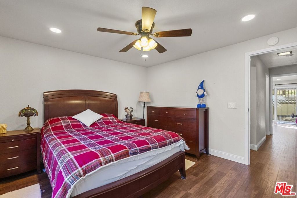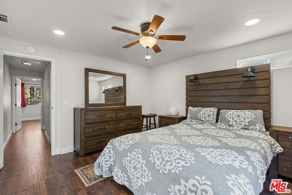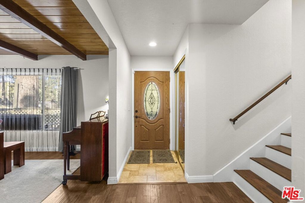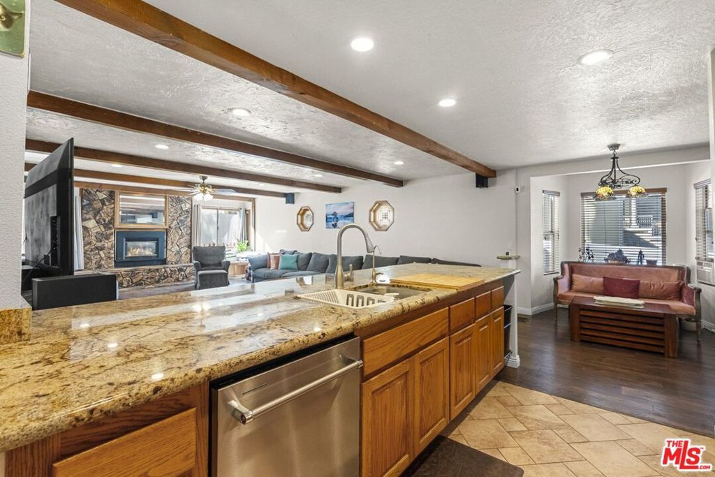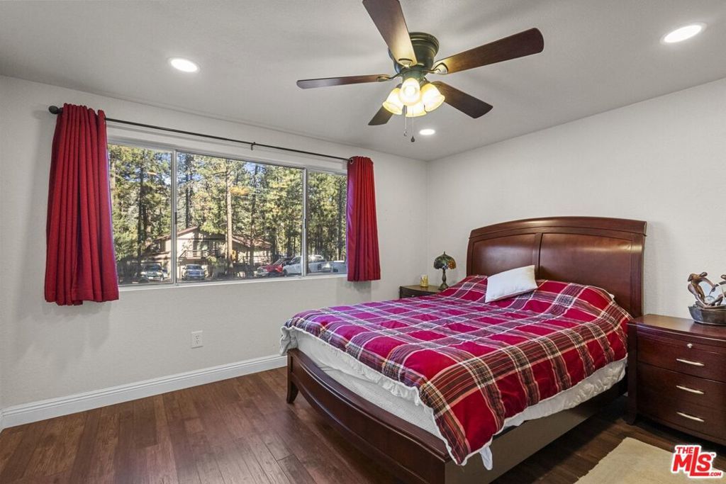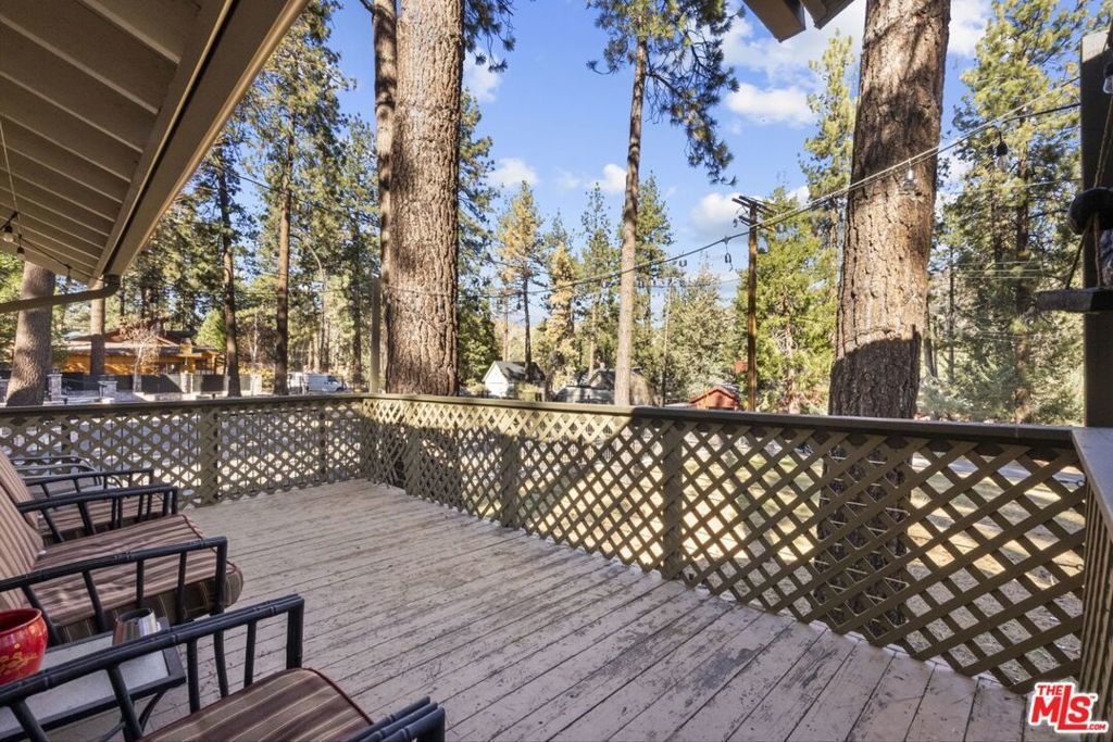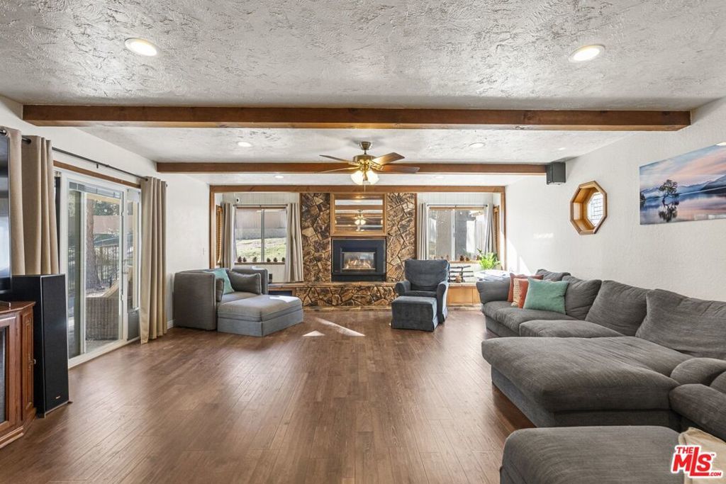 Gorgeous Wrightwood retreat located just minutes from the Country Club, the Village, and Mountain High Ski Resort. Situated on an expansive 16,500 sq ft tree-filled lot, this updated 2,474 sq ft home offers 4 bedrooms, 2.5 baths, and multiple living spaces ideal for relaxing or entertaining. The open floor plan features a bright living room, a family/dining room with a wood-burning fireplace insert, and a beautifully updated kitchen with granite counters, newer stainless steel appliances, under-cabinet lighting, and a large peninsula bar. The living room showcases recessed lighting, upgraded windows, a dining nook, and a sliding door leading to the sunny backyard deck. The primary suite includes vaulted ceilings, tree views, and an electric color-changing fireplace heater, plus an updated bath with separate tub and shower. Additional highlights include spacious secondary bedrooms (one with backyard access), laminate & tile flooring throughout, a whole-house fan, and a 2-car tandem garage with front and back doors. With its spacious layout, prime location, and serene lot, this property offers excellent potential as a secondary home, mountain retreat, or short-term rental. A rare opportunity this home is truly one of a kind