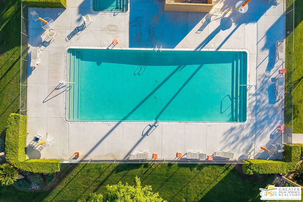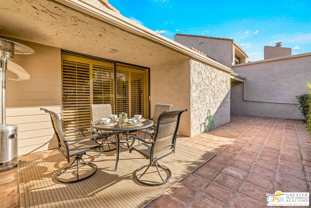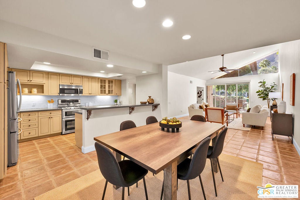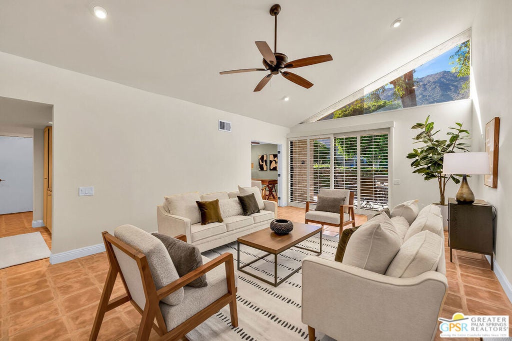 Welcome to one of the premier residences at Canyon West Estates, a gated 12+ acre community of 82 architecturally significant townhomes in desirable South Palm Springs, designed by renowned modernist architect Hugh Kaptur. This rare single-level home offers three bedrooms (or two bedrooms plus a den) and two baths, delivering both flexibility and comfort. The well-appointed kitchen features modern finishes and generous workspace ideal for anyone who loves to cook and entertain. The open living and dining areas feel light and airy, enhanced by a built-in bar and clerestory windows that flood the space with natural light. The spacious primary suite enjoys excellent separation from the guest rooms and includes an ensuite bath and a large walk-in closet. Outdoor living shines with an oversized west-facing patio, perfect for al fresco dining while taking in dramatic Mount San Jacinto views while overlooking the lush community greenbelt, dotted with mature, producing fruit trees. Additional highlights include a two-car garage with abundant storage cabinetry and a 240V outlet for electric vehicle charging. Canyon West Estates offers resort-style amenities including two pools and spas, two lighted tennis courts, and a spacious clubhouse with a fitness center and sauna. Located near hiking trails, restaurants, downtown Palm Springs, and the Smoke Tree Shopping Center. Private showings available by appointment.