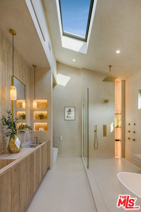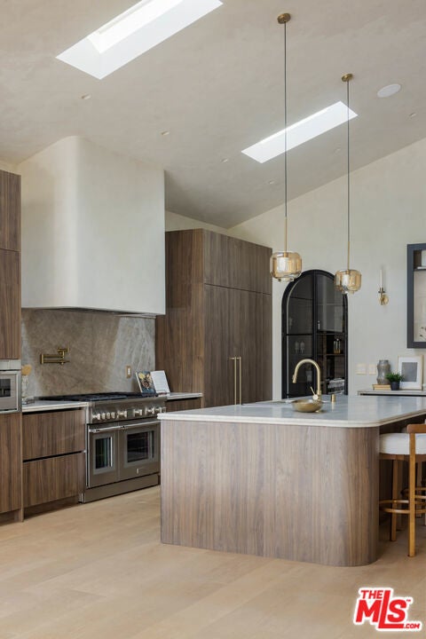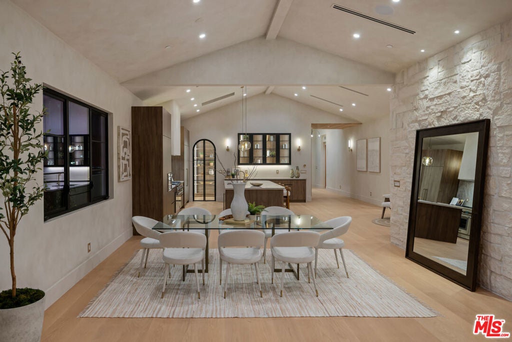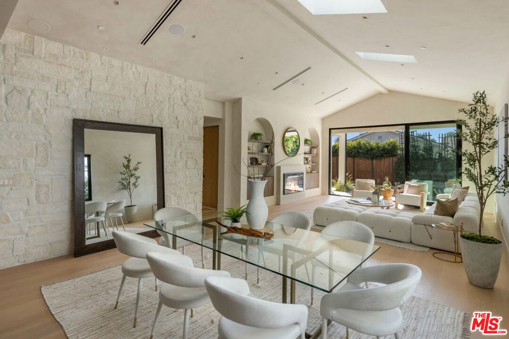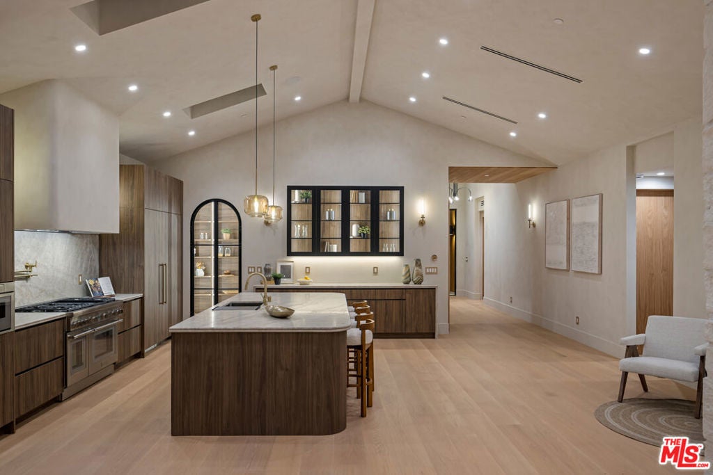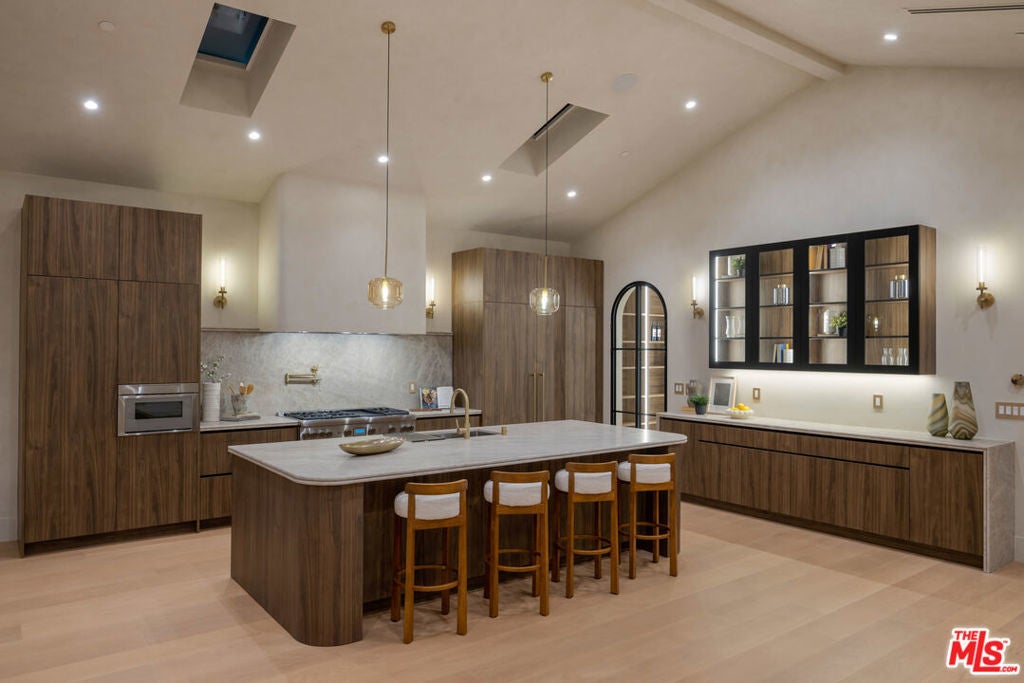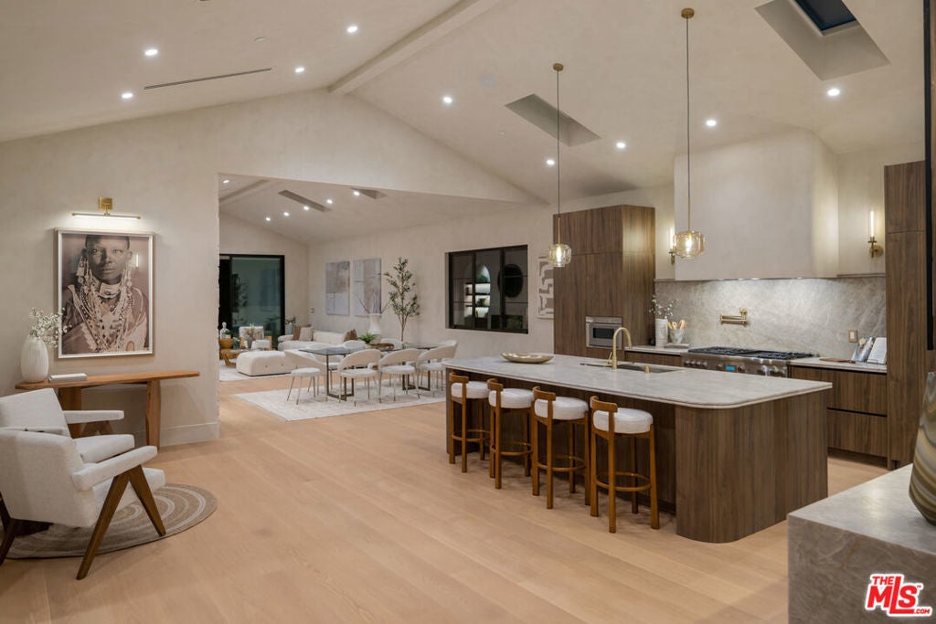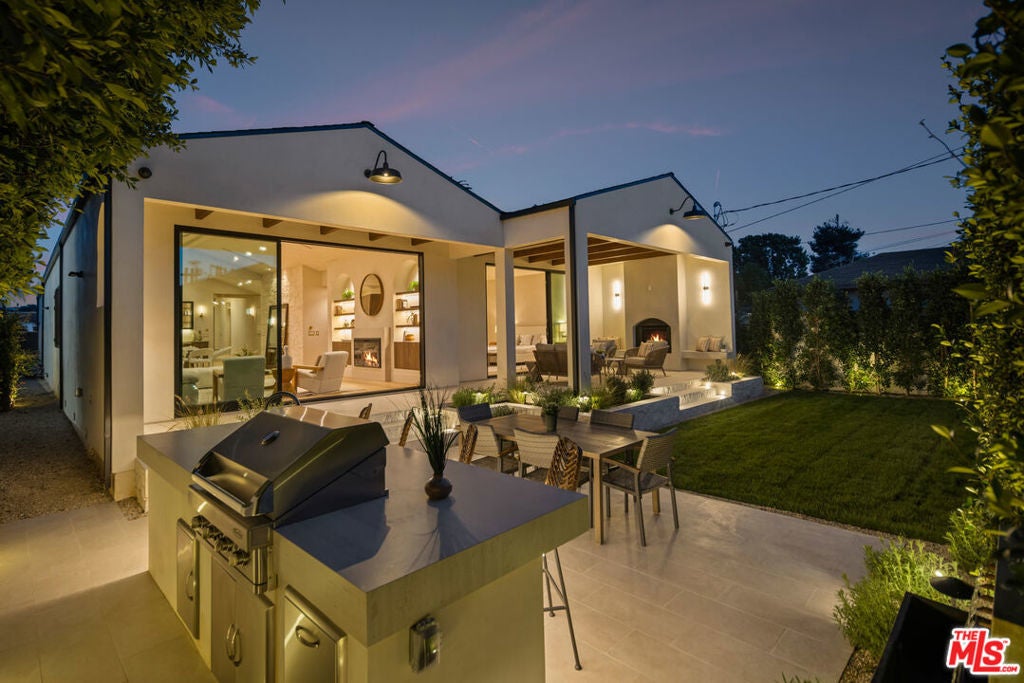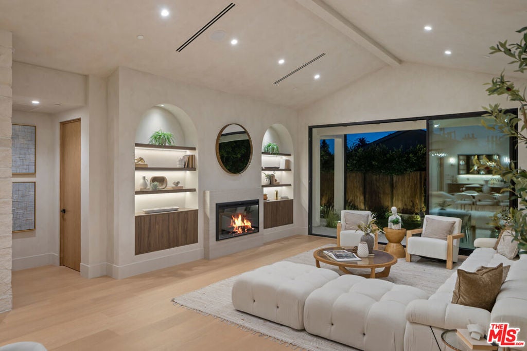 Fazeli Homes presents a luxury, bespoke residence in Mar Vista's coveted Oval set along a wide palm-lined street, this newly built custom home blends volume with sophisticated design. A gated entry leads into a dramatic 14-foot lime washed vaulted foyer and a breathtaking great room beneath soaring 15-foot cathedral ceilings. The chef's kitchen features custom-paneled Thermador appliances, Double bullnosed Perla stone counters, an XL walk-in pantry, flowing effortlessly into a dining area framed by a bold ledger-stone accent wall and a fire sided living room complete with built-ins, and expansive sliding glass doors. An extension of the home itself, the backyard boasts a barbecue island, outdoor dining, and a covered fireplace lounge, all set against a lush backdrop of mature ficus providing complete privacy. Privately positioned at the back of the property, the primary suite provides a serene escape with its spa-inspired bath, large walk-in closet, and intimate fireplace. Complementing the primary suite are three en-suite bedrooms each with smart toilets, a showpiece Roman clay enclosed powder room, a multi-zone Sonos system, a gated entry with intercom and camera, a seven-camera surveillance system, and an oversized garage with EV charger. Ideally located moments from Mar Vista's boutiques, dining, and the coast, 4029 East Blvd is a rare blend of craftsmanship, elegance, and modern living.