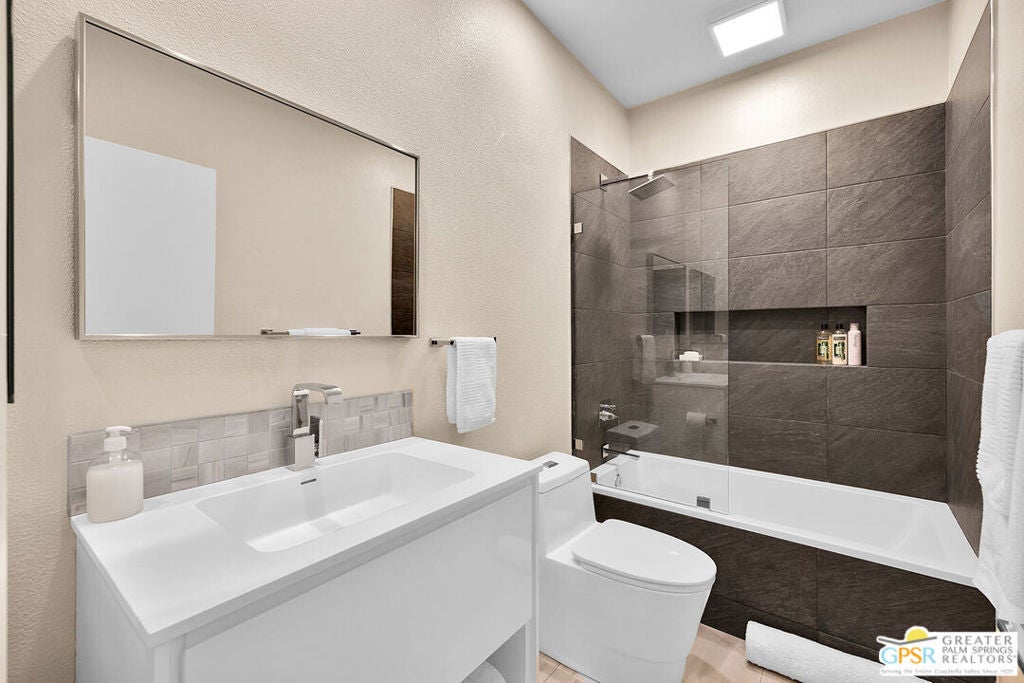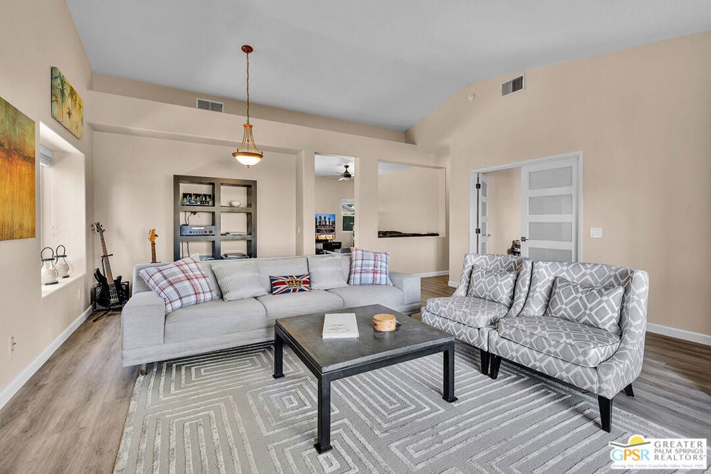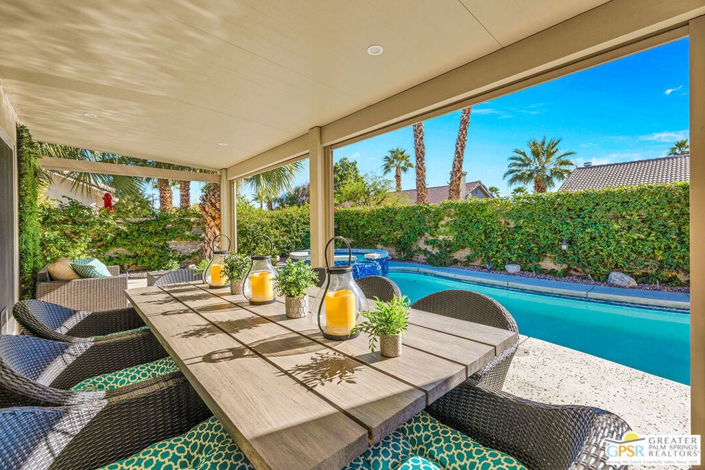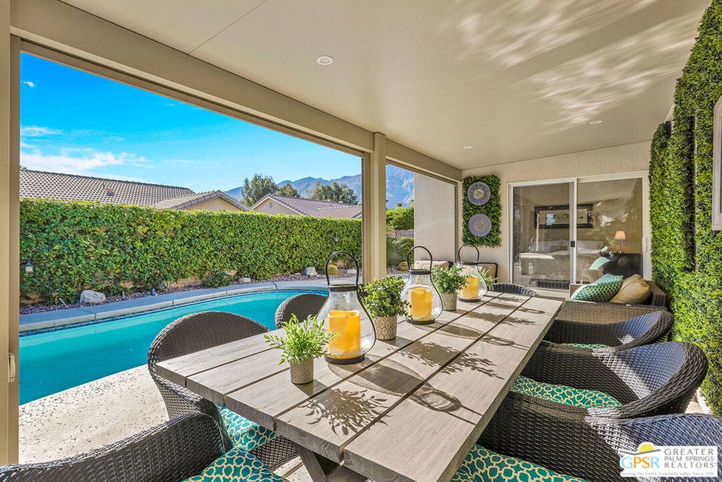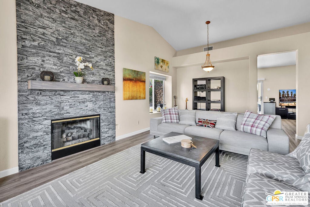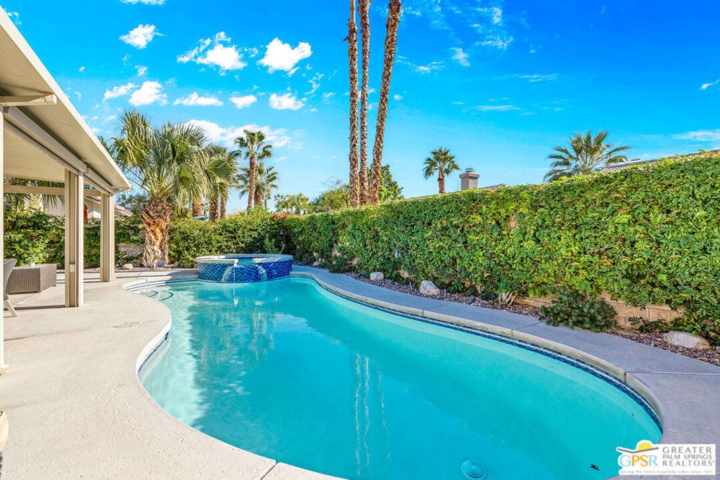Discover 1591 Olga Way, a beautifully renovated and impeccably landscaped four-bedroom residence in the peaceful Flora Vista neighborhood of Palm Springs. This home is distinguished by its rare south-facing orientation, providing all-day winter sun on the sparkling pool and spa alongside breathtaking, unobstructed views of Mount San Jacinto. The outdoor living space is enhanced by a contemporary Alumawood canopy featuring a lush green wall and motorized drop shades, creating a perfect shaded retreat for alfresco lounging and dining. Inside, the nearly 1,600-square-foot interior is anchored by an open living room with vaulted ceilings and a floor-to-ceiling stone fireplace, creating a bright and airy atmosphere. The layout flows seamlessly into a well-appointed kitchen and dining area, designed for everyday living and effortless entertaining. The primary suite offers a private retreat with a walk-in closet and a contemporary ensuite bath, while three additional guest rooms provide versatility for any lifestyle. Both bathrooms have been elegantly updated with high-end fixtures and natural stone accents, including a modern tub-and-shower combination in the guest bath. Practical highlights include a two-car attached garage and a dedicated laundry room. Located just moments from local grocery stores, gyms, and cafes, the home offers effortless access to essentials while remaining a very short drive from downtown Palm Springs. This move-in-ready sanctuary perfectly combines modern style with the most desirable mountain views the desert has to offer-contact agent for a private showing.