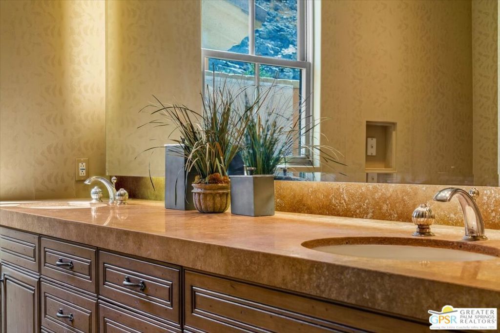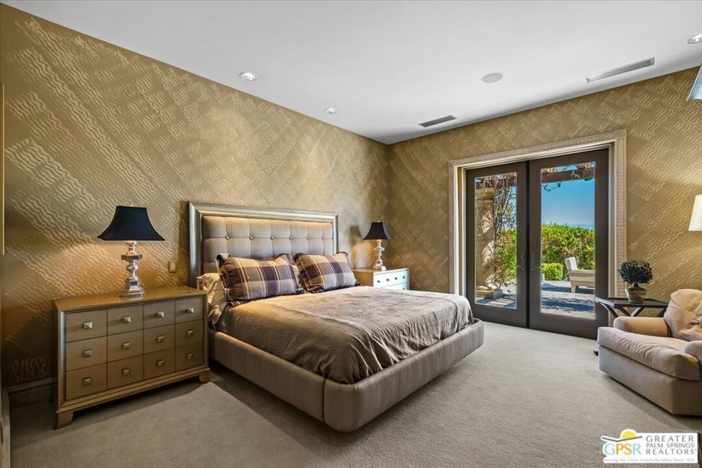 Old World charm meets desert luxury in the heart of Rancho Mirage. Nestled within a coveted enclave, 2 Nebulae Way offers the perfect balance of serene desert living and high-style luxury. This gated Tuscan-inspired estate embodies the romance of Mediterranean architecture with its warm stone facade, arched entryways, and rich craftsmanship, all set against the dramatic backdrop of the Santa Rosa Mountains. Designed for both intimate living and grand entertaining, the home features a chef-inspired kitchen with an adjacent butler's pantry, spacious open concept living areas, and resort-style outdoor areas complete with a sparkling pool, spa, and multiple lounge settings. Whether hosting sophisticated soirees or enjoying tranquil mornings, every moment feels curated and exceptional. The 1,000+ square feet primary bedroom suite includes 2 walk-in closets, entirely separate double vanity areas and a double-height, dual-entry shower. The other two en suite bedrooms occupy the opposite end of the home, providing separation from other occupants. This unique property was designed and built by the late noted desert developer and designer, Jim Baker, and is being offered with the custom furnishings created locally and especially by him for this home. Beyond the gates, Rancho Mirage offers world -class golf, fine dining, and the cultural vibrancy of Palm Springs just minutes away. 2 Nebulae Way is more than a home -- it is a private sanctuary for those who appreciate privacy, beauty, and the art of desert living.