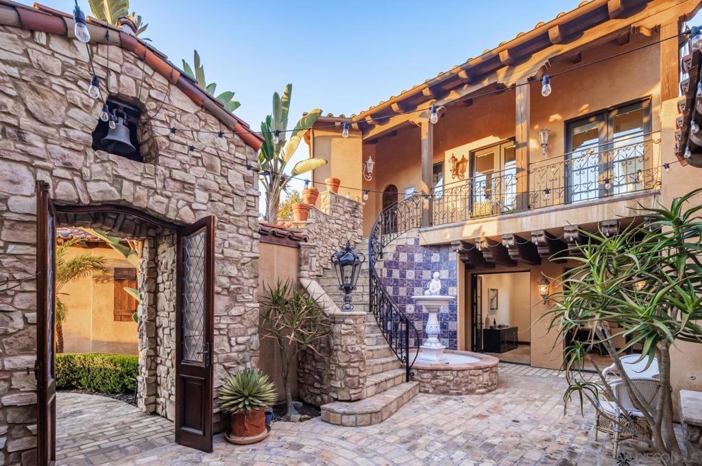 A true showpiece in Rancho Santa Fe’s exclusive Cielo community, this architectural estate sits privately perched above it all, capturing uninterrupted panoramic views that stretch from rolling hills to the Pacific Ocean. Designed by acclaimed architect Dena Gillespie, known for crafting homes with mystique and presence, this 4+ bedroom villa is a masterclass in timeless design, blending reclaimed European elements with refined craftsmanship and modern sophistication. The front courtyard, anchored by a custom Vietri fountain and grand stone staircase, sets a cinematic tone that continues throughout the home’s dramatic interiors and seamless indoor-outdoor flow. The backyard has a patio with fire pit, private guest quarters, solar power, and a spa elevate the lifestyle offering, while the unique lot shape creates over 220 feet of backyard frontage with space for a resort-style infinity pool and a one-acre hillside ready for a vineyard. Every detail of this estate has been curated to deliver character, elegance, and star-level appeal in one of Rancho Santa Fe’s most prestigious settings. Cielo offers an exceptional lifestyle centered around the Cielo Club, an 8,000 sq. ft. facility featuring elegant event lounges, a catering kitchen, meeting rooms, a modern fitness center, and spa amenities. Outdoors, residents can enjoy a competition-sized pool, a children’s wading pool, a shaded pavilion with gas grills, tennis courts, and a playground. The Montagna Club adds even more with its own pool area, open-air pavilion, outdoor fireplace, and tennis courts. Spanning 1.5 acres, Cielo Park is a recreational haven with basketball and sand volleyball courts, a climbing wall, sports fields, and picnic areas with BBQs—perfect for active days and relaxed gatherings alike.
