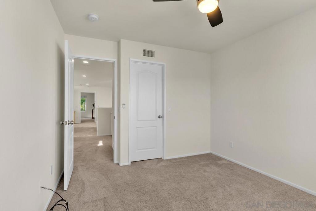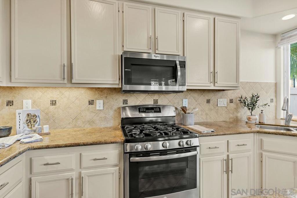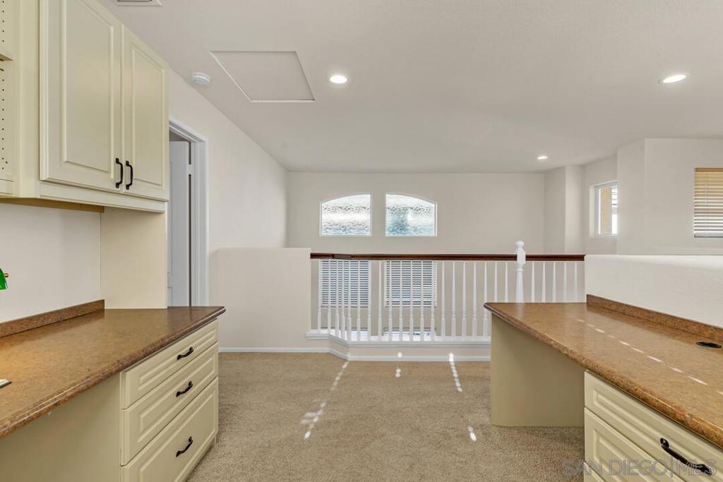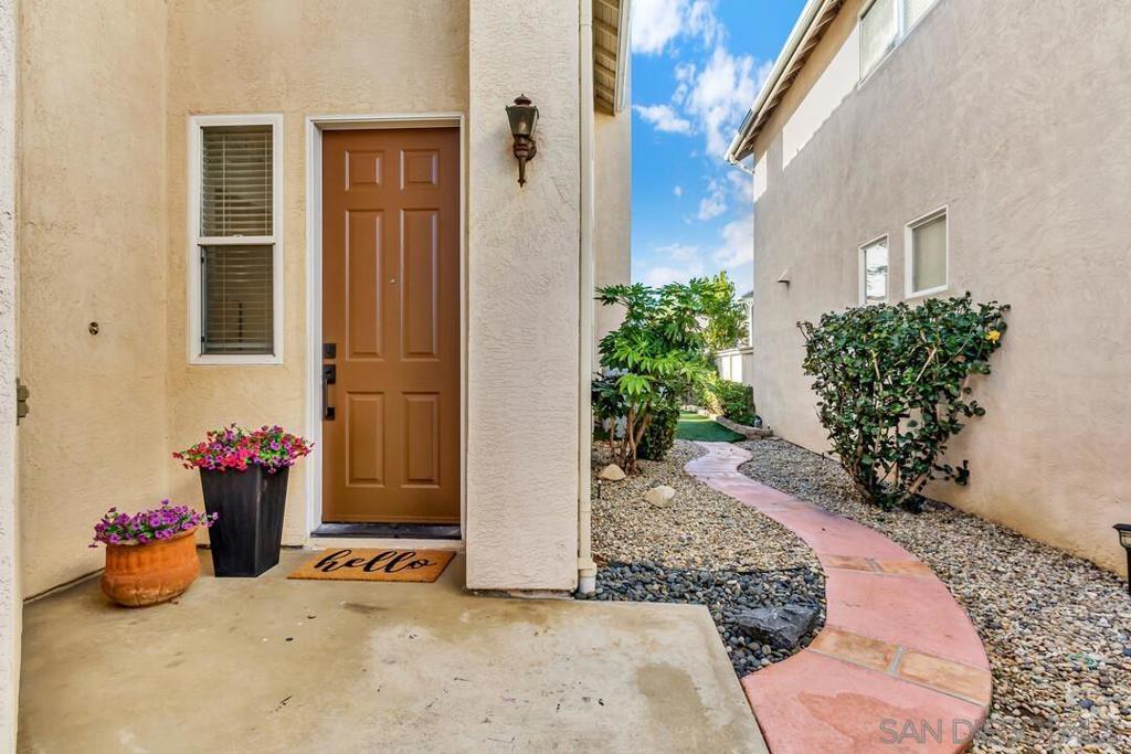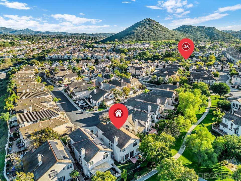 True resort-style Southern California living awaits in the gated community of Vista Del Lago. This exceptional updated home backs to a beautiful grassy park with a gazebo, and mountain views offering rare privacy. A full-length driveway with room for two cars plus a two-car garage lots of storage makes this home truly unique for the community. Inside, you’re welcomed by stunning leaded glass, cathedral ceilings, and abundant natural light. The spacious family room with fireplace flows seamlessly into the kitchen, ideal for everyday living and entertaining. Upstairs, the loft features custom built-in cabinetry with three workstations, ideal for a home office or homework area, with the option to enclose it as a fourth bedroom and additional expansion potential by adding square footage within the high cathedral ceilings, as seen in similar homes in the community. The primary suite enjoys serene views and includes a spa-like bath with soaking tub and an oversized walk-in closet with built-ins. The lush, low-maintenance backyard features a patio for entertaining, artificial turf, flowering plants, palms, and peaceful park and mountain views. Enjoy world-class community amenities including pools, spas, pickleball and tennis courts, fitness center, and recreation grounds. Ideally located near major employment hubs with easy access to the 15 freeway, shopping, dining, and schools. Zoned for Chaparral Elementary, Bernardo Heights Middle, and Rancho Bernardo High within the award-winning Poway Unified School District. Freshly painted, updated bathrooms, and move-in ready. Welcome home!