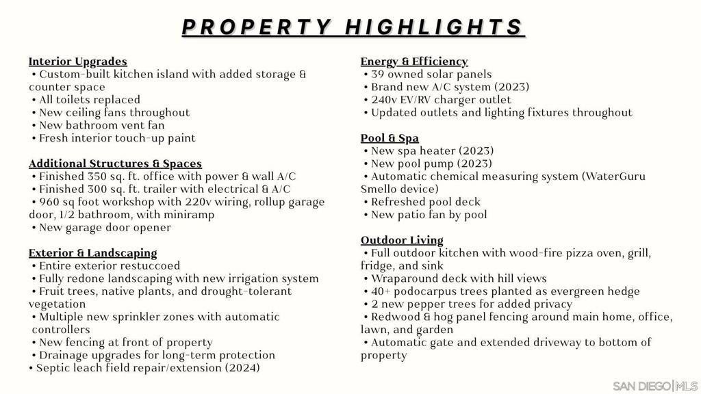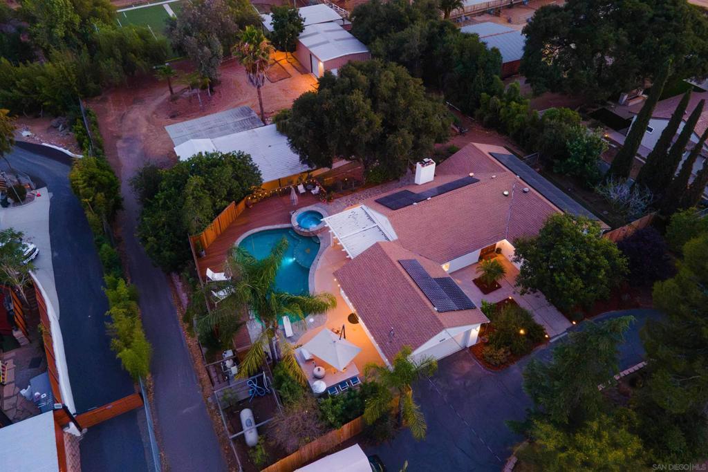 Welcome to 1454 Romance Road in Escondido—a home where care and upgrades shine in every detail. Sitting on 1.36 acres of mostly flat, usable land, this property invites endless possibilities: add an ADU, create a horse setup, build a sports court, expand gardens, or simply enjoy the open space. A separate gated driveway provides easy access for projects, RV parking, or future structures. Inside, natural light fills the south-facing living room, and the private primary suite offers privacy and calm and includes a walk-in closet. With three bedrooms, two baths, and a finished 310 sq ft office with power and wall A/C, the layout is practical and adaptable. Outdoors is where this home truly shines! A large pool and spa overlook beautiful hills, with a wraparound deck perfect for relaxing or entertaining. An added full outdoor kitchen—featuring a wood-fire pizza oven, grill, fridge, and sink—makes gatherings effortless! This home has been meticulously maintained and upgraded. 39 owned solar panels, new A/C, new spa heater, pool pump, refreshed pool deck, new stucco, new toilets, fresh paint, and a custom kitchen island. Landscaping was redone with irrigation, fruit trees, natives, and low-water plants. A redwood/hog panel fence encloses the home, office, lawn, and garden. Electrical updates include a 240v EV/RV outlet, new fixtures, and upgraded lighting. Even drainage and the garage door opener were thoughtfully improved. 1454 Romance Road offers luxury and the rare kind of space that invites both relaxation and potential—and a dash of fun with your own garage skatepark!
