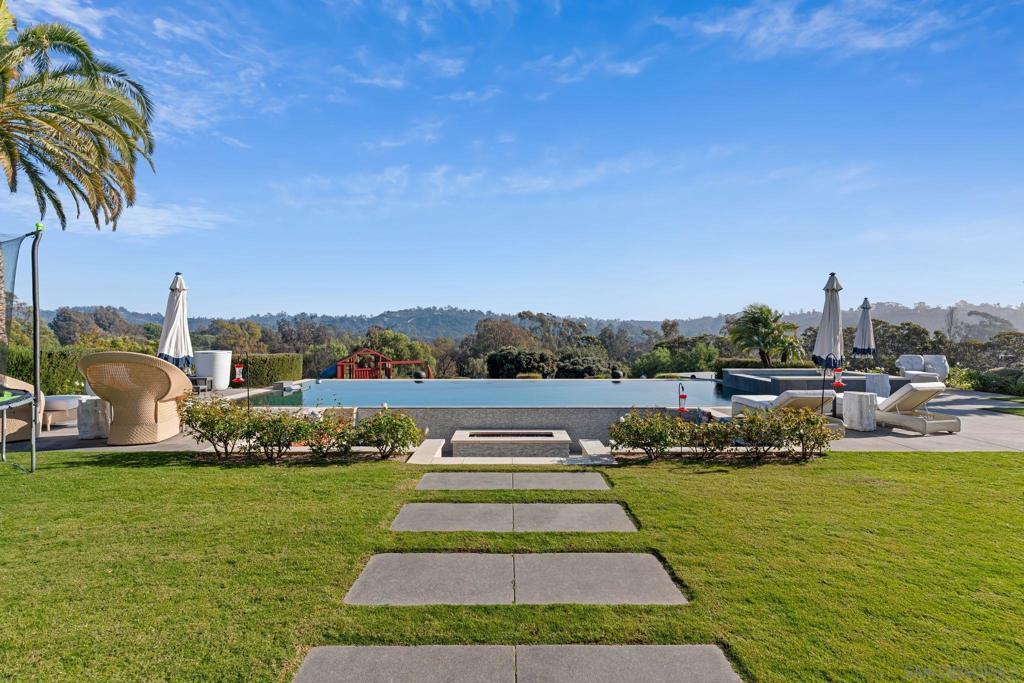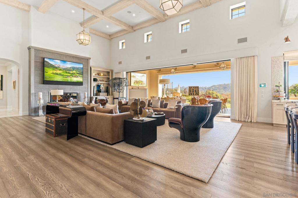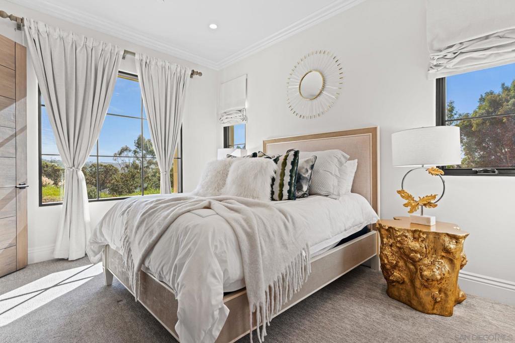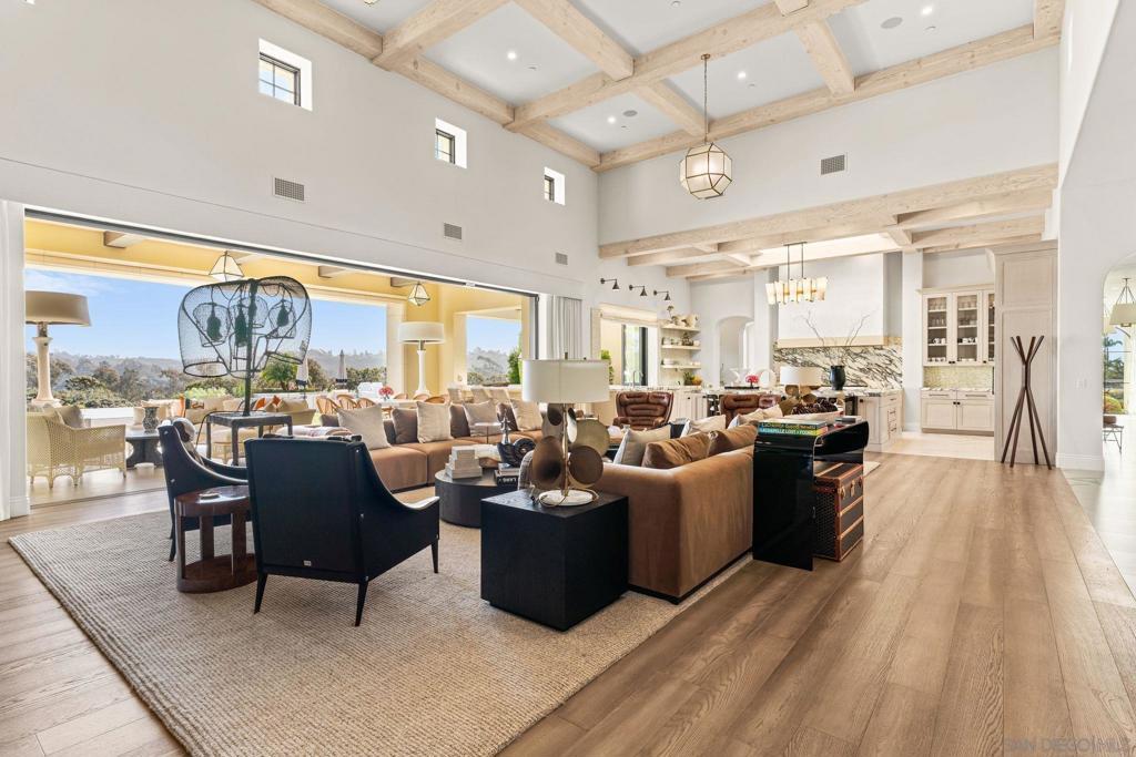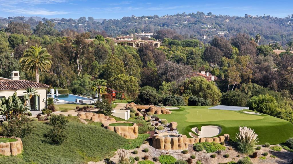 Step out of your home and onto your own private golf course at Querencia at El Camino, set on 4.62 acres in the highly sought-after West Side Covenant of Rancho Santa Fe. This approx. 8,000 sq. ft. estate offers privacy, space, and stunning southwest views. The backyard has been transformed into a golfer’s dream with multiple tee locations and two full-sized greens, ideal for practicing shots up to 110 yards while enjoying unobstructed Covenant scenery. Designed for single-level living, the main home features six en-suite bedrooms, plus a detached 1-bedroom, 1-bath casita with kitchenette and separate service quarters with a full kitchen. A gated, winding driveway leads to the home, creating a private and welcoming arrival. Inside, the expansive great room includes a 40-foot retractable glass wall for seamless indoor-outdoor living. Additional highlights include gallery-style hallways, a steel front door, private office or library, wet bar with wine storage, and a spacious primary suite with dual walk-in closets and a private patio with jacuzzi. The gourmet kitchen features an oversized waterfall marble island, high-end appliances, coffee bar, and cantina windows opening to the outdoor kitchen. Outdoor spaces include a sunken fire pit, outdoor fireplace, and BBQ bar—perfect for entertaining. Nearly 5 acres offer room for additional amenities, with permitted plans for an extra garage. Minutes from Del Mar beaches, shopping, dining, and equestrian trails.
