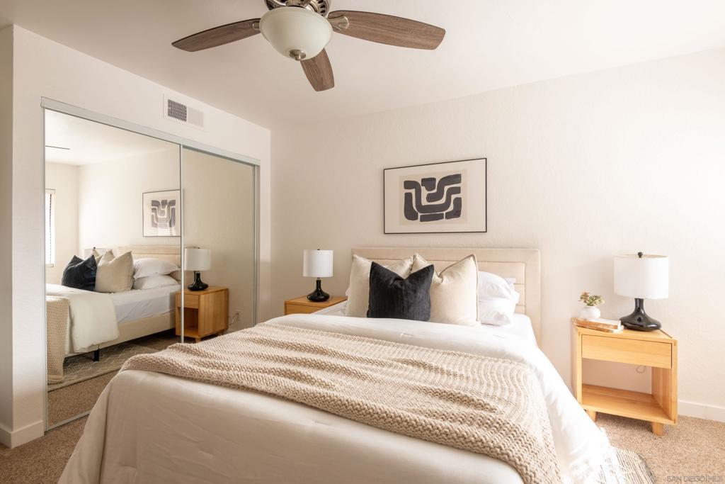Experience resort-style living in the heart of Fashion Valley at Presidio Place. This top-floor condo is filled with natural light and features vaulted ceilings, an open and airy floor plan, and a private balcony overlooking the pool. The spacious living area is ideal for both everyday living and entertaining, while the oversized primary suite offers a peaceful retreat with an ensuite bath and dual sink vanity. Enjoy the convenience of in-unit full-size stacked laundry and thoughtful separation of space throughout the home. Presidio Place is known for its lush, park-like grounds with walking trails, a large lagoon, tennis and pickleball courts, and a pool and spa—creating a true oasis just minutes from shopping, dining, beaches, and freeway access. This is low-maintenance living with a resort feel in one of San Diego’s most central locations.