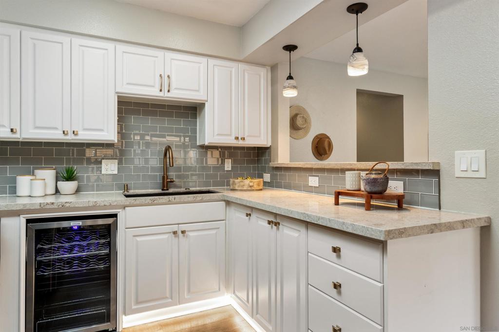 Located in the highly sought-after SDSU College area, this updated upstairs 3-bedroom, 2-bath unit offers the perfect setting, tucked along a tree-lined walkway with lush landscaping and a sparkling community pool. Step inside to discover a light-filled interior with LVP flooring throughout, dual-pane windows, designer paint, mirrored wardrobe doors, LED recessed lighting, and multiple ceiling fans. The kitchen is a showstopper, featuring stunning quartz countertops, custom cabinetry with bar seating, pendant lighting, and stainless steel appliances including brand new refrigerator and separate wine cooler. Every detail has been thoughtfully upgraded, including both remodeled bathrooms with stylish finishes and modern hardware. Additional highlights include a side-by-side full size washer and dryer and custom built storage, upgraded electric heaters, air conditioning, and a covered balcony off the living area. This larger, most desired floor plan includes two covered parking spaces, while the unbeatable location puts you close to the trolley line, popular dining spots, Lake Murray, and offers seamless freeway access. VA Approved!