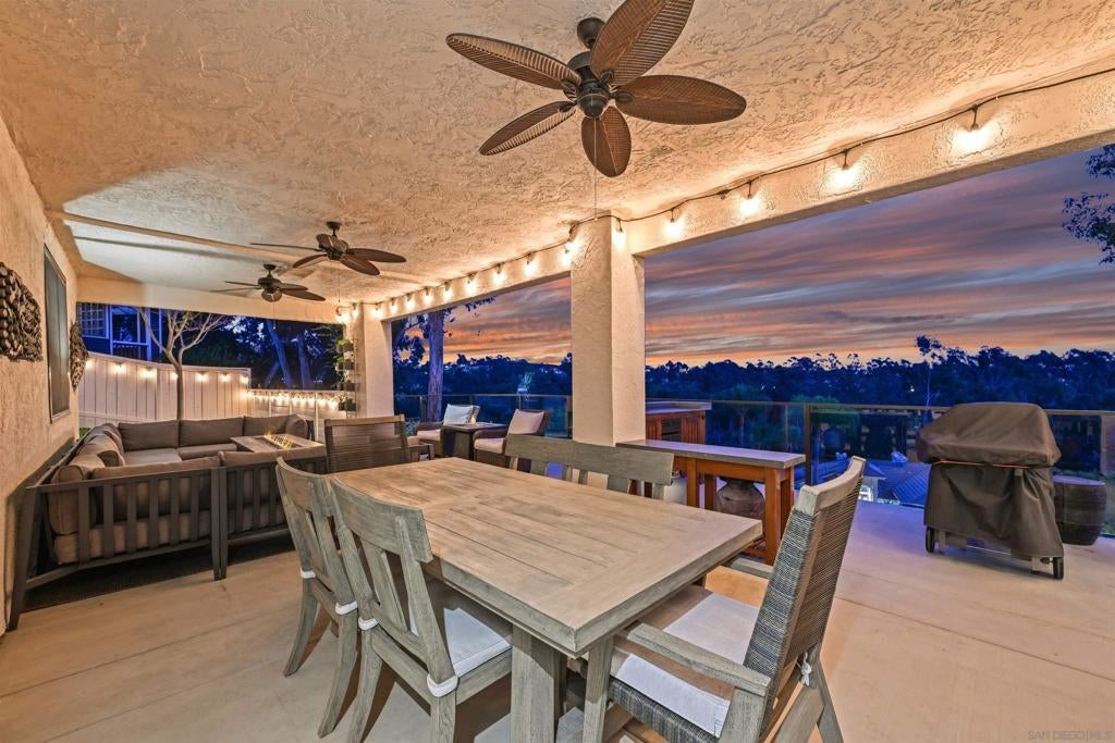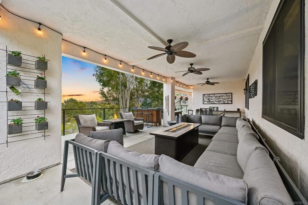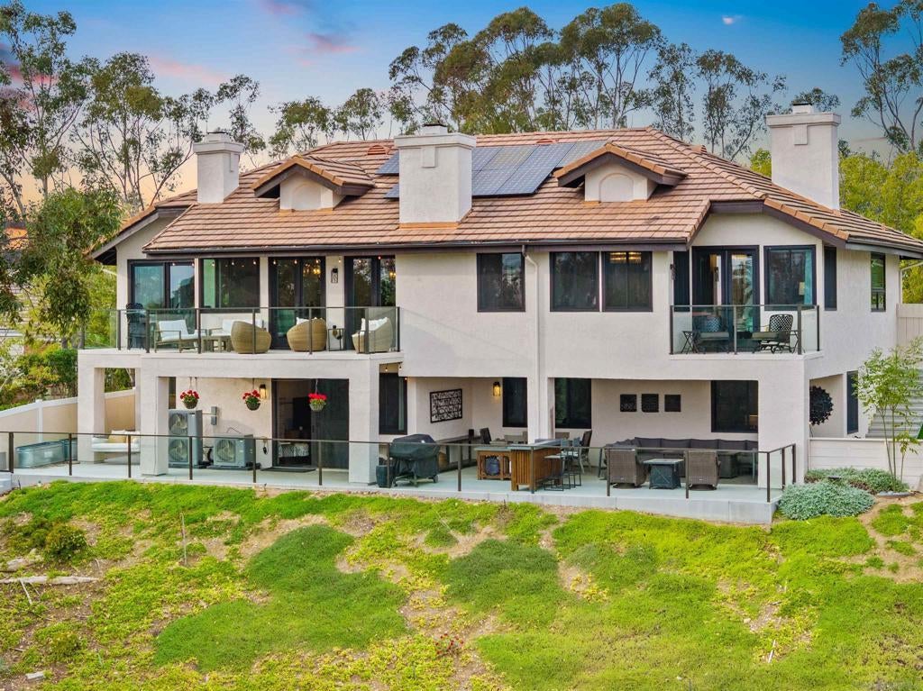 Enjoy breathtaking views from nearly every room in this captivating, 4-bedroom plus an office, 3.5-bath home, with owned solar system, perfectly situated on a premium cul-de-sac lot. Striking architecture and three private balconies showcase panoramic sunsets. From the moment you sweep through the double door entry, you will be mesmerized by all this spectacular home offers. The main level boasts an open floor plan with vaulted ceilings and fireplace in the living room, expansive primary retreat with fireplace providing a private oasis, plus a den/home office that can easily be converted into a fifth bedroom optimizing ease of daily living. An open, airy living area boasts of two sets of new French doors that create seamless flow out onto a large balcony. A spacious entertainer's kitchen boasts of quartzite countertops accented by a dragon scale backsplash plus an abundance of cabinet space. Entertain in elegant fashion in your formal dining room. On the lower level you will find a family room with an additional fireplace; bedroom with an ensuite bath, secluded patio, and large closet/dressing area; laundry room with folding counter and built-in cabinetry; plus 2 more bedrooms and a full bathroom. Outdoor enjoyment awaits in the spacious yard on the patio and low-maintenance turf—ideal for relaxing or entertaining while enjoying the home's private, scenic setting. Café lights on the main-level deck and lower patio, plus a fire pits, create inviting outdoor ambiance and year-round warmth. High end upgrades abound throughout including Anderson windows and doors, glass railings, renovated decking, custom solid wood garage doors and side-mount openers, custom solid wood front door, custom built-ins, and so much more (see attached list in supplements). The attached 3 car garage will store all your toys and keep you organized. Outdoor enjoyment abounds with a park just down the street and HOA amenities including a lap pool and pickleball/tennis courts complete this exceptional offering. A must-see!