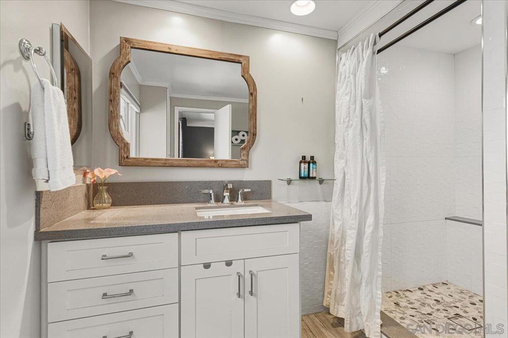 Enjoy the perfect blend of tranquil living and everyday convenience in this charming single-story bungalow, set on a generous 10,100 sq. ft. usable lot near the end of a quiet cul-de-sac in sought after neighborhood. Set back from the street, the home offers privacy and a tranquil setting to relax and unwind. Inside, the living room features natural hardwood floors and oversized picture windows that invite in cooling afternoon breezes. The spacious kitchen offers abundant cabinetry, gas cooking, and opens to a sun-filled bonus room—an ideal spot for an office, den or extra bedroom. Step outside to the raised wood deck, extending the living space outdoors and creating the perfect vantage point to take in the serene backyard and glowing sunset skies. Designed for comfort, accessibility, and outdoor enjoyment, the backyard is a true retreat with gently terraced landscaping, raised vegetable gardens, paver patios and walkways, a cozy fire pit, pergolas draped in rose vines, fruit-bearing trees, drought-tolerant plantings, and classic ranch-style fencing. Ideal space for an ADU and endless possibilities. The spacious primary suite overlooks the backyard and includes hardwood floors, dual walk-in closets, and a well-appointed ensuite bath with quartz countertops, custom floor-to-ceiling tile, and a pebble-stone shower floor. Thoughtfully integrated accessibility features include wide interior doors, no interior steps, walk-in showers and a ramped walkway to the front entry. Additional highlights include central A/C and heat, an extra-long partially covered driveway with space for multiple vehicles, an RV, or a boat. Ideally located within walking distance to shops and local restaurants and just minutes from the California Center for the Arts, Kit Carson Park, Lake Hodges, and the Escondido Farmers Market. Property qualifies for a $10K Grant program- buyers please inquire. This home offers a desirable lifestyle in a vibrant, sought after community—truly a must see opportunity!