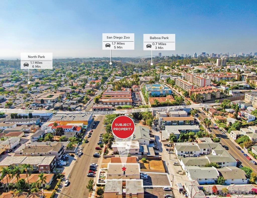 This is a unique opportunity to own eight extensively renovated 500sf 1 Bed 1 Bath units in the premier North Park neighborhood of San Diego CA. Units are fully appointed with in-unit washer dryer, 2 zone mini-split ac units, vinyl plank floors, recessed lighting, ceiling fans, modern kitchen and bathroom finishes. Tenants enjoy Private balcony/patio space and dedicated onsite parking for each unit. The site is gated with a code lock. The building is all electric and has upgraded electrical subpanels. The building was constructed in 1977 and Renovated in 2020. Lot size is 6,974. Improved Space: 3,906 per title. Site offers desirable high density RM-3-9 Zoning (allows 1 dwelling per 600sf) which could open construction opportunity in the rear lot space. Up to 100% density bonus is allowed with deed-restricted units. Site is within Complete Communities FAR Tier 3 (6.5 FAR) and within Mobility Zone 2. These favorable zoning designations allow for increased density, waivers for development impact fees, and reduced parking requirements. This is an opportunity to entitle functional space while maintaining units for cash-flow.