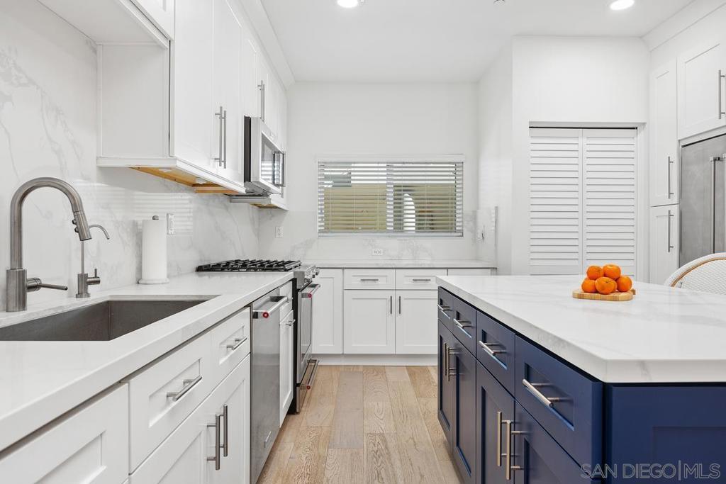 Rarely available West-side residence offering a notably private orientation within the community, located inside a walkable coastal enclave moments from Oceanside’s pier, harbor, shops/dining. This 3-bedroom, 3-full-bath home features 9-foot ceilings throughout with entry-level living, dining, kitchen, bedroom, and full bath. The open living space is complemented by a beverage nook and custom kitchen island, creating an easy flow ideal for both everyday living and entertaining. Timeless finishes include neutral wide-plank hardwood flooring throughout, shaker-style white cabinetry in the kitchen and baths, and elegant quartzite countertops. A reverse osmosis water system adds an extra layer of everyday comfort. Upstairs, two expansive primary suites feature dual vanities and flexible space for an office, seating, or workout area, with one suite offering double-door entry and multiple peek ocean views. Bathrooms are finished in a clean, timeless palette that pairs easily with a variety of design styles. With no residence above or below, the home enjoys enhanced privacy and a townhome-like living experience. The ocean-view rooftop deck is just a few steps from the second-level primary suites, offering clear sightlines and uninterrupted views to the coastline. Additional highlights include assigned side-by-side parking with electric vehicle charging and HOA dues of $886 per month, including water and trash. On-site amenities include ground-level bike storage, a private four-person sauna with rinse area and shower, a lobby bathroom, and a dedicated storage area for the unit.