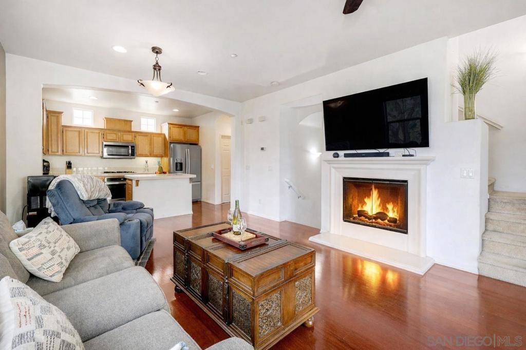 Desirable corner townhome located in the highly sought-after Escala Terraces, offering over 1,600 sq ft of thoughtfully designed living space. The home features hardwood floors throughout the living areas and carpet in the bedrooms, along with a convenient first-floor bedroom and full bathroom, ideal for guests, multigenerational living, or a home office. Each additional bedroom includes its own private bathroom, providing exceptional comfort and privacy. The open-concept floor plan showcases a light-filled kitchen, living, and dining area centered around a cozy fireplace, along with an additional guest bathroom for added convenience, perfect for both everyday living and entertaining. This corner unit also offers scenic views, enhancing the bright and airy living space. Residents enjoy resort-style amenities including a pool, spa, fitness center, tennis courts, dog park, and scenic hiking and walking trails. Prime location with easy access to shopping, dining, and major freeways.
