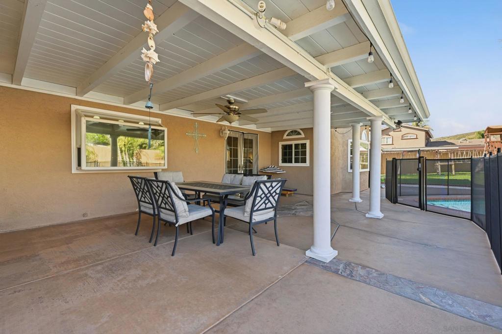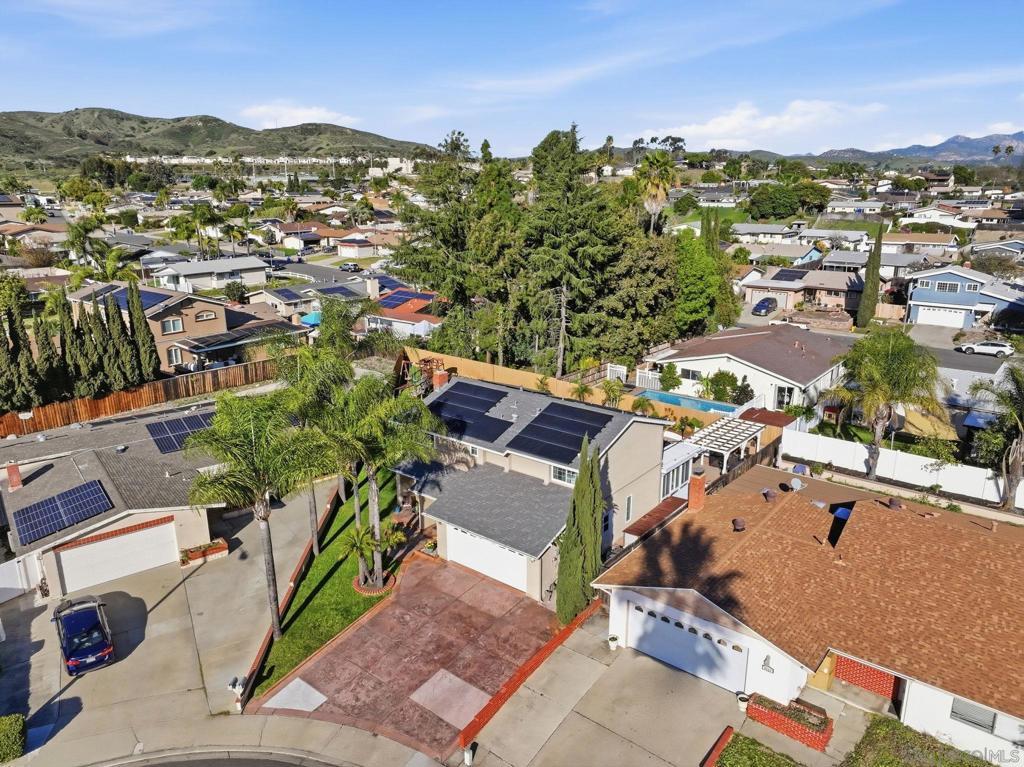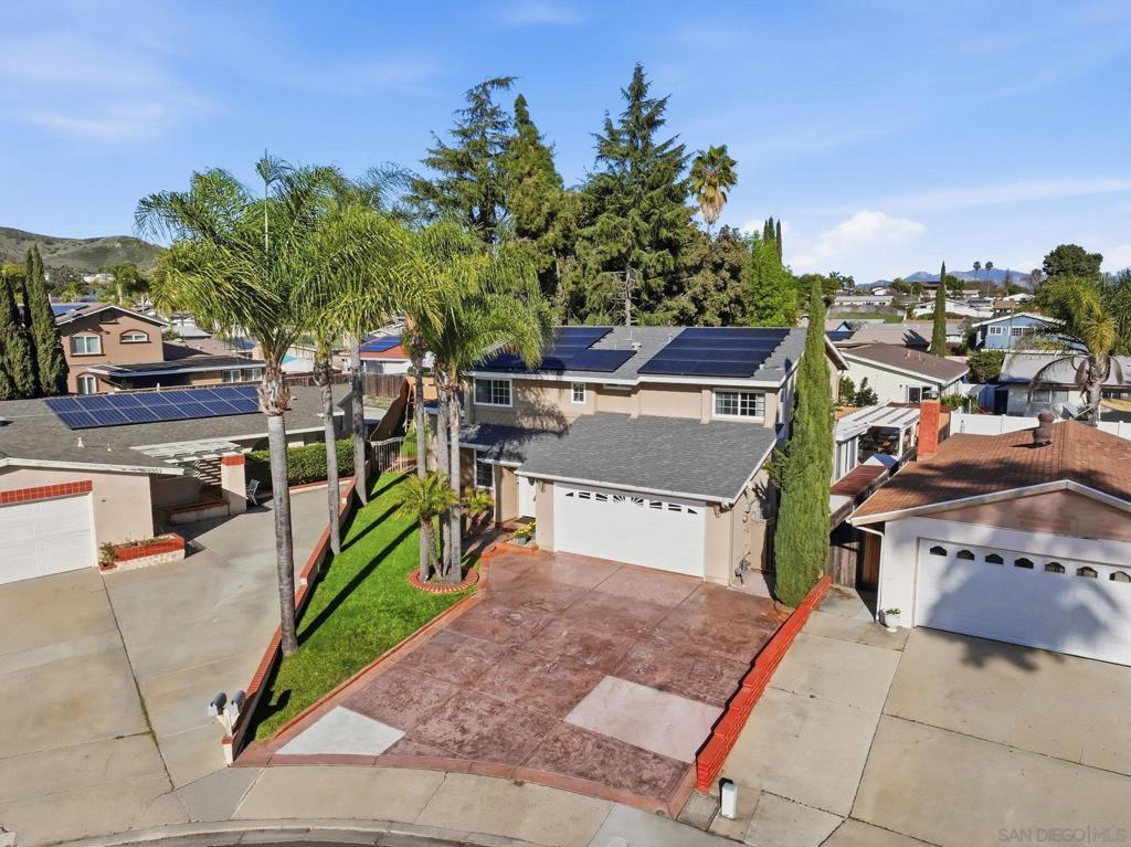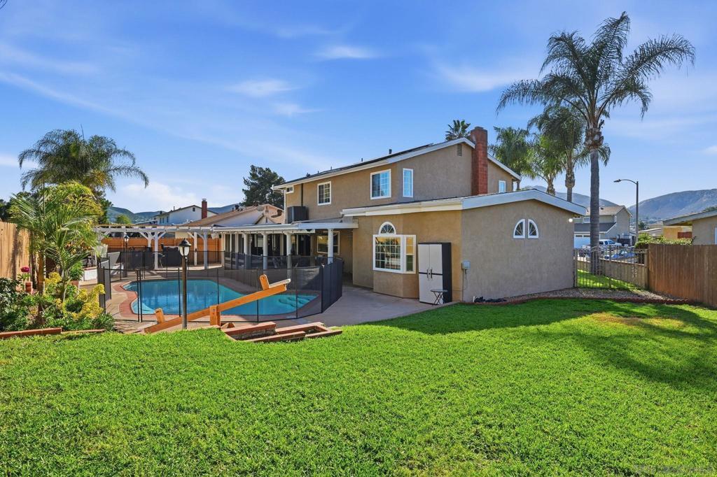 Resort-style living takes center stage in this thoughtfully updated Santee home, where an owned solar system and private pool create a comfortable, energy-conscious lifestyle from day one. Tucked away on a quiet cul-de-sac, this 4-bedroom plus bonus room, 2.5-bath residence offers 2,110 square feet of well-designed living space on a 7,528 square foot lot. Inside, the layout includes well-defined living areas with distinct spaces for living, dining, and gathering. Dual-pane windows and a freshly painted interior enhance natural light and comfort throughout. The updated kitchen serves as a functional hub with granite countertops and stainless steel appliances, connecting easily to the main living spaces for effortless flow. A bonus sunroom provides flexible use as a home office, playroom, or relaxation space, adding valuable versatility. Outside, the entertainer’s backyard is designed for year-round enjoyment with a solar-heated pool, expansive covered patio, outdoor kitchen, grassy area, and play set, offering space to relax or host with ease. Major system updates include owned solar, a new roof, HVAC system, and solar pool water heating installed in 2022, along with a new water heater added in 2024, offering improved efficiency and added peace of mind. Conveniently located close to schools and everyday amenities, this move-in ready home delivers the indoor-outdoor lifestyle Santee is known for.