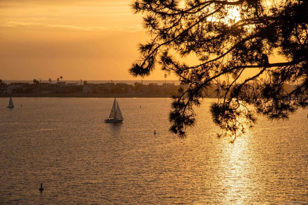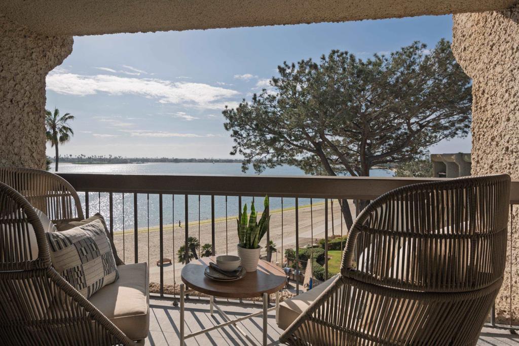 Perched on the top floor of Bay Scene directly on Sail Bay, this rare residence offers one of the most coveted view lines in the community — sweeping western-facing bay vistas with ocean views beyond. Spanning 1,559 square feet, this completely remodeled 2-bedroom, 2-bath home is the ultimate coastal retreat, blending sexy Hawaiian-inspired design with modern beachfront luxury. The open living space is anchored by a dramatic stone-clad fireplace and flows seamlessly into a show-stopping kitchen featuring brand-new contrasting black and warm wood-tone cabinetry, lava rock leather-finish countertops, and sleek black Café Series appliances. Designed for both entertaining and everyday living, the layout captures breathtaking sunsets and shimmering water views from nearly every room. The primary suite is a true sanctuary with a walk-in closet and a spa-inspired bathroom showcasing gorgeous tile work, a Restoration Hardware vanity, and West Elm lighting. The guest bathroom is equally refined with elevated finishes throughout. A dedicated laundry room and generous storage complete the home’s effortless functionality. Residents enjoy resort-style community amenities including a pool, spa, outdoor showers, barbecues, recreation room, and fitness room — perfect for relaxing, entertaining, and embracing the coastal lifestyle. Whether as a full-time residence or the perfect lock-and-leave second home, this home delivers an unparalleled Sail Bay lifestyle — where every day feels like a luxury beachfront getaway.