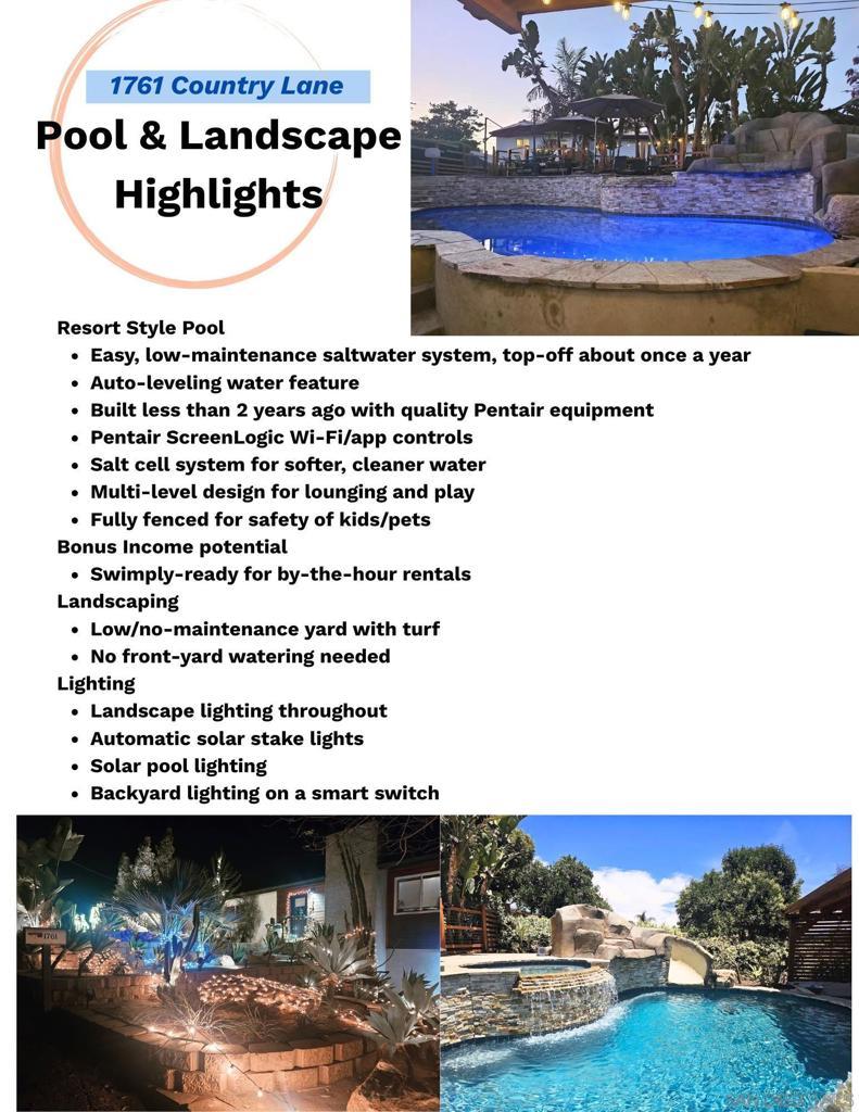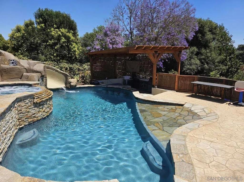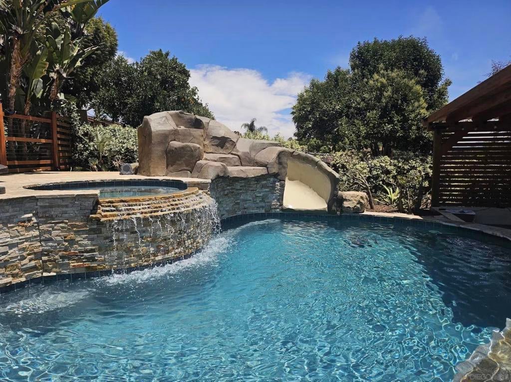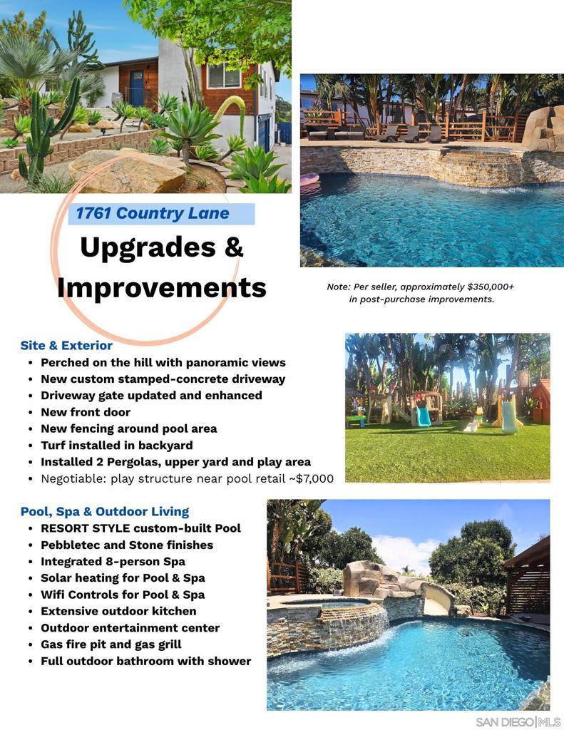 Extensively upgraded home with resort style, custom pool & 8-person spa with lighting, PebbleTec, saltwater system, Wi-Fi controls, decorative slide & waterfall. Solar pool and spa heating for year-round enjoyment. Outdoor kitchen and full outdoor bathroom, integrated gas fireplace and grill, huge play structure & two pergolas. Large lot! Stunning inside with vaulted, exposed beam ceilings, open floor plan, gorgeous kitchen with large center island. Primary suite upgraded with expansive closet system from Tailored Closet. Modern conveniences include Level-2 EV charging, mew Samsung Bespoke appliances, smart switches & smart garage. Thoughtful upgrades: new custom stamped-concrete driveway, luxury vinyl plank flooring, brand-new tankless water heater, whole-house filtration, beautiful landscape & lighting, and a 6-ton central AC (installed 2017). See documents for the complete improvements list. 2017 down-to-the-studs renovation with ongoing, owner-added upgrades since. No HOA. Solar lease.