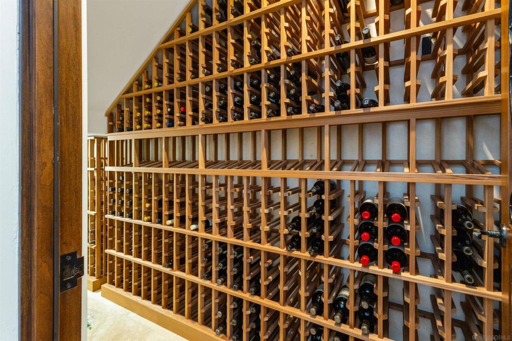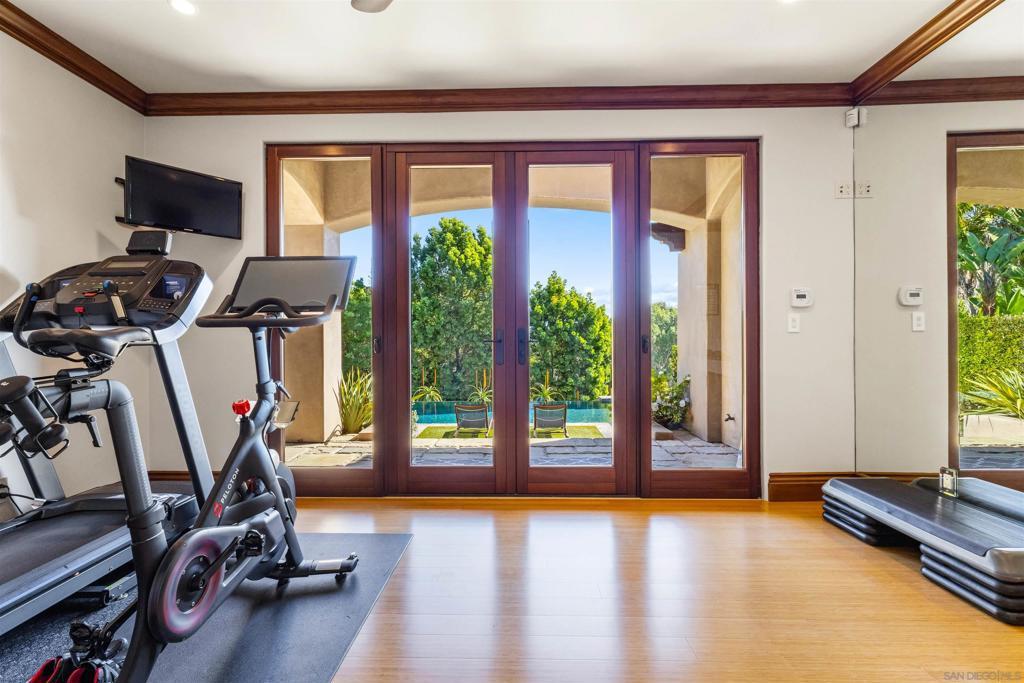 Located on a preeminent street within the Covenant of Rancho Santa Fe, this private gated estate sits on 2.5 acres of meticulously landscaped grounds by renowned designer Theresa Clark. Blending European elegance with Santa Barbara chic style, the residence offers privacy, refined craftsmanship, and seamless indoor-outdoor living in the highly sought after Roger Rowe School District. The home functions primarily as a single-level residence, with all main living spaces and four en-suite bedrooms including the luxurious primary suite on the first floor. The primary suite features a fireplace, custom walk-in closet, and direct access to a mirrored yoga studio/gym and outdoor areas. A single upstairs en-suite bedroom currently serves as an executive office with built-ins and panoramic views. Flooring is thoughtfully curated: Jerusalem stone tile in entryways and powder room, French pavers in the kitchen, marble in the primary bath, honed limestone in secondary baths, and pegged walnut throughout the remaining living spaces. Outdoors, travertine and river rock reinforce the indoor-outdoor connection. Doors are solid alder by Old World Doors. Custom cabinetry by French Tradition, cherry in the kitchen, mahogany in the living room, alder elsewhere is finished with custom hardware. The chef’s kitchen features Taj Mahal quartzite and a professional appliance suite including Wolf, BlueStar, Sub-Zero, and Miele. Albertini tilt-and-turn windows provide abundant light and ventilation, with decorative iron grillework on front-facing windows. Pocket doors from the great room open to a covered loggia with fireplace, outdoor kitchen, and a 40-foot infinity-edge pool. Additional highlights include a 700+ bottle temperature-controlled wine cellar, gym with beverage refrigeration, Sonos sound system, 14.25kW SunPower solar, EV charging, and access to the Covenant’s private trail network, delivering an unmatched Rancho Santa Fe lifestyle.