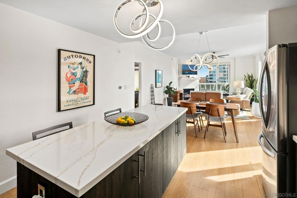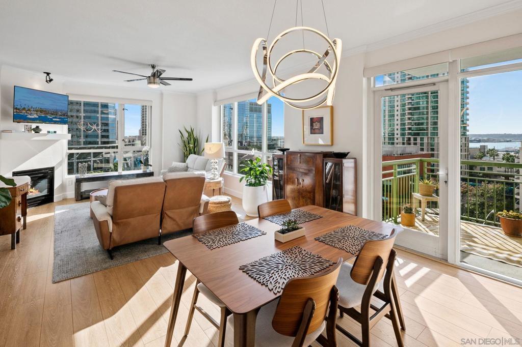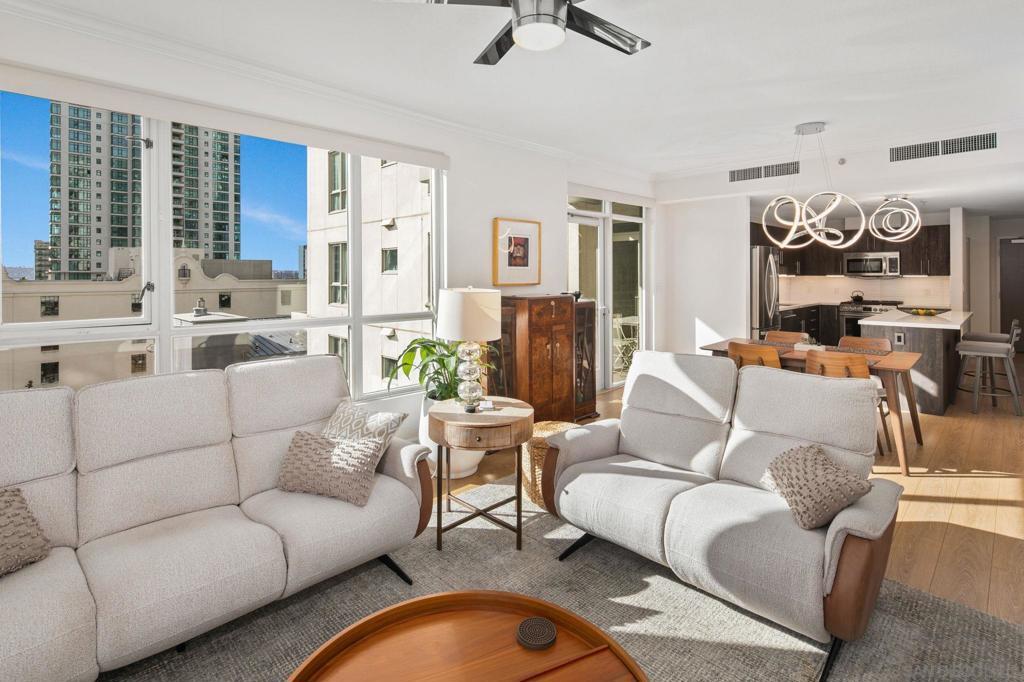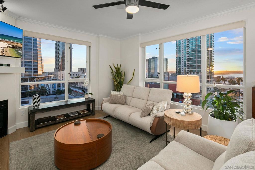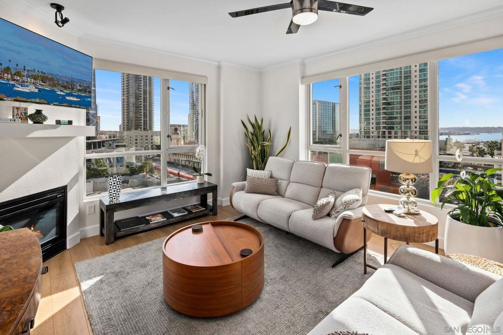 Prime southwest corner residence at Treo in the prestigious vibrant Columbia District/Little Italy, showcasing sweeping panoramic views of the downtown skyline and sparkling bay and waterfront. Offering approximately 1,441 square feet, this beautifully remodeled 2-bedroom, 2-bath plus 3rd room den/office floor plan is elevated by its desirable corner positioning and two private balconies that capture water and city views plus natural light throughout. Designed as a true turnkey opportunity, every detail has already been thoughtfully curated. Luxury vinyl plank flooring flows seamlessly throughout the home, complemented by a stunning remodeled kitchen with sleek quartz countertops, tile backsplash, designer cabinetry and stainless steel appliances. The upgraded bathrooms feature modern finishes and clean, contemporary design. Fresh interior paint enhances the light and airy aesthetic. Two secured parking spaces and dedicated storage add exceptional convenience. Ideally positioned in one of Downtown San Diego’s most walkable neighborhoods, residents enjoy effortless access to the Waterfront Park, Little Italy’s renowned dining scene, the Embarcadero, Seaport Village, Santa Fe Depot, and premier shopping and entertainment. Treo offers resort-style amenities including a lap pool and spa, state-of-the-art fitness center, resident lounge, outdoor BBQ area, on-site management, and secured entry. With its prime location, impeccable condition, and exceptional lifestyle appeal, this residence truly embodies the best of urban luxury living.