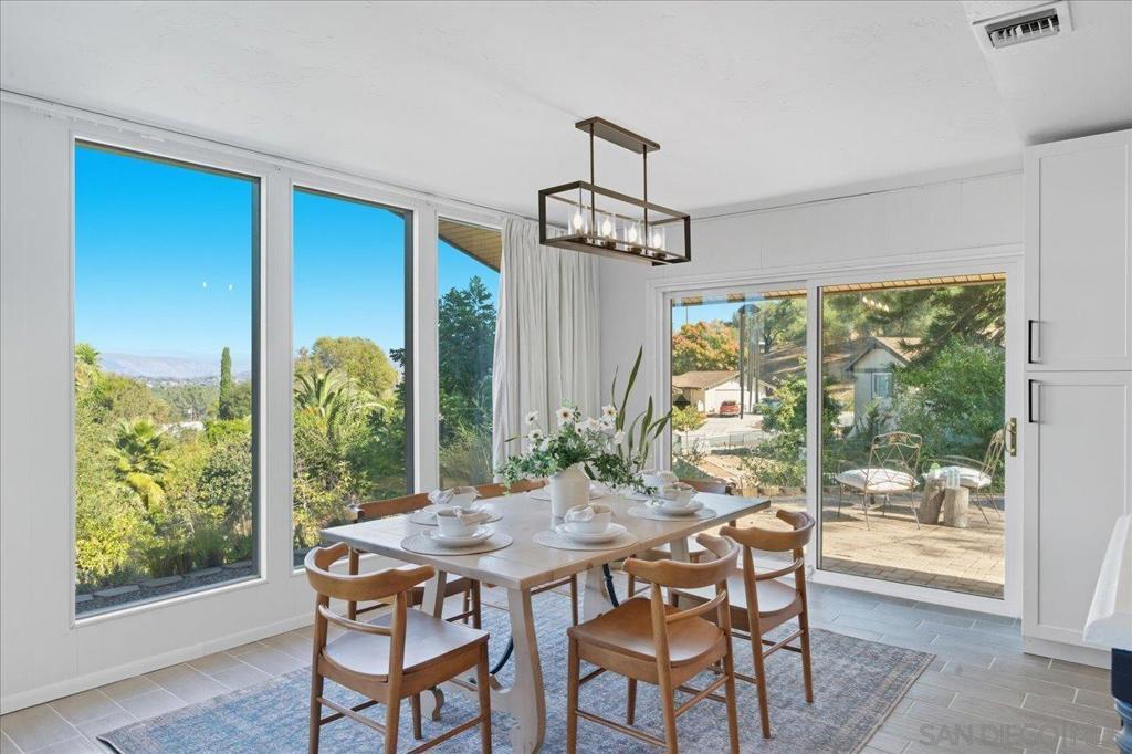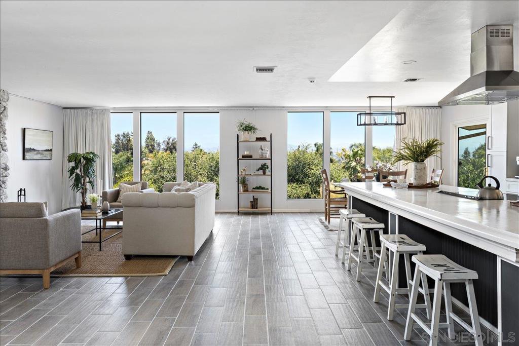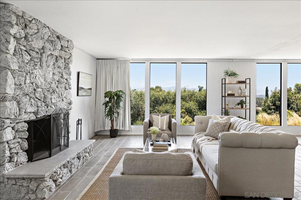 This beautifully updated single-level ranch home is privately situated on a fully gated and cross-fenced three-quarter acre lot in desirable South Escondido. Surrounded by mature landscaping and established fruit trees, the property offers exceptional privacy along with exciting potential for a future ADU. Designed to capture its breathtaking surroundings, the home showcases stunning views of both Palomar Mountain and Laguna Mountain through expansive floor-to-ceiling windows that flood the interior with natural light. The remodeled kitchen is both stylish and functional, featuring quartz countertops, a striking oversized concrete island, stainless steel appliances, white soft-close cabinetry, and an open layout that seamlessly connects to the living and dining areas. The inviting living room offers a cozy fireplace and comfortable sitting area just off the kitchen, ideal for everyday living and entertaining. Sliding glass doors open to a spacious paver patio with outdoor lighting, creating a perfect setting for gatherings or quiet evenings enjoying the mountain views. The home offers four bedrooms and two remodeled bathrooms, with one bedroom ideally suited for an office or flexible use. An indoor laundry room is conveniently located near the bedrooms for everyday ease. Additional highlights include central air conditioning, a leased solar system, and an expansive garage capable of housing up to four vehicles. The garage also includes a bonus half bathroom and offers ample space for workshop use or additional storage. See Supplement.. Ideally located near shopping, dining, parks, schools, and major freeways, this private South Escondido retreat combines comfort, functionality, and scenic beauty in one exceptional property.