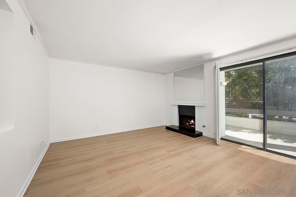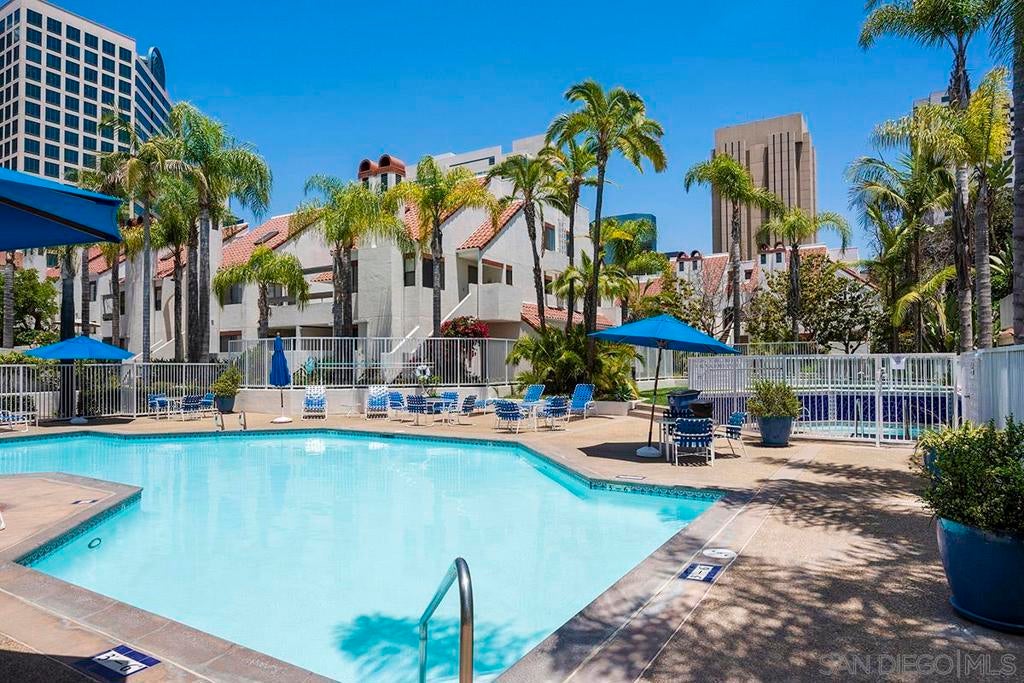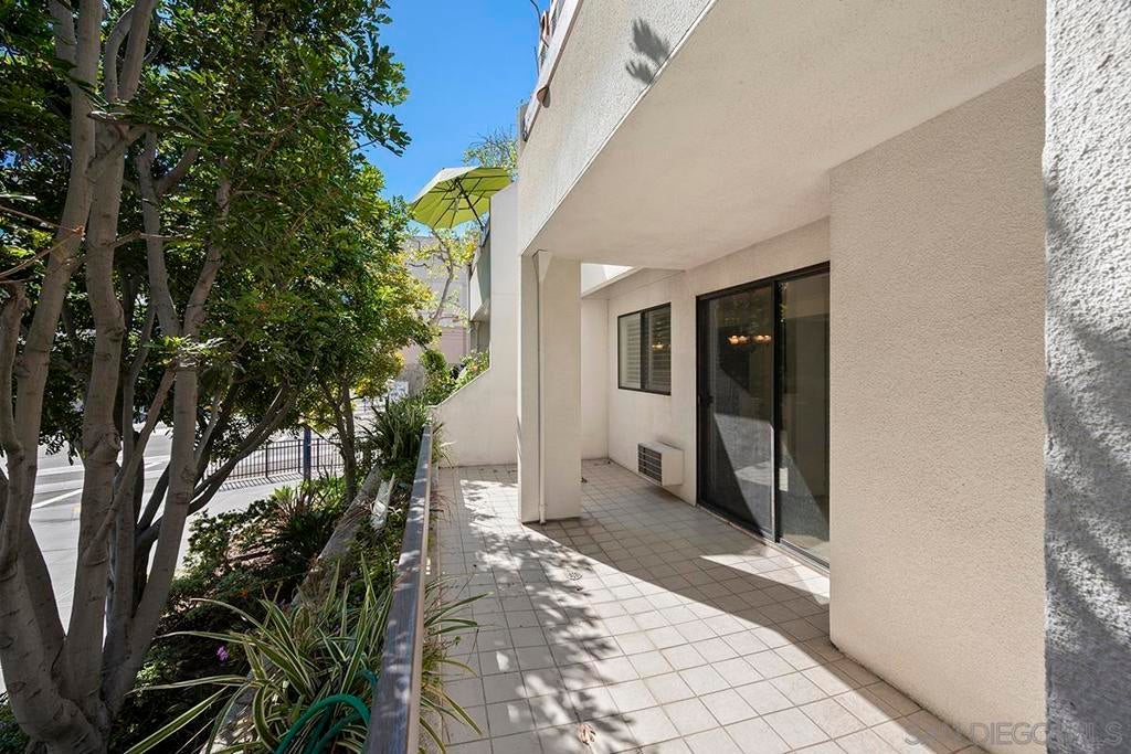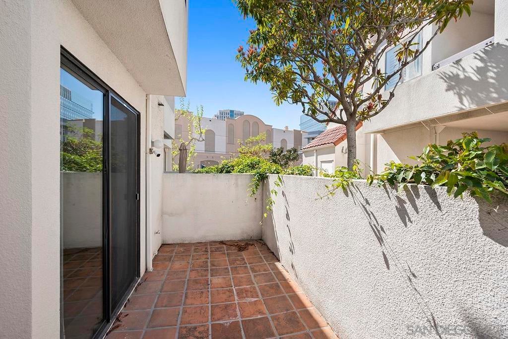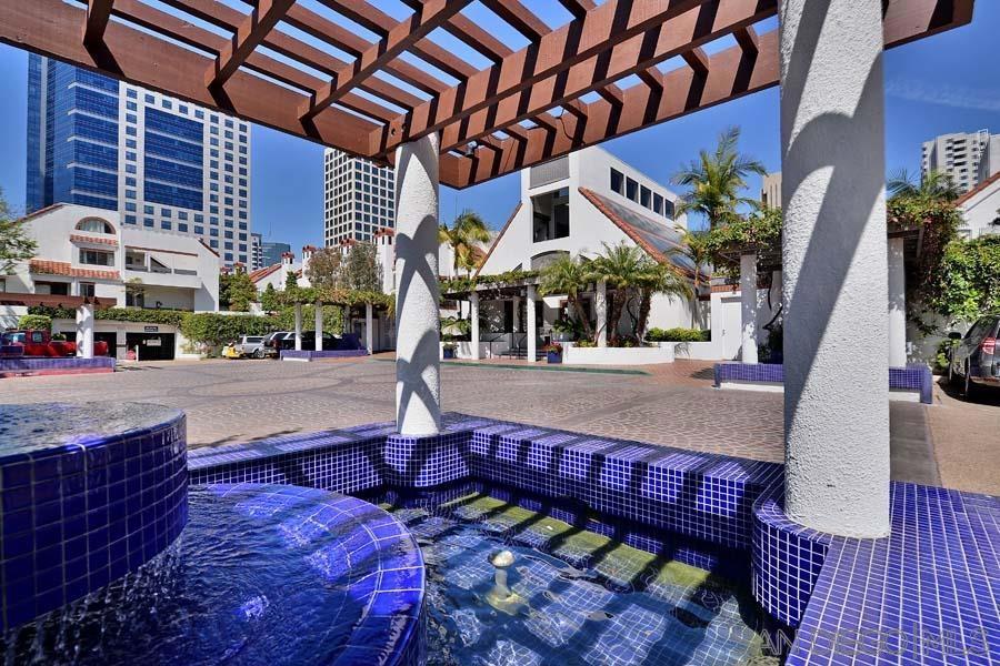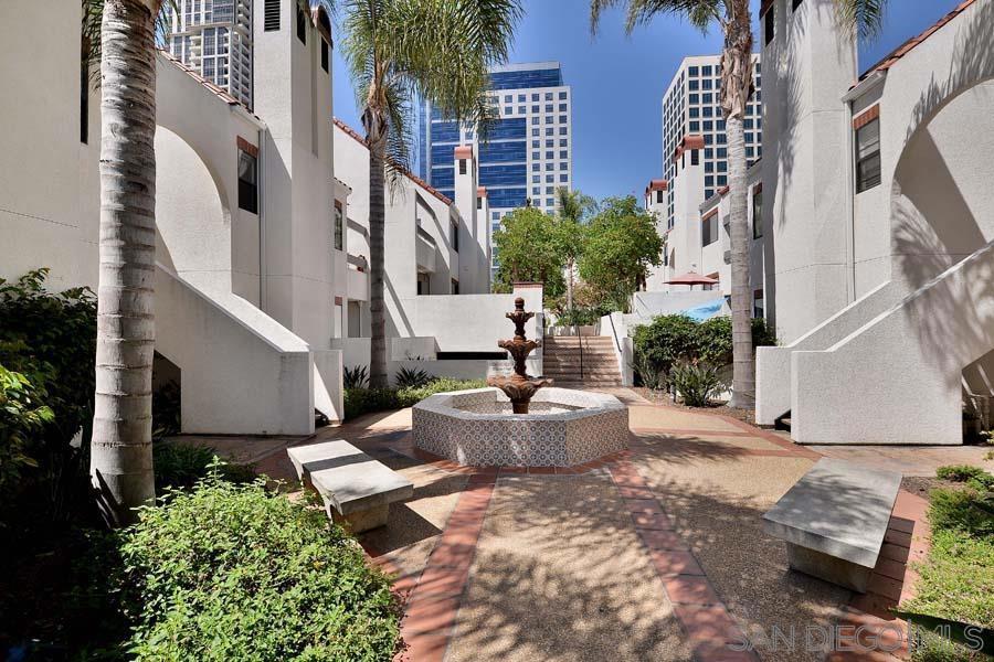 Welcome to this rare, single-level ground-floor residence with 2 bedrooms, 2 bathrooms AND 2 patios! With a bright and open layout and sunlight streaming in from every angle, it’s the kind of home that just feels good the moment you step inside. Enjoy the “Bentwood Tan” luxury vinyl plank flooring throughout, cozy ambient fireplace, and a “refreshed” kitchen with sleek quartz counter, top-notch Samsung appliances, refaced cabinetry and newer fixtures. The spacious primary suite offers dual closets and an ensuite bath with a step-in shower, while both bedrooms open directly to the patios—perfect for seamless indoor-outdoor living. Other features include LED lighting, a bonus storage closet on the patio, a secure parking space, and private storage cabinet. All this in Park Row, one of Downtown’s most charming low-rise communities, known for its lush landscaping, fantastic amenities, and unbeatable walkability. And yes—low HOA dues, too! There is no other development like Park Row in Downtown; beautiful garden-setting with sparkling fountains, a plethora of flowers, trees, real green grass and courtyards to boot. With no elevators, long corridors or hallways; rather “ease of access” walk-up style residences, it offers a serene escape for those seeking the charm of urban living without the high-rise hustle. Nestled beside the historic Pantoja Park, this tranquil community invites you to stroll to The Headquarters, Seaport Village, the Gaslamp Quarter, and the scenic waterfront, with Downtown San Diego's cultural highlights just steps away. Beautifully landscaped grounds enhance the peaceful ambiance, while amenities such as clubhouse, year-round heated pool, and spa create a relaxing retreat. Plentiful visitor parking is an added perk, and additional parking, storage options, bike storage, and an EV charging station are available through the HOA. Embrace the perfect balance of city convenience and peaceful living at Park Row—welcome home!