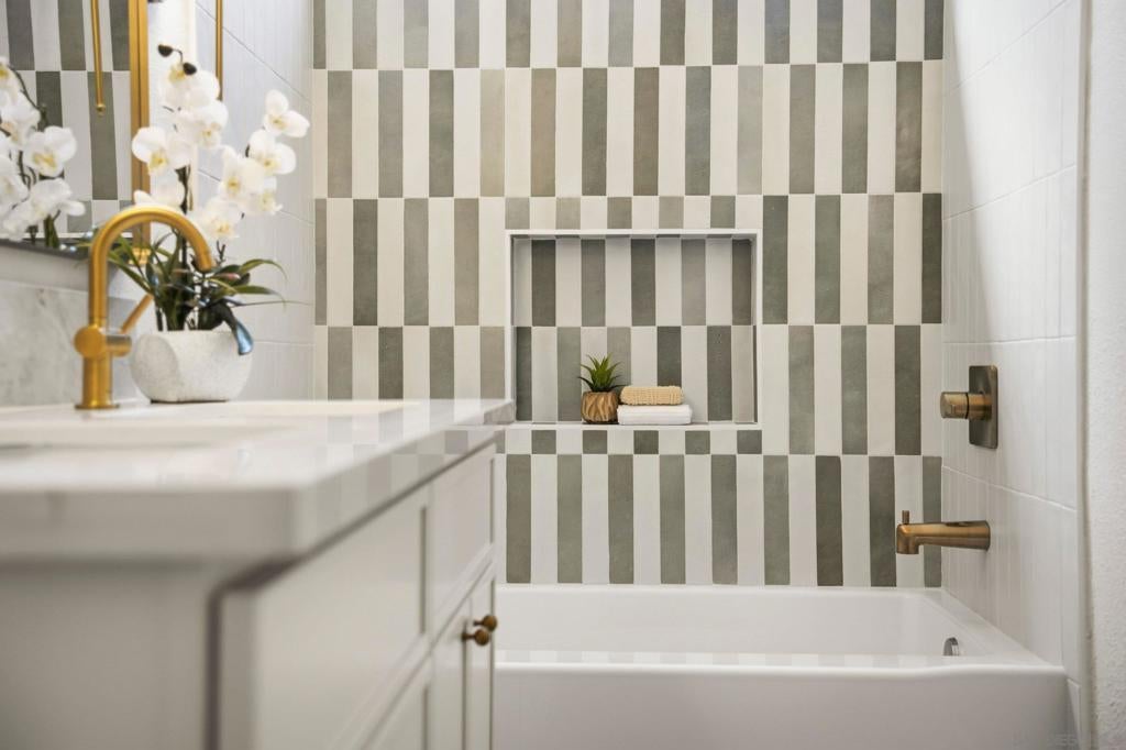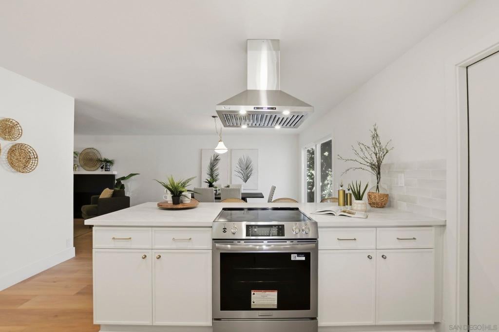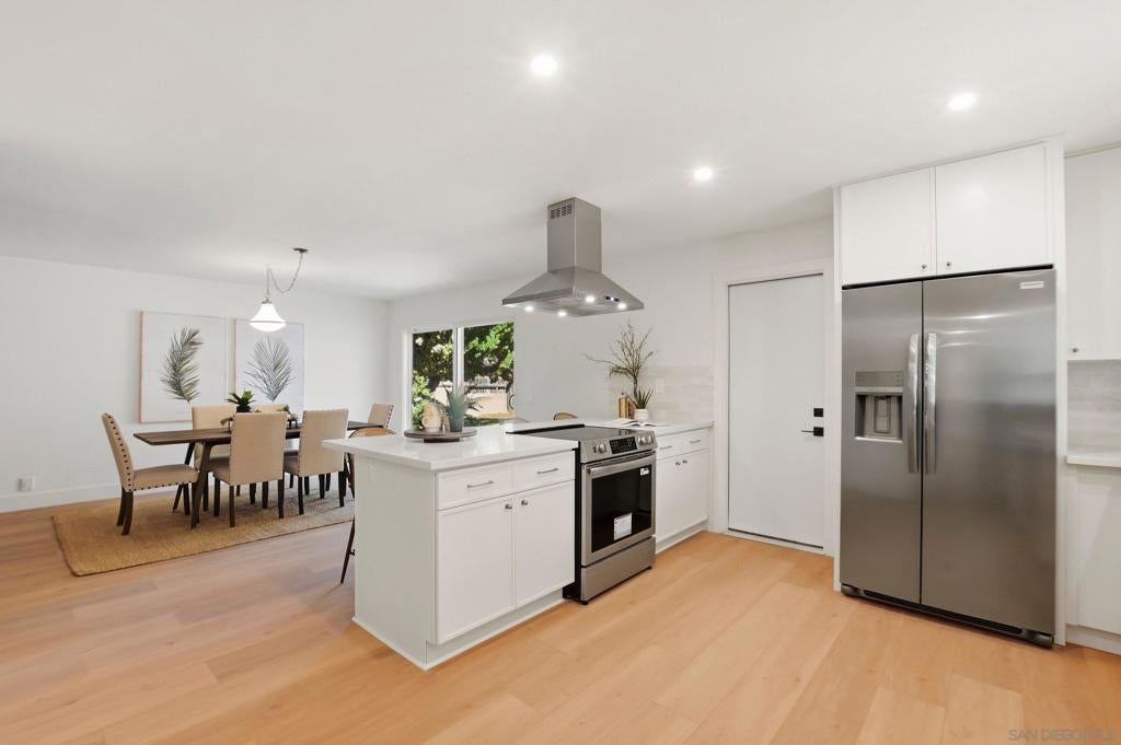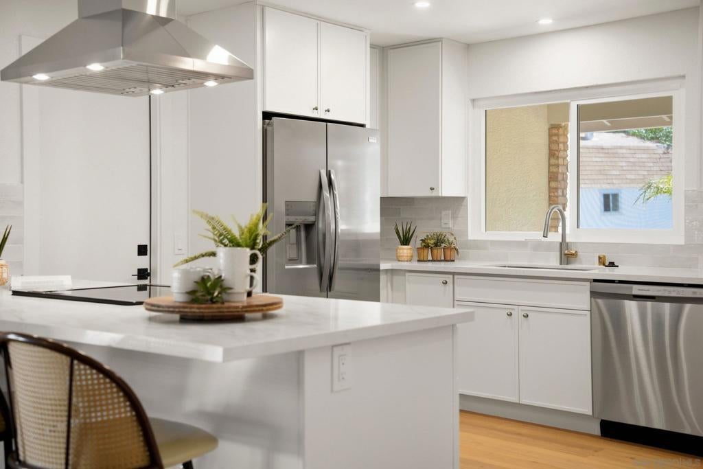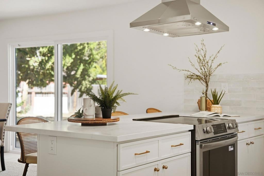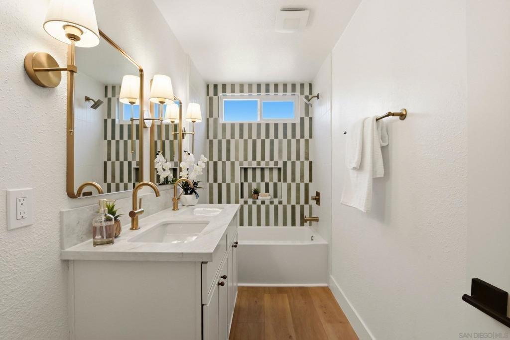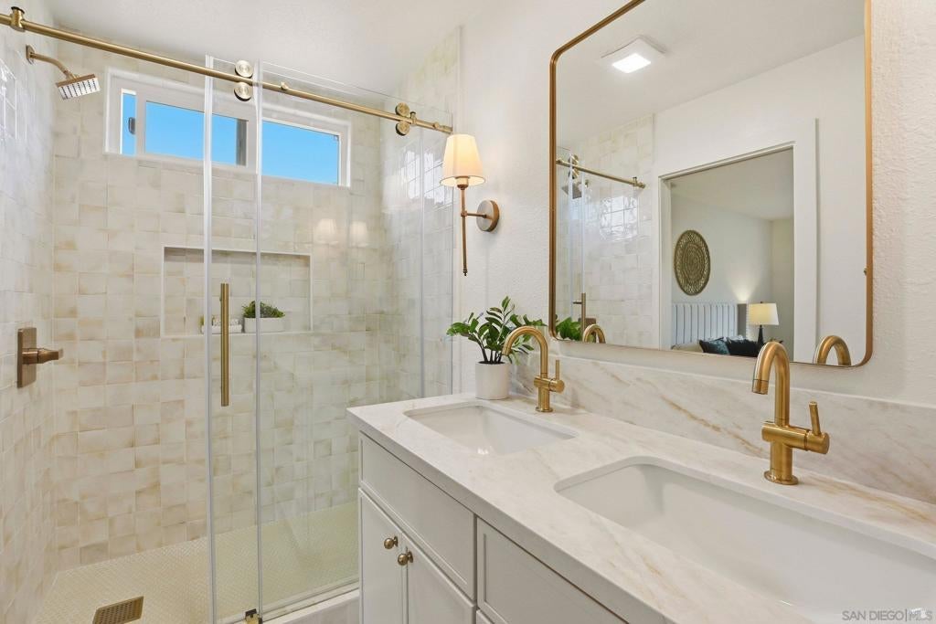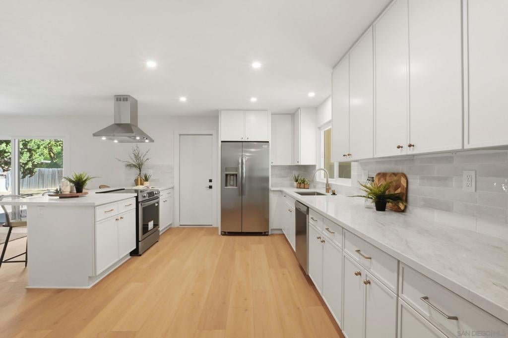 Welcome to your own private retreat in Vista, situated on an expansive .9-acre usable lot. This beautifully renovated home blends modern design with warm finishes, offering space, style, and functionality inside and out. The heart of the home is the expansive open-concept kitchen, featuring crème slim shaker cabinetry, all-new appliances, marbled quartz countertops, and a timeless tile backsplash. The adjoining living room is highlighted by modern light fixtures and a striking fluted black tile fireplace — the perfect centerpiece for gatherings. Both bathrooms are thoughtfully designed with dual vanities and matching slim shaker cabinetry. The shared bath makes a bold statement with a forest green checkered tile surround paired with brushed bronze finishes for a perfect pop of character. The primary suite offers a sleek, modern aesthetic with pearl Bedrosian tile surround and a custom niche for a clean, spa-like feel. Throughout the home you’ll find fresh interior paint, new baseboards, recessed can lighting, and oak-toned Luxury Vinyl Plank flooring that ties everything together beautifully. The true standout is the lot — nearly a full acre of usable space, a brand-new driveway, and two massive storage sheds ideal for a workshop, studio, playroom, home gym, or extra storage. This is the perfect blend of privacy, modern renovation, and room to grow — a rare Vista opportunity.