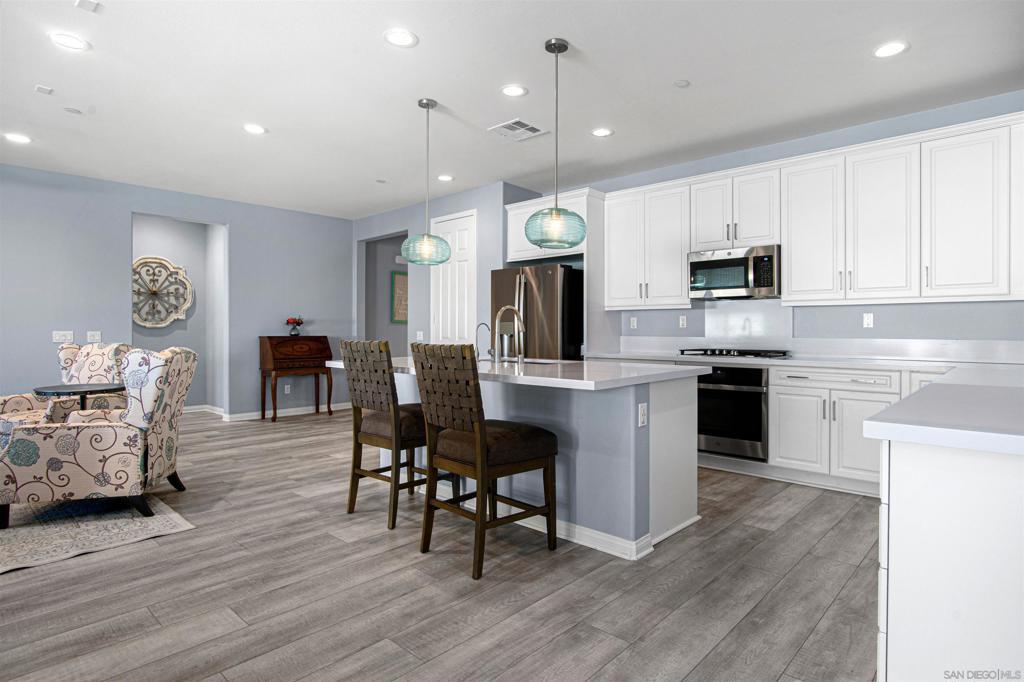 Built in 2023, this upgraded single-level home in Park Circle offers 3 bedrooms, 2 full bathrooms, and a private den with French doors, across approximately 2,082 square feet. Luxury vinyl plank flooring flows through an open layout, anchored by a spacious great room with a gas fireplace. The kitchen features quartz countertops, large island with sink and RO water, a spacious pantry, accented with a stainless steel appliance suite including a French door refrigerator, built-in oven, 30” 5-burner gas cooktop, vented microwave, and dishwasher. Enjoy quiet mornings with sunlight across the kitchen, focused workdays in the private den, and relaxed evenings gathered around the fireplace. The primary suite offers a comfortable retreat, with cultured marble surfaces, spacious walk-in shower, and large walk-in closet. The split floor plan: 2nd & 3rd bedrooms share a well-appointed full bath with cultured marble surfaces as well. Owned solar, whole-house water treatment, ceiling fans, Ring doorbell system, Wi-Fi enabled garage door opener, thermostat, and fire/carbon detectors add efficiency and convenience. The backyard is designed for use, featuring a covered patio, turf, hardscaping, irrigation, lighting, a water fountain, and a custom 4-hole putting green! Park Circle residents enjoy access to community pools, clubhouses, fitness center, parks, and walking trails, with easy access to I-15 for commuting. Multiple casinos are within a 15-minute drive. Move-in ready with modern finishes and lifestyle-focused upgrades.