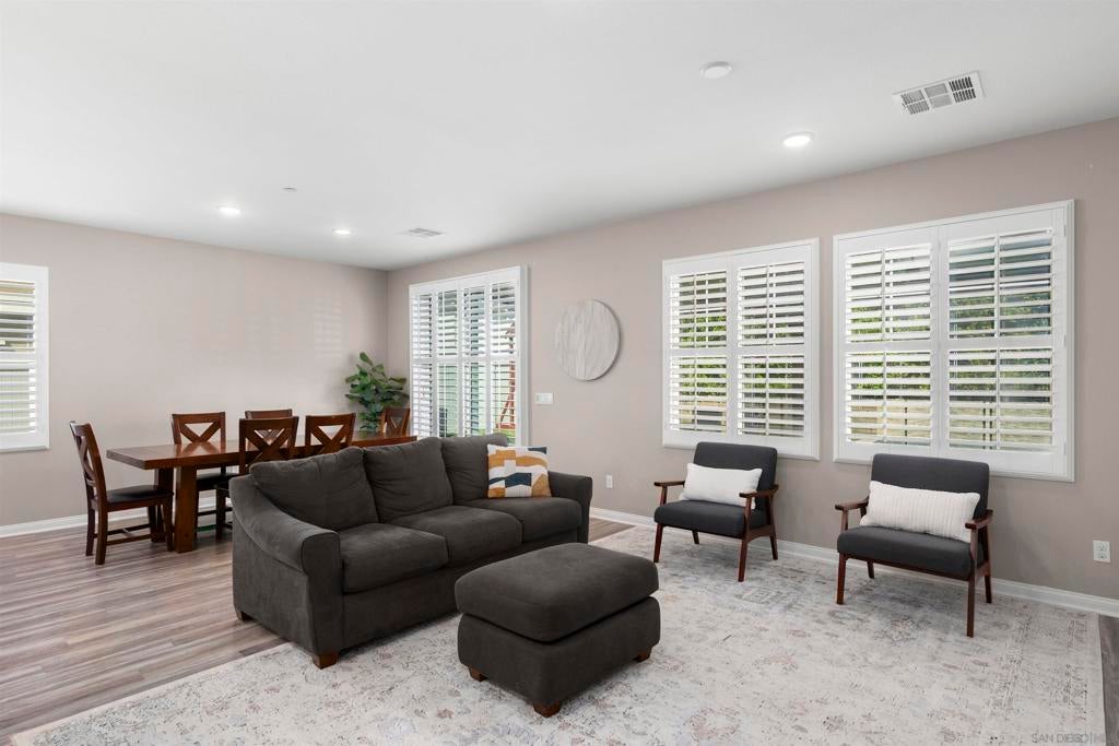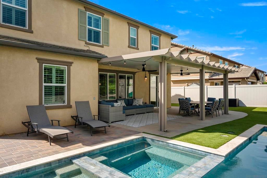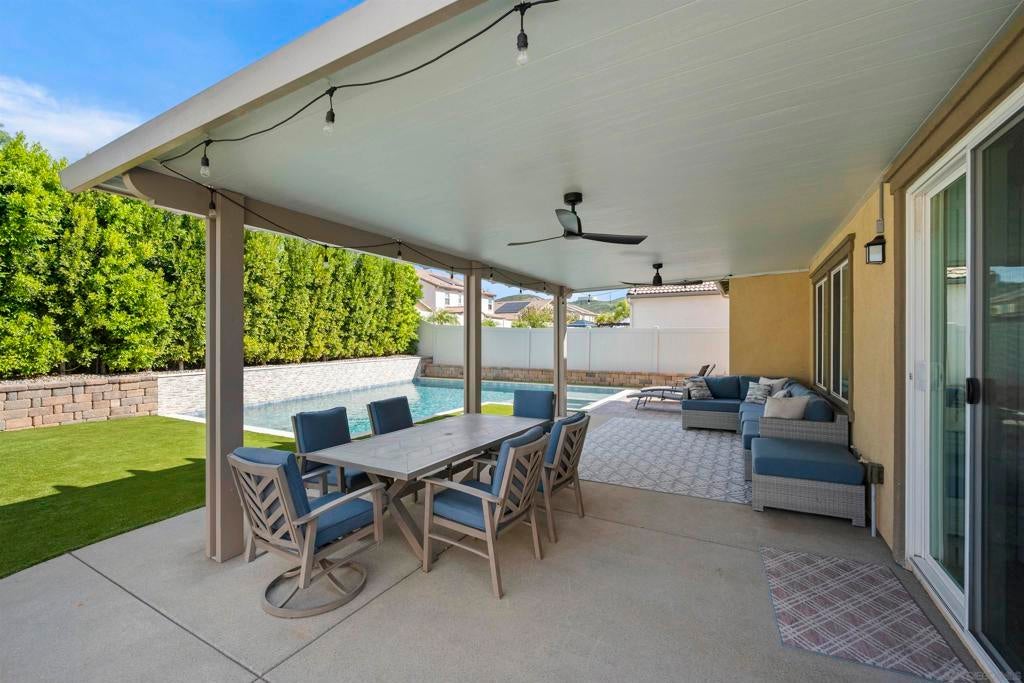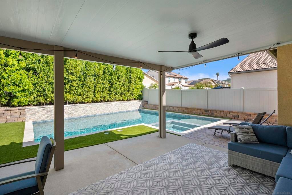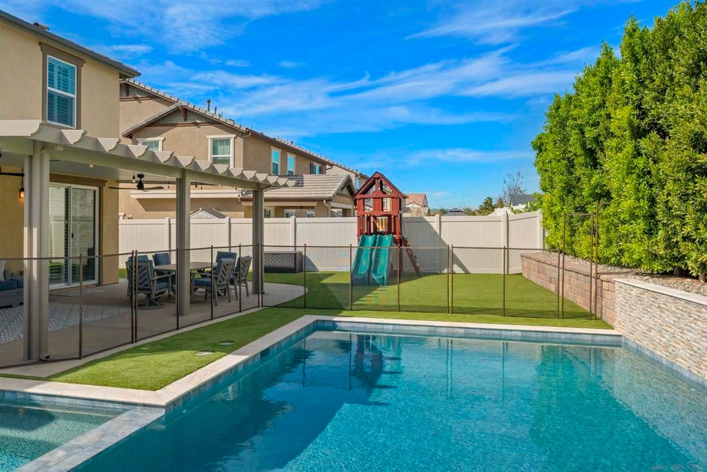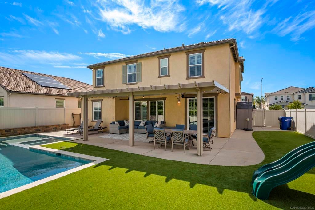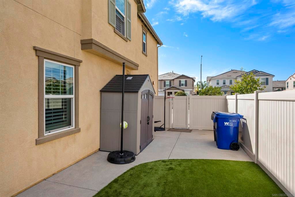 This beautifully appointed 4-bedroom, 3.5-bath, 2-story home offers the perfect blend of modern comfort and outdoor luxury. Tucked away on a quiet cul-de-sac, it provides a serene escape with premier access to nature. The main level boasts a great room, a 2nd primary bedroom, and a living/study area, while the upper level serves as a private retreat for the family. The yard is designed for gatherings, offering ample space for outdoor dining and poolside play. Easy care yard. Play structure can convey. Paid solar too! Enjoy the ultimate Southern California lifestyle with the Walker Preserve Trail within walking distance. This 1.3-mile flat, well-maintained path is perfect for walking, jogging, or cycling along the San Diego River. Summer concerts in the park and so much more that Santee has to offer. LVP flooring. Smart irrigation system. Patio features ceiling fans. Portable pool safety fence. Shed in the side yard conveys. Extra room measurements - loft area. Great Community - Community Easter Egg Hunt, Block Party, and others throughout the year!