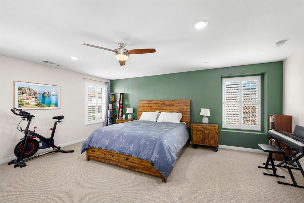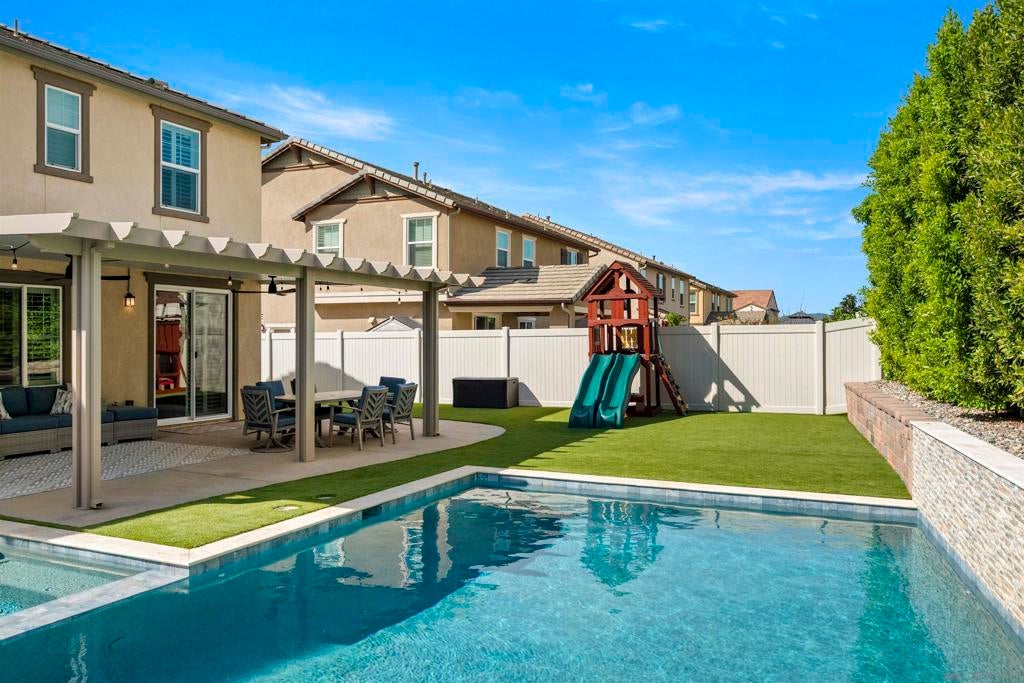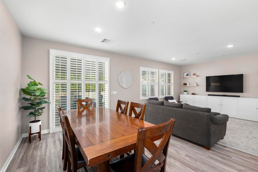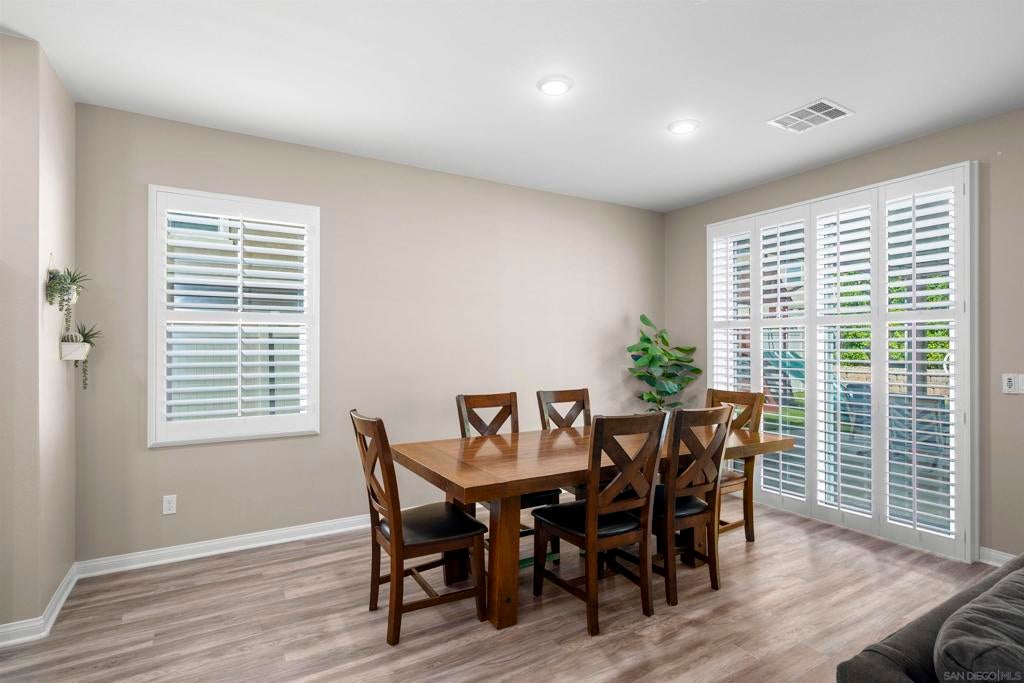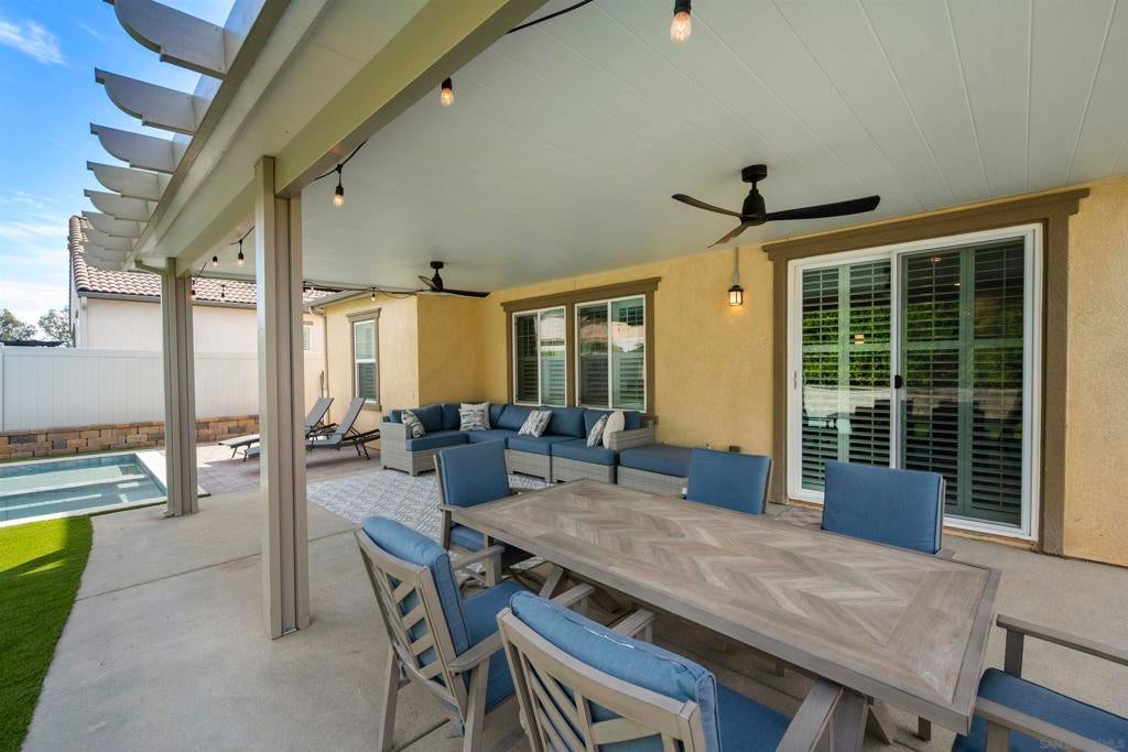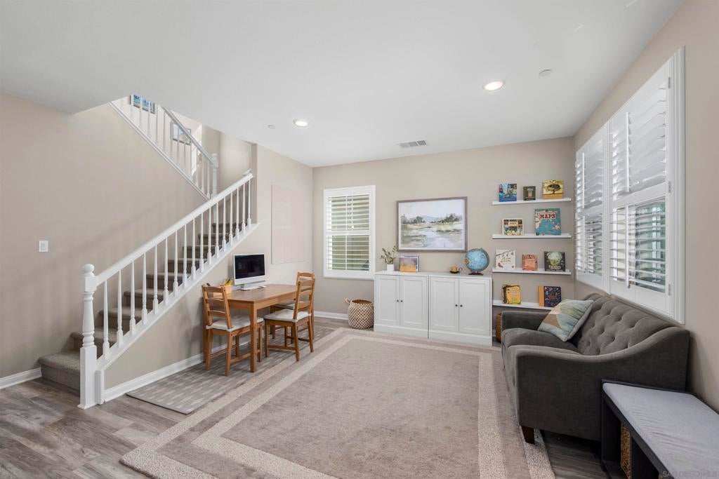 This beautifully appointed 4-bedroom, 3.5-bath, 2-story home offers the perfect blend of modern comfort and outdoor luxury. Tucked away on a quiet cul-de-sac, it provides a serene escape with premier access to nature. The main level boasts a great room, a 2nd primary bedroom, and a living/study area, while the upper level serves as a private retreat for the family. The yard is designed for gatherings, offering ample space for outdoor dining and poolside play. Easy care yard. Play structure can convey. Paid solar too! Enjoy the ultimate Southern California lifestyle with the Walker Preserve Trail within walking distance. This 1.3-mile flat, well-maintained path is perfect for walking, jogging, or cycling along the San Diego River. Summer concerts in the park and so much more that Santee has to offer. LVP flooring. Smart irrigation system. Patio features ceiling fans. Portable pool safety fence. Shed in the side yard conveys. Extra room measurements - loft area. Great Community - Community Easter Egg Hunt, Block Party, and others throughout the year!