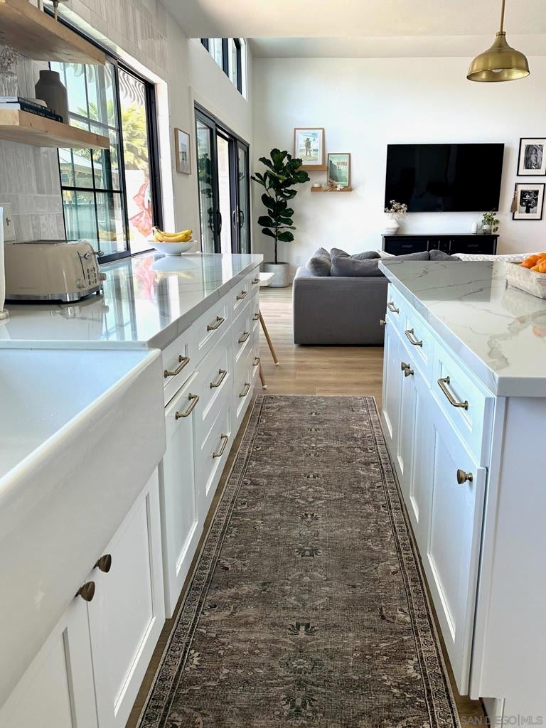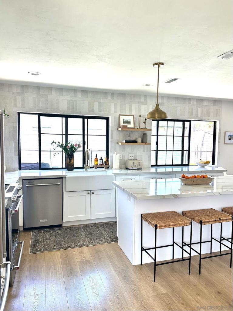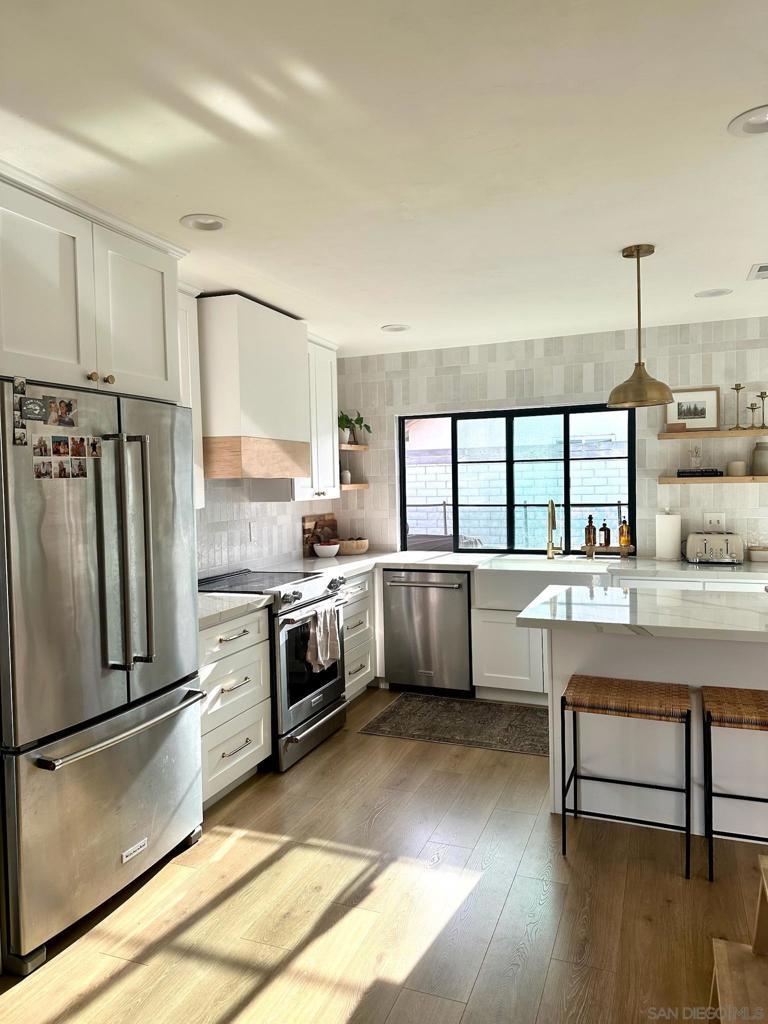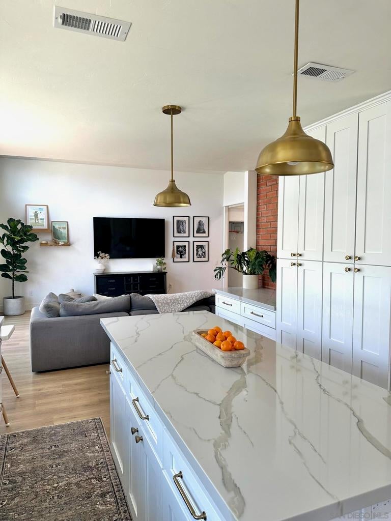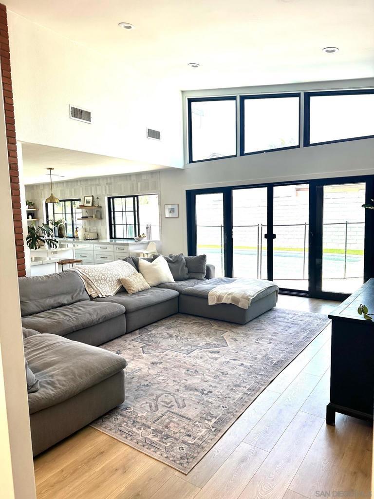 In the heart of Poway! This beautifully updated single-story 4-bedroom, 2-bath home (1,935 sq ft on a 6,900 sq ft lot) blends modern upgrades with low-maintenance living. Built in 1974 and extensively renovated, it's move-in ready with over $150K+ in recent improvements. Step inside to bright, open living spaces featuring fresh laminate flooring throughout, new baseboards, a new skylight, enlarged living room window, and sleek new sliding doors opening to the backyard oasis (See Supplement for Additional Upgrades) The show-stopping kitchen (remodeled 2021-2022) boasts raised ceilings, recessed lighting, new cabinets, stone island & countertops, tile backsplash to ceiling, pantry, new sink, appliances, and windows. The primary suite (updated 2023) offers laminate floors, new closet doors, and a spa-inspired bath with tile flooring/shower, new dual-sink vanity, shiplap accent wall, modern fixtures, and seamless open layout. The guest bath (2023) mirrors the upgrades with new tile, vanity, shiplap, toilet, mirror, and lighting. Outside, enjoy your private solar-heated below-ground pool (remodeled 2021 by Gardner Pools, $26K) with new plaster, tile, coping, Baja shelf + umbrella sleeve, and removable safety fence—perfect for year-round enjoyment. The fully remodeled backyard (2021, $30K) features premium pavers, low-maintenance artificial turf (System Pavers), gazebo, privacy fencing, and a new shed for pool equipment. Recent 2024 full roof replacement adds peace of mind.
