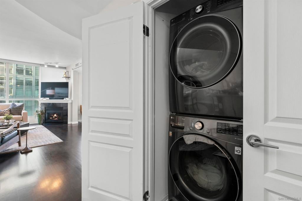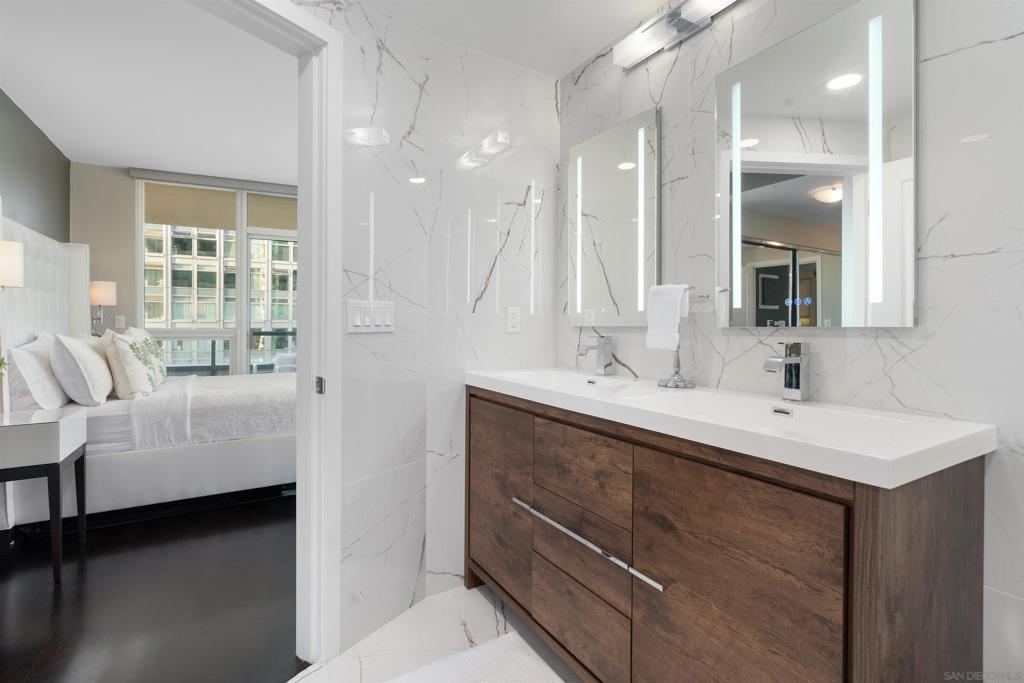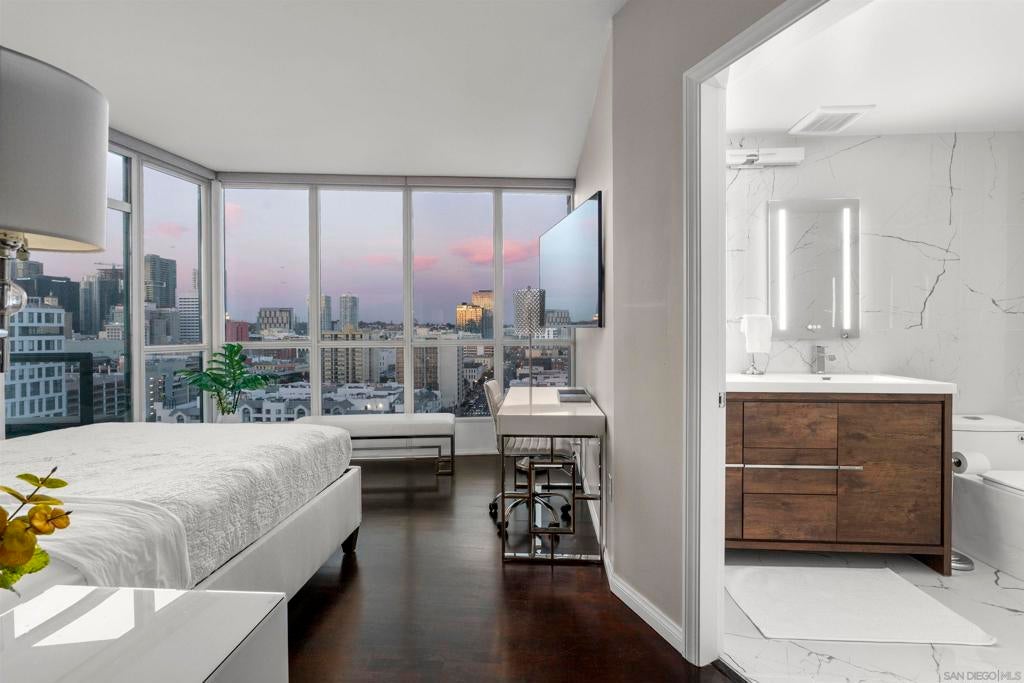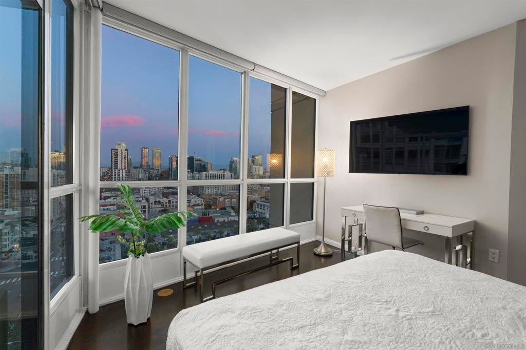 Enjoy stunning north-facing views of San Diego Bay and the Downtown skyline from this professionally designed 1-bedroom + den, 2-bath residence. Bright, open living spaces feature expansive windows and a spacious private patio ideal for indoor-outdoor living. The primary suite offers floor-to-ceiling windows, patio access, custom built-ins, a workspace, and an ensuite bath with dual sinks and a walk-in shower. A flexible den serves as a lounge or guest space with direct patio access. Offered fully furnished with designer pieces (approx. $30,000 value) from Arhaus, Pottery Barn, and Crate & Barrel, may be included at no additional cost and conveyed in current condition at close of escrow. Ideally located in the heart of the Marina District, Horizons offers an unbeatable downtown lifestyle just steps from the New Children’s Museum, Martin Luther King Jr. Promenade, Seaport Village, Petco Park, the Gaslamp Quarter, San Diego Bay, and the Marina. A children’s park and dog park are located directly behind the community. Resort-style amenities include a pool, spa, BBQ area, fitness center, concierge, security, billiard room, conference and club rooms, and 16 guest parking spaces. Everyday convenience is built in with retailers just an elevator ride away, including a bank, dry cleaner, Postal Annex, coffee shop, and more. The building has been refreshed with beautifully remodeled lobbies, upgraded hallways, and new unit doors with keypad access, all within walking distance to transit, dining, shopping, and Ralphs Signature Market.