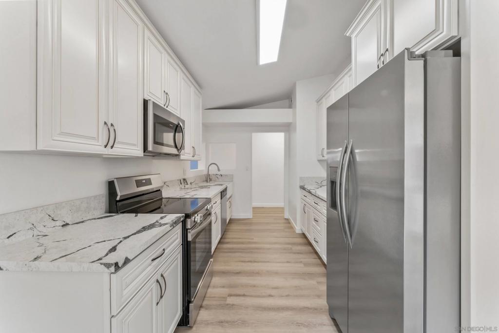 This tastefully remodeled 4-bedroom plus office (optional 5th bedroom), 2-bath home captures the ultimate So-Cal beach vibe. Behind the charming white picket fence, you'll find a light-filled sanctuary featuring, skylights, vaulted ceilings and brand-new luxury wood-grain plank flooring throughout. Enjoy a new designer kitchen with all-new cabinets, sleek granite countertops, a classic farmhouse sink, and premium stainless-steel appliances. Save time and money with low-maintenance living and energy efficiency, owned solar, a newer roof and water-saving turf in the fully fenced front yard. This turnkey gem is a must-see!