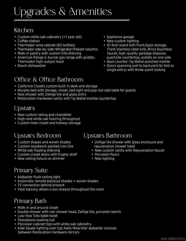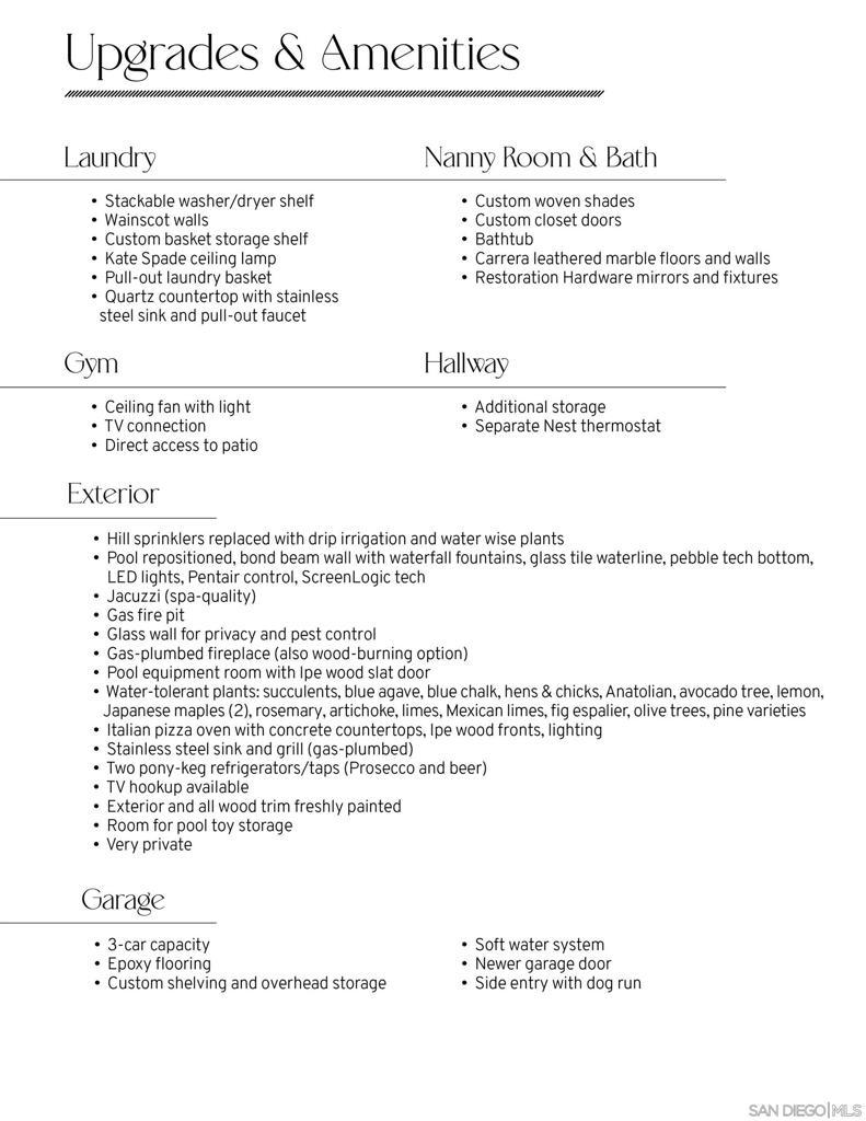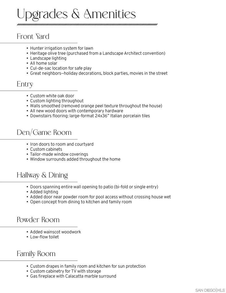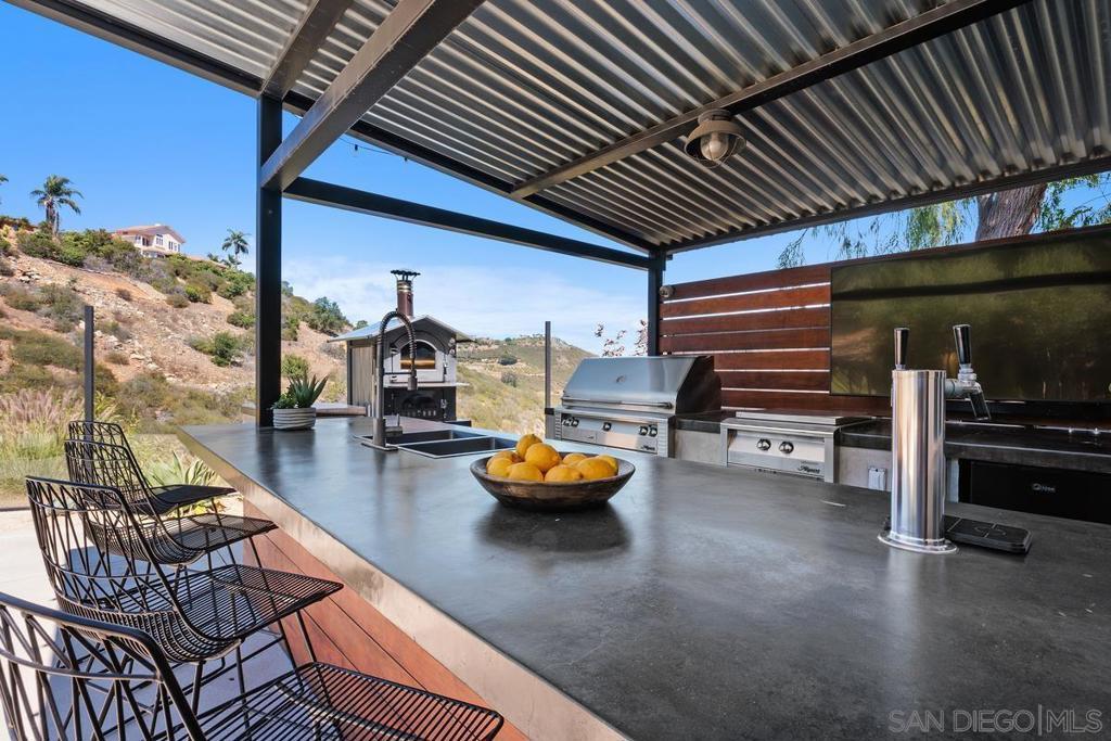 Located on one of the largest and most private lots in San Elijo Hills, this exceptional property backs to serene open space with sweeping greenbelt views. Every inch of this exquisite property has been thoughtfully upgraded with high-end finishes typically reserved for custom-built homes. The backyard is a modern paradise designed for ultimate entertaining. Enjoy a sparkling salt water pool,in-ground Jacuzzi and a fully equipped outdoor kitchen complete with a premium grill,two refrigerators,pizza oven and beer on tap. A stunning Cucina style courtyard fireplace,plumbed for gas or real wood,creates a warm and inviting ambiance for year round gatherings. A gorgeous glass viewing wall spans the backyard, framing the lush backcountry views while maintaining privacy. Inside, the home continues to impress. The custom kitchen,fully remodeled in 2025,showcases Taj Mahal marble,custom french oak cabinetry, a spacious island with abundant storage and quartzite countertops, built in refrigerator, full size wine refrigerator and exquisite custom lighting. The primary bathroom,also remodeled in 2025,is a spa inspired retreat featuring a spacious walk-in family shower, soaking tub, bidet and new designer tile flooring. All secondary bathrooms have been completely renovated, including elegant floor to ceiling tile work, oak cabinetry and Restoration Hardware fixtures. Two sets of panoramic doors allow a fully open floorpan for indoor outdoor living. Simply too many upgrades to list, please see supplemental remarks. A Rare Opportunity to own one of the Finest Homes in San Elijo Hills! An extensive Upgrades List has been included for your review (see final 3 photos). The home features a flexible floor plan including a downstairs en-suite bedroom with California Closet built-ins and a Murphy bed. Upon entering gorgeous iron doors open to the media room with built in oak cabinetry and a second set of iron doors open to the courtyard and Cucina fireplace. This home was designed with the quintessential southern California lifestyle in mind. Open concept living, panoramic door walls for seamless indoor outdoor entertaining, several spaces for cozy family moments, even an outdoor shower and fire pit. New A/C units, new hot water heater and owned solar are just some of the other amenities worth mentioning.