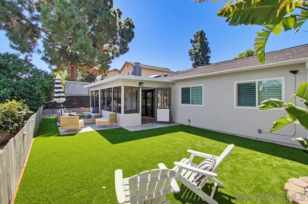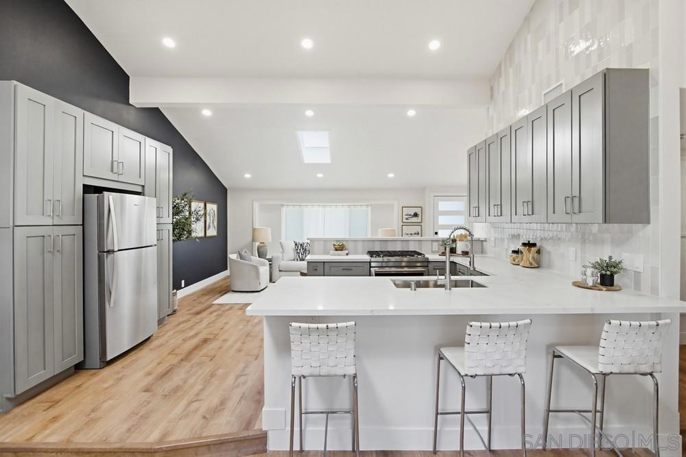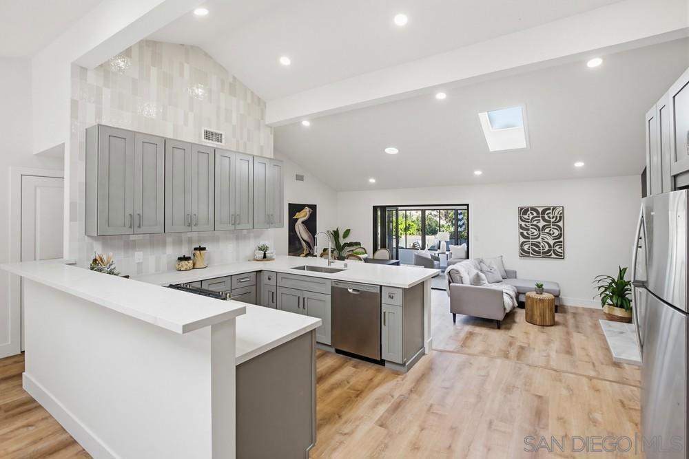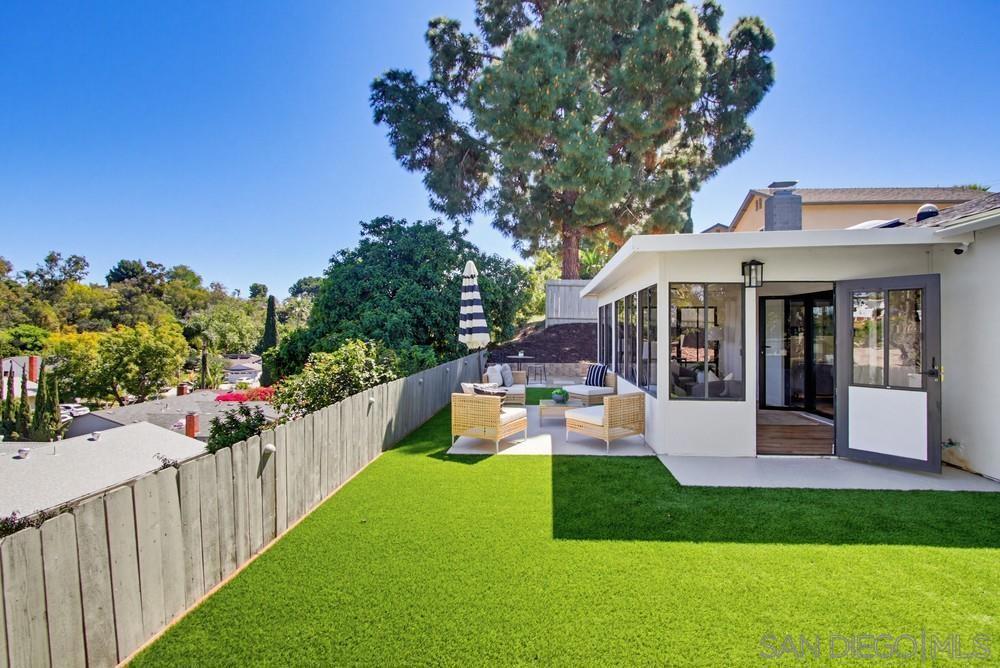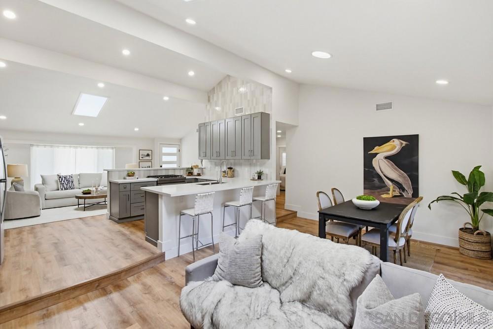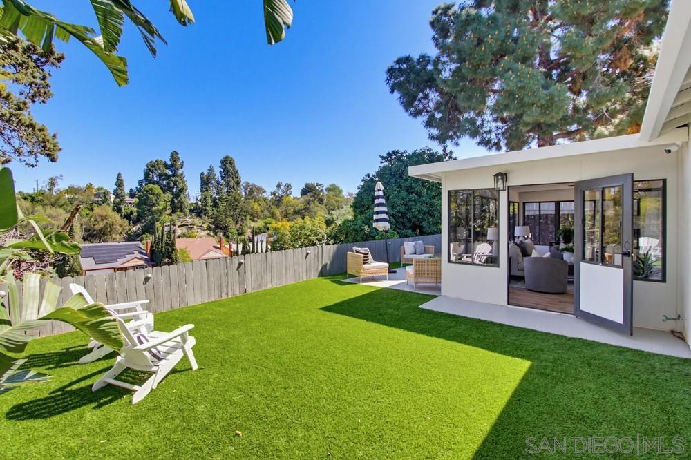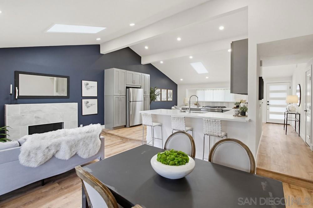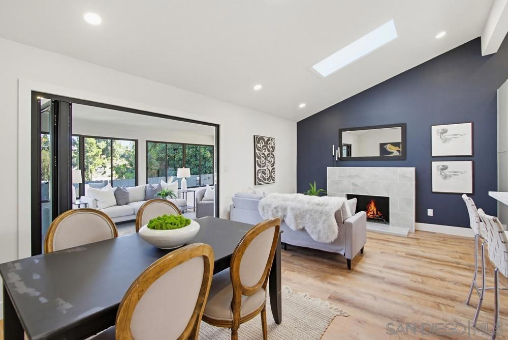 Vaulted ceilings and dramatic bi-folding doors set the tone for this beautifully upgraded single-level home located north of Adams Ave near the El Cerrito/Talmadge border. The main living space opens wide to the backyard through expansive folding doors, creating seamless indoor/outdoor living and framing peaceful canyon views. The open-concept layout centers around a light-filled great room where the kitchen, dining, and living areas flow together, ideal for modern living and entertaining. The remodeled kitchen features quartz countertops, custom soft-close cabinetry, and abundant storage while overlooking the main gathering space. Interior upgrades include luxury vinyl plank flooring, recessed lighting, and designer finishes throughout. Both bathrooms have been fully renovated with custom tile work, modern vanities, and upgraded fixtures, including a primary suite shower with illuminated niche lighting. This home delivers immediate curb appeal and a private backyard with canyon views that feels tucked away yet connected to the home through the dramatic bi-fold doors. Additional features include a 2-car garage, ample off-street parking, and a 3-year home buyer warranty. Located minutes from SDSU, parks, restaurants, and major freeway access!