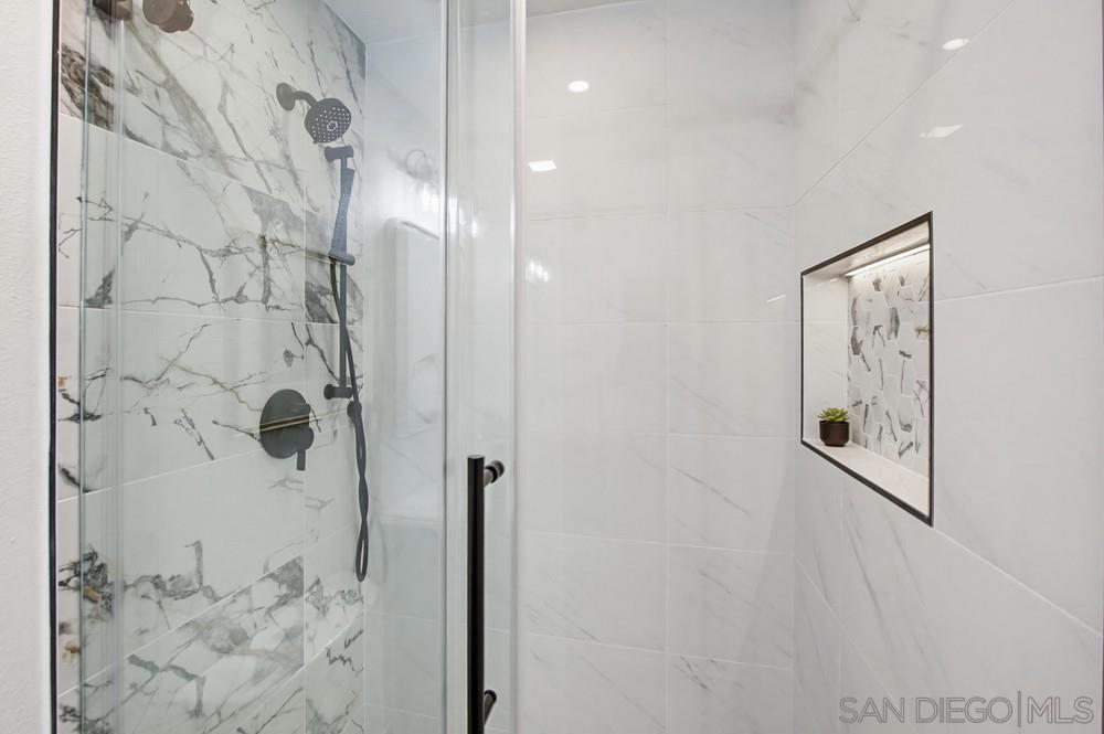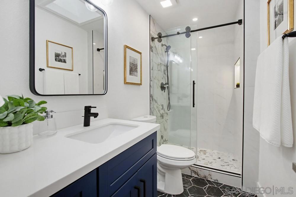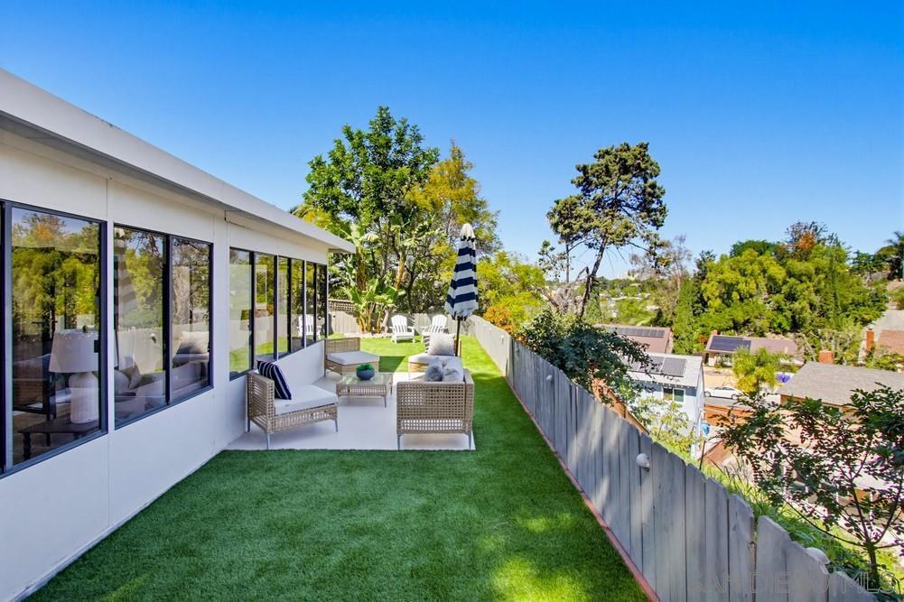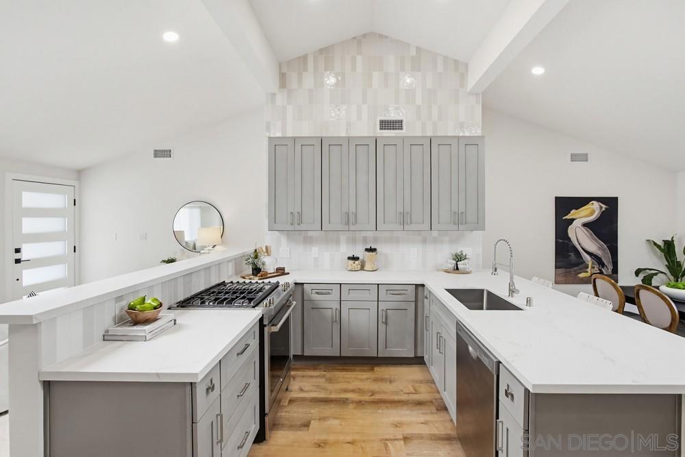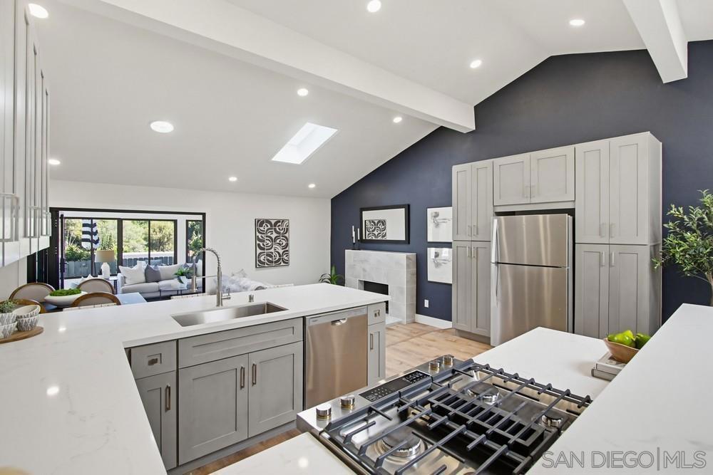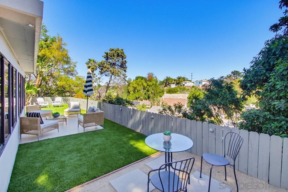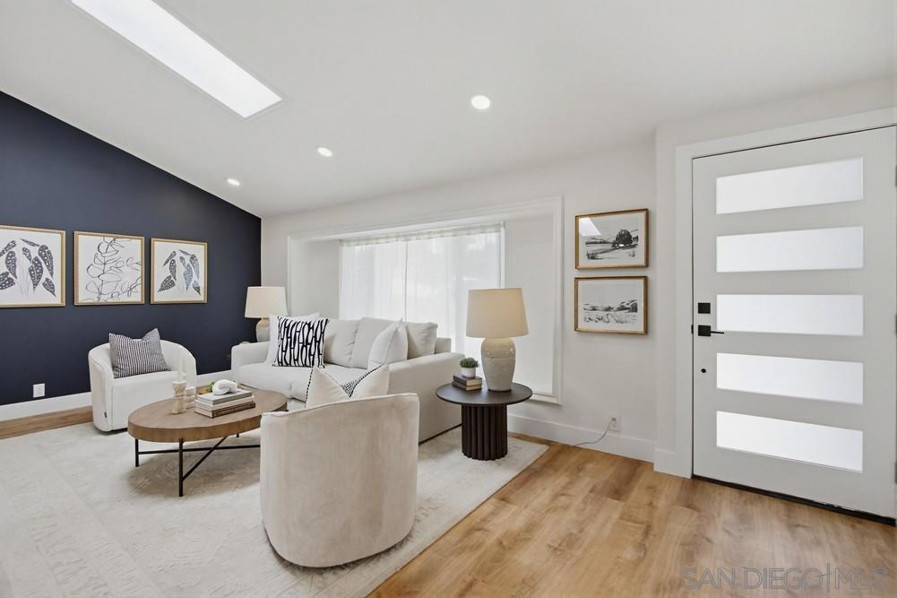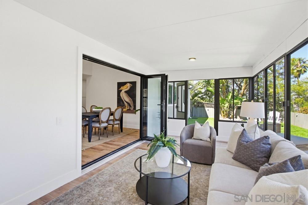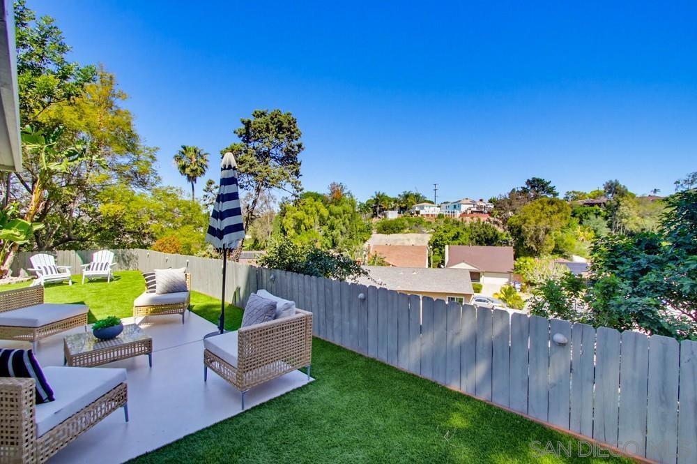 Vaulted ceilings and dramatic bi-folding doors set the tone for this beautifully upgraded single-level home located north of Adams Ave near the El Cerrito/Talmadge border. The main living space opens wide to the backyard through expansive folding doors, creating seamless indoor/outdoor living and framing peaceful canyon views. The open-concept layout centers around a light-filled great room where the kitchen, dining, and living areas flow together, ideal for modern living and entertaining. The remodeled kitchen features quartz countertops, custom soft-close cabinetry, and abundant storage while overlooking the main gathering space. Interior upgrades include luxury vinyl plank flooring, recessed lighting, and designer finishes throughout. Both bathrooms have been fully renovated with custom tile work, modern vanities, and upgraded fixtures, including a primary suite shower with illuminated niche lighting. This home delivers immediate curb appeal and a private backyard with canyon views that feels tucked away yet connected to the home through the dramatic bi-fold doors. Additional features include a 2-car garage, ample off-street parking, and a 3-year home buyer warranty. Located minutes from SDSU, parks, restaurants, and major freeway access!