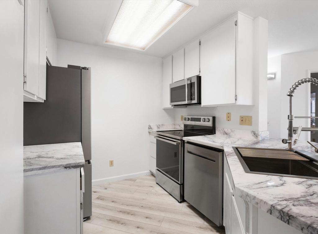 Panoramic hillside views overlooking Mission Valley highlight this beautifully upgraded ground-floor condo in the sought-after City Scene community. This spacious 3-bedroom, 2-bath home offers approximately 1,271 sq ft of comfortable living space in a prime central San Diego location. The open and inviting interior features luxury vinyl plank flooring, fresh interior paint, and a bright living area with a cozy fireplace. The upgraded kitchen showcases elegant marble countertops and ample space for cooking and entertaining. A standout feature is the seamless indoor-outdoor living. Sliding doors from the living room, primary bedroom, and second bedroom open directly to a private patio capturing eye-catching mountain and valley views above Mission Valley—perfect for morning coffee, relaxing evenings, and enjoying San Diego’s year-round coastal climate. The primary suite includes a remodeled bathroom with dual vanities and an updated shower enclosure, while additional bedrooms offer flexibility for guests, a home office, or extra living space. Additional highlights include three parking spaces, including a private tandem garage plus an additional permitted space. City Scene amenities include a pool, spa, fitness center, and BBQ areas. Ideally located near Fashion Valley Mall, Snapdragon Stadium, several naval bases, major freeways, beaches, universities, and downtown San Diego. The property is also available for rent at $3,700/monthly.