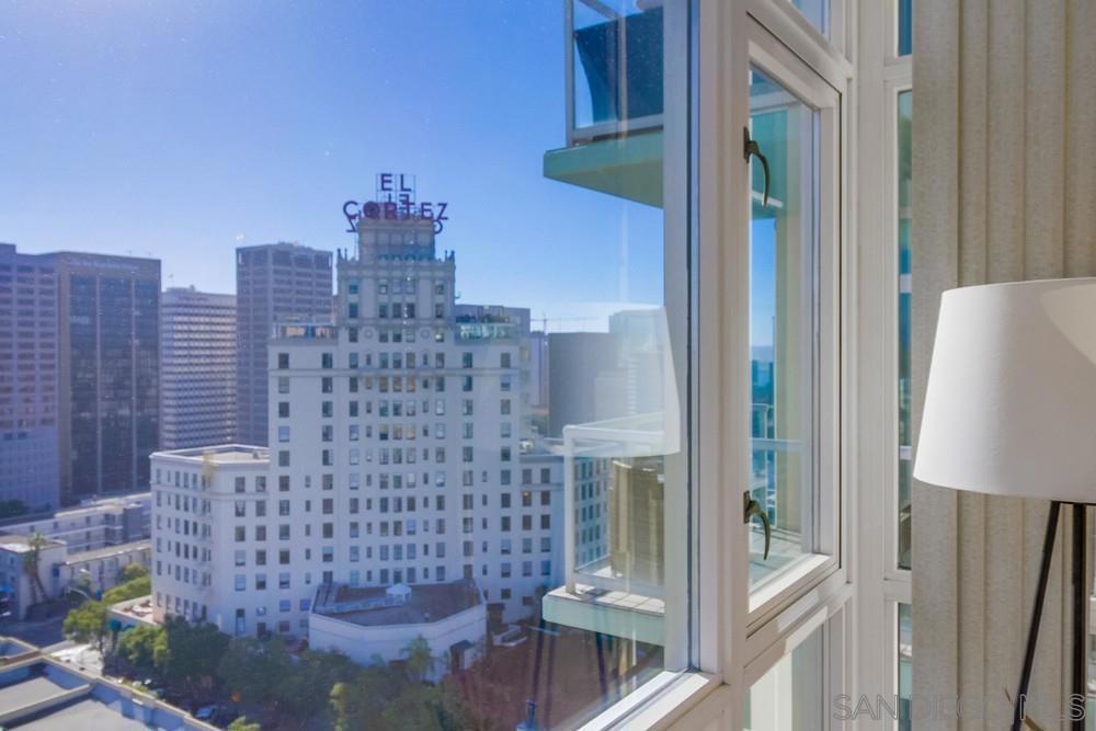 Stunning views from this beautiful and furnished 16th-floor residence in the desirable and quiet location of Downtown San Diego. Located in the prime Discovery building in Cortez Hills, this unit features abundant natural light, an open floor plan, and several large windows to enjoy stunning views of the mountains, bay, and city. The spacious master bedroom features a dramatic glass wall from floor to ceiling with breathtaking views, a walk-in closet, and a large bathroom with a separate tub and walk-in shower. Special features come with this unit, such as a pantry off the kitchen, cozy fireplace in the living room, side-by-side washer/dryer, and amazing sunrise views most times of the year. This exceptional condo is located in the sought-after Cortez Hills neighborhood, offering a prime position with southern exposure and panoramic views of the mountains, Coronado Bridge, and the western skyline. The expansive floor plan offers abundant natural light and features a well-appointed kitchen with ample cabinets and a pantry, a cozy fireplace, and a large balcony ideal for taking in the sunrise and sunset. With a prime position near the elevator, this unit enjoys a refreshing cool breeze. Included are 1 parking space and additional storage. The Discovery building provides exceptional amenities, including a 24/7 concierge, a lap pool on the 10th floor with unparalleled views, a spa, BBQ area, cabanas, gym, sauna, business center, and a tropical courtyard.