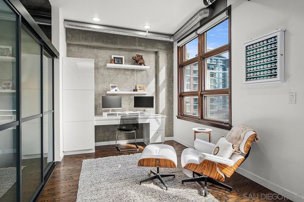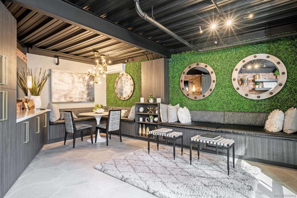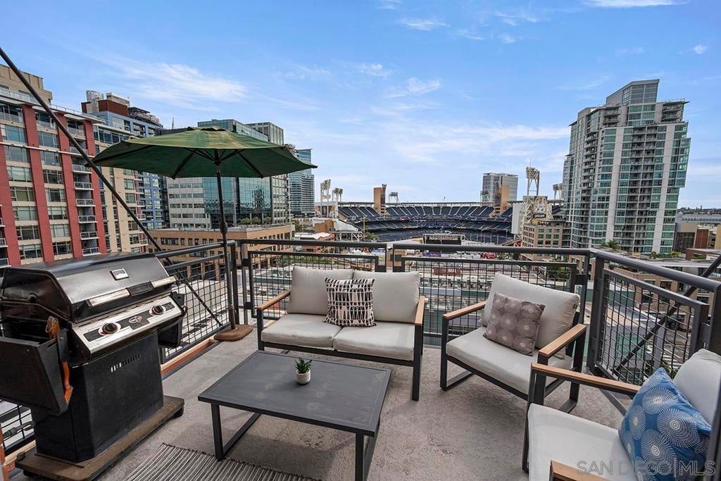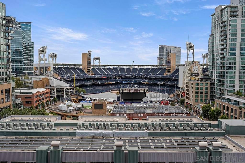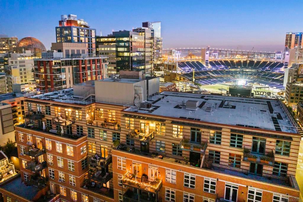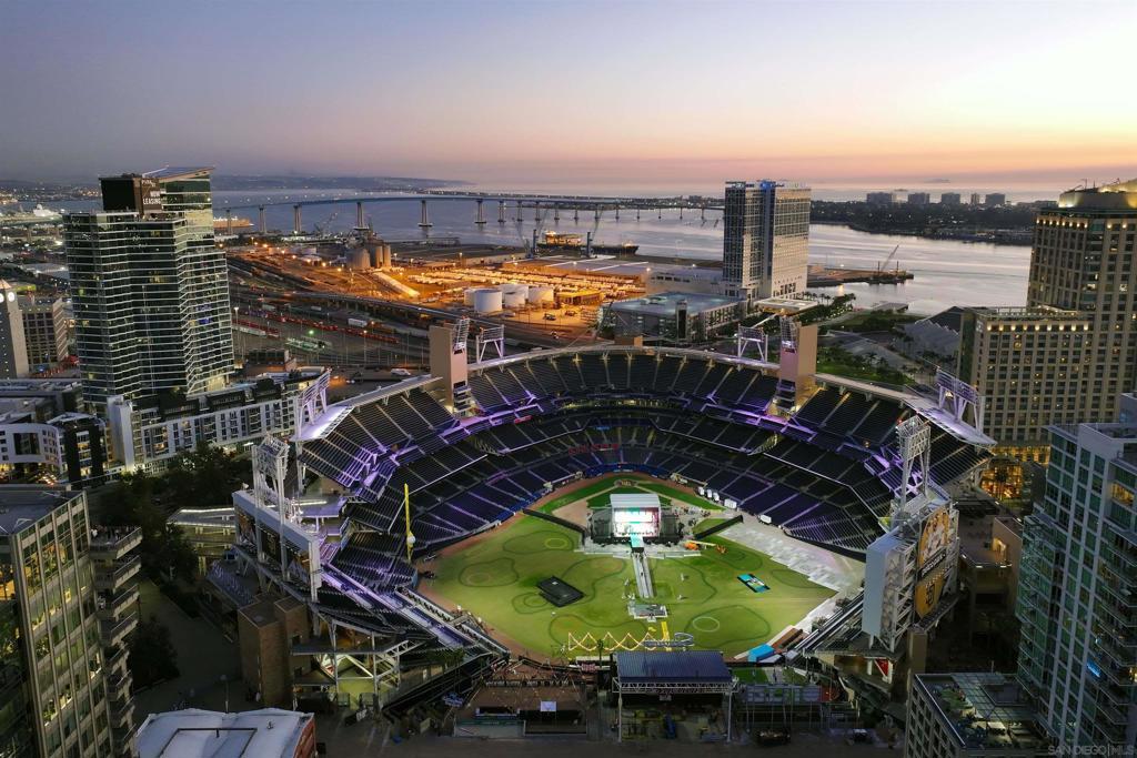 Stunning views of Petco Park grace every window in this chic one-bedroom, one-and-a-half-bathroom condo. It also benefits from 14ft vaulted ceilings that infuse the space with an open, airy vibe. Rental rate is for a minimum 6-month lease. Entertaining is easy here, and not just because of the in-unit viewpoint of Padres games, concerts and events, this space boasts a dining table with seating for six next to a built-in dry bar fully stocked with all the necessary tools and glassware, complete with a wine fridge. Alternate seating at the kitchen counter, and an oversized sofa in the living room in front of a sizeable Smart TV, add to the entertainment appeal in the stylish space. The plush L-shape sofa also doubles as a queen-size sleeper sofa, ideal for overnight guests who will also appreciate the nearby powder bathroom. The expansive bedroom suite features frosted sliding panels that can be positioned for complete privacy or left open to turn the condo into one large, open concept space. Within, the suite boasts a luxurious king-size bed, Smart TV, walk-in closet with abundant storage space, and a roomy bathroom with a dual sink vanity and an ultra-spacious walk-in shower. Those looking to work from home will love the office nook equipped with a large desk housing two computer monitors and benefiting from ample natural light from nearby floor-to-ceiling French doors. This condo is located within the Park Loft building in the heart of East Village. Park Loft is located across from Petco Park, home of Major Legue Baseball’s San Diego Padres, and host to everything from baseball games to concerts to special events. This locale puts it in close proximity to a multitude of tasty spots to grab a bite and brew, and shopping opportunities galore. The nearby Harbor Drive Pedestrian Bridge also provides easy access to the San Diego Convention Center, Seaport Village, The Embarcadero, and all that they have to offer. Amenities in this building include secure underground parking, contemporary lobby with concierge, and 24-hour security with surveillance cameras. It also offers an updated fitness center, lush central courtyard with abundant greenery throughout featuring multiple seating areas, fire pits, community grilling stations and a chic clubhouse with a full kitchen, large Smart TV and abundant seating.